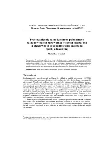 ZESZYTY NAUKOWE UNIWERSYTETU SZCZECIŃSKIEGO nr 757 Finanse, Rynki Finansowe, Ubezpieczenia nr 58 (2013) s. 57–67 Przekształcenie samodzielnych publicznych zakładów opieki zdrowotnej w spółki kapitałowe a efektywność gospodarowania zasobami opieki zdrowotnej Maria Hass-Symotiuk ∗ Streszczenie: W artykule przedstawiono istotę, rodzaje, procedury i organizację przekształcenia SPZOZ w spółki prawa handlowego. Wskazano przy tym na uczestników tego procesu (to jest organy tworzące oraz przekształcane zakłady) i ich rolę w sprawnym jego przebiegu, a także problemy wymagające rozwiązania, a mające wpływ na prawidłowość i rzetelność informacji finansowych generowanych w rachunkowości zarówno przekształcanych, jak i nowo powstałych podmiotów leczniczych w formie spółek kapitałowych. Słowa kluczowe: spółki prawa handlowego, podmiot leczniczy, informacje finansowe Wprowadzenie Funkcjonowanie samodzielnych publicznych zakładów opieki zdrowotnej (SPZOZ) w obecnej formule spowodowało ogromne ich zadłużenie, które destabilizuje system opieki zdrowotnej. Wielokrotnie podejmowane w przeszłości różnego rodzaju działania naprawcze, m.in oddłużanie, restrukturyzacja. zmierzały do poprawy funkcjonowania SPZOZ i racjonalizacji gospodarowania zasobami będącymi w ich dyspozycji. Nieefektywna, ułomna, forma prawna tych podmiotów, niewystarczające kwalifikacje kadr zarządzających, jak też ograniczona odpowiedzialność podmiotów tworzących za zobowiązania SPZOZ to główne przyczyny braku uzyskania oczekiwanych efektów. W tych warunkach uznano przekształcenie tych podmiotów w spółki kapitałowe za działanie pomocne w rozwiązaniu problemu ich zadłużenia oraz doskonaleniu zarządzania oraz służące poprawie efektywności wykorzystania posiadanych zasobów. Celem artykułu jest przedstawienie zasad i procedur przekształcenia SPZOZ w spółki kapitałowe oraz wymagające rozwiązania problemy związane z realizacja tego procesu. Jego realizacja wymagała dokonania krytycznej analizy literatury fachowej oraz obowiązujących regulacji prawnych w tym zakresie, a także obserwacji realiów jednostek opieki zdrowotnej. ∗ dr hab. Maria Hass-Symotiuk prof US, Uniwersytet Szczeciński, Instytut Rachunkowości, ul. A. Mickiewicza 64, 71–101 Szczecin, e-mail: [email protected]. 58 Maria Hass-Symotiuk 1. Istota i podstawy prawne przekształcenia SPZOZ Przekształcenie SPZOZ to zespół działań i przedsięwzięć podejmowanych przez organ tworzący lub organ dokonujący przekształcenia, przy udziale innych podmiotów i organów, realizowany zgodnie z określonymi zasadami i procedurami w którego efekcie SPZOZ uzyskuje status spółki kapitałowej (Dercz, Recz 2011: 109). W wyniku przekształcenia podmiot leczniczy niebędący przedsiębiorcą uzyskuje status przedsiębiorcy. Podstawowym aktem prawnym regulującym zasady tworzenia podmiotów prowadzących działalność leczniczą oraz określającym „losy” funkcjonujących SPZOZ (ich utrzymanie, łączenie, likwidację oraz przekształcania w spółki kapitałowe) jest Ustawa z 15 kwietnia 2011 roku o działalności leczniczej (Ustawa z 15 kwietnia 2011…). Ustawa ta obowiązuje od 1 lipca 2011 roku. Należy podkreślić, że pod „rządami” tej ustawy nie można tworzyć nowych podmiotów leczniczych w formie SPZOZ, z wyjątkiem powstałych w wyniku połączenia już istniejących zakładów. Perspektywy istnienia SPZOZ w obecnych realiach prawnych przedstawiono na rysunku 1. Samodzielne publiczne zakłady opieki zdrowotnej Funkcjonują nadal, jeżeli: – osiągają dodatni wynik finansowy lub gdy – ujemny wynik jest pokrywany przez organ tworzący Mogą być łączone bez postępowania likwidacyjnego podmiotu przejmowanego albo łączących się podmiotów Są przekształcane obligatoryjnie fakultatywnie gdy ujemny wynik finanso- na podstawie decyzji orgawy nie zostanie pokryty nu tworzącego przez organ założycielski albo likwidowane Rysunek 1. Perspektywy funkcjonowania SPZOZ Źródło: opracowanie własne. Zasady przekształcania SPZOZ określają artykuły 70–82 ustawy o działalności leczniczej oraz wydane do niej dwa rozporządzenia wykonawcze: – Rozporządzenie Ministra Skarbu Państwa z 22 grudnia 2011 r. w sprawie określenia wzoru kwestionariusza SPZOZ przeznaczonego do przekształcenia w spółkę kapitałową oraz wykazu niezbędnych dokumentów do sporządzenia aktu przekształcenia (Rozporządzenie Ministra Skarbu Państwa z 22 grudnia 2011a…), – Rozporządzenie Ministra Skarbu Państwa z 22 grudnia 2011 r. w sprawie określenia ramowego wzoru aktu przekształcenia SPZOZ w spółkę kapitałową. Przekształcenie to, stosownie do art. 69 ustawy o działalności leczniczej, może polegać na: – przekształceniu jednego SPZOZ w spółkę kapitałową, – przekształceniu kilku SPZOZ w jedną spółkę kapitałową pod warunkiem, że przekształcane jednostki mają ten sam podmiot tworzący, – przekształceniu kilku SPZOZ, mających różne podmioty tworzące, w jedną spółkę kapitałową (Rozporządzenie Ministra Skarbu Państwa z 22 grudnia 2011b…). Przekształcenie samodzielnych publicznych zakładów opieki zdrowotnej… 59 W tym ostatnim przypadku podmioty tworzące, będące jednostkami samorządu terytorialnego muszą zawrzeć stosowne porozumienie 1. Do porozumienia dołącza się projekt umowy (statut) spółki oraz projekt regulaminu organizacyjnego. Organy dokonujące przekształcenia SPZOZ w spółki kapitałowe zaprezentowano w tabeli 1. Tabela 1 Rodzaje organów dokonujących przekształcenia SPZOZ w spółki kapitałowe Rodzaj organu dokonującego przekształcenia Podmioty tworzące SPZOZ 1. Minister Skarbu Państwa 2. Organ wykonawczy jednostki samorządu terytorialnego 3. Rektor uczelni minister, centralny organ administracji rządowej jednostka samorządu terytorialnego (gminy, powiatu, województwa) publiczna uczelnia medyczna l