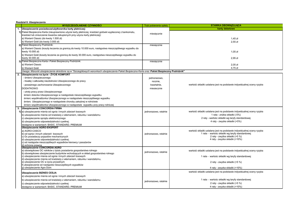 Rozdział 8. Ubezpieczenia WYSZCZEGÓLNIENIE CZYNNOŚCI Tryb pobierania opłaty 1. Ubezpieczenie posiadacza/użytkownika karty płatniczej: 1) Pakiet Bezpieczna Karta (nieuprawnione użycie karty płatniczej, kradzież gotówki wypłaconej z bankomatu, miesięcznie kradzież lub zniszczenie towarów zakupionych przy użyciu karty płatniczej): a) Wariant Classic (do kwoty 1.500 zł) b) Wariant Gold (do kwoty 3.000 zł) 2) Pakiet Bezpieczny Podróżnik: miesięcznie a) Wariant Classic (koszty leczenia za granicą do kwoty 10.000 euro, następstwa nieszczęśliwego wypadku do kwoty 10.000 zł) b) Wariant Gold (koszty leczenia za granicą do kwoty 30.000 euro, następstwa nieszczęśliwego wypadku do kwoty 30.000 zł) 3) Pakiet Bezpieczna Karta i Pakiet Bezpieczny Podróżnik: miesięcznie a) Wariant Classic b) Wariant Gold Uwaga: Warunki ubezpieczenia określone są w "Szczegółowych warunkach ubezpieczenia Pakiet Bezpieczna Karta oraz Pakiet Bezpieczny Podróżnik" 2. Ubezpieczenia na życie - ŻYCIE KOMFORT - śmierci Ubezpieczonego jednorazowo, - trwałej i całkowitej niezdolności Ubezpieczonego do pracy rocznie, - poważnego zachorowania Ubezpieczonego kwartalnie, DODATKOWO - utraty pracy przez Ubezpieczonego śmierc dziecka Ubezpieczonego w następstwie nieszczęśliwego wypadku śmierc współmałżonka Ubezpieczonego w następstwie nieszczęśliwego wypadku śmierc Ubezpieczonego w następstwie choroby zakaźnej w rolnictwie śmierc współmałżonka Ubezpieczonego w następstwie wypadku przy pracy rolniczej 3. Ubezpieczenie CONCORDIA FIRMA 1) a) ubezpieczenie mienia od ognia i innych zdarzeń losowych b) ubezpieczenie mienia od kradzieży z włamaniem, rabunku i wandalizmu c) ubezpieczenie sprzętu elektronicznego d) ubezpieczenie odpowiedzialności cywilnej. dostępne w wariantach: BASIC, STANDARD, PREMIUM Ubezpieczenie AGRO-EKSPERT a) AGRO-CASCO b) od ognia i innych zdarzeń losowych c) Oc posiadaczy pojazdów mechanicznych d) ubezpieczenie odpowiedzialności cywilnej. c) od następstw nieszczęśliwych wypadków kierowcy i pasażerów d) ochrona prawna Ubezpieczenie CONCORDIA AGRO a) obowiązkowe OC rolników z tytułu posiadania gospodarstwa rolnego b) obowiązkowe ubezpieczenie budynków wchodzących w skład gospodarstwa rolnego c) ubezpieczenie mienia od ognia i innych zdarzeń losowych d) ubezpieczenie mienia od kradzieży z włamaniem, rabunku i wandalizmu, e) ubezpieczenie OC w życiu prywatnym f) ubezpieczenie od następstw nieszczęśliwych wypadków g) ubezpieczenie Agro Dom c) ubezpieczenie odpowiedzialności cywilnej dostępne w wariantach: BASIC, STANDARD, PREMIUM 1,45 zł 2,55 zł 1,05 zł 2,95 zł 2,05 zł 4,75 zł wartość skladki ustalana jest na podstawie indywidualnej oceny ryzyka miesiecznie jednorazowo, ratalnie jednorazowo, ratalnie jednorazowo, ratalnie wartość skladki ustalana jest na podstawie indywidualnej oceny ryzyka 1 rata - zniżka składki (-5%) 2 raty - wartośc składki wg taryfy standardowej 4 raty - zwyzka składki (+5%) wartość skladki ustalana jest na podstawie indywidualnej oceny ryzyka 1 rata - wartośc składki wg taryfy standardowej 2 raty - zwyżka składki (+5 %) 4 raty - zwyzka składki (+10%) wartość skladki ustalana jest na podstawie indywidualnej oceny ryzyka 1 rata - wartośc składki wg taryfy standardowej 2 raty - zwyżka składki (+5 %) 4 raty - zwyzka składki (+10%) wartość skladki ustalana jest na podstawie indywidualnej oceny ryzyka Ubezpieczenie BIZNES CESJA a) ubezpieczenie mienia od ognia i innych zdarzeń losowych b) ubezpieczenie mienia od kradzieży z włamaniem, rabunku i wandalizmu STAWKA OBOWIĄZUJĄCA karty debetowe jednorazowo, ratalnie 1 rata - wartośc składki wg taryfy standardowej 2 raty - zwyżka składki (+5 %) 4 raty - zwyzka składki (+10%) Ubezpieczenia ASSISTANCE: PAKIET I: Dom Assistance, Auto Assistance z serwisem Concierge, Pomoc medyczna na terenie RP, Koszty leczenia i assistance podczas podróży zagranicznej (bez rozszerzenia o sporty amatorskie o podwyższonym ryzyku) - dostępny dla posiadaczy rachunków rozliczeniowych PAKIET II: Dom Assistance, Auto Assistance z serwisem Concierge, Pomoc medyczna na terenie RP - dostępny dla posiadaczy rachunków rozliczeniowych miesięcznie , rocznie miesięczna 0,97 zł/ roczna 11,11 zł miesięczna 0,77 zł/ roczna 8,71 zł