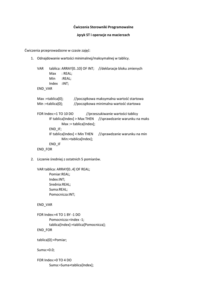 Ćwiczenia Sterowniki Programowalne Język ST i operacje na macierzach Ćwiczenia przeprowadzone w czasie zajęć: 1. Odnajdowanie wartości minimalnej/maksymalnej w tablicy. VAR tablica: ARRAY[0..10] OF INT; Max : REAL; Min :REAL; Index :INT; END_VAR Max :=tablica[0]; Min :=tablica[0]; //deklaracje bloku zmienych //początkowa maksymalna wartość startowa //początkowa minimalna wartość startowa FOR Index:=1 TO 10 DO //przeszukiwanie wartości tablicy IF tablica[Index] > Max THEN //sprawdzanie warunku na maks Max := tablica[Index]; END_IF; IF tablica[Index] < Min THEN //sprawdzanie warunku na min Min:=tablica[Index]; END_IF END_FOR 2. Liczenie średniej z ostatnich 5 pomiarów. VAR tablica: ARRAY[0..4] OF REAL; Pomiar:REAL; Index:INT; Srednia:REAL; Suma:REAL; Pomocnicza:INT; END_VAR FOR Index:=4 TO 1 BY -1 DO Pomocnicza:=Index -1; tablica[Index]:=tablica[Pomocnicza]; END_FOR tablica[0]:=Pomiar; Suma:=0.0; FOR Index:=0 TO 4 DO Suma:=Suma+tablica[Index]; END_FOR Srednia:= Suma/5.0; 3. Dodawanie macierzy. VAR Tablica: ARRAY[0..10,0..5] OF REAL; //deklaracje bloku zmienych Tablica2: ARRAY[0..10,0..5] OF REAL; Tablica3: ARRAY[0..10,0..5] OF REAL; Index :INT; Index2 :INT; END_VAR FOR Index:=0 TO 10 DO FOR Index2:=0 TO 5 DO Tablica3[Index][Index2] := Tablica1[Index][Index2]+ Tablica2[Index][Index2]; END_FOR END_FOR 4. Mnożenie macierzy. VAR Tablica: ARRAY[0..10,0..5] OF REAL; //deklaracje bloku zmienych Tablica2: ARRAY[0..5,0..10] OF REAL; Tablica3: ARRAY[0..10,0..10] OF REAL; Index :INT; Index2 :INT; Index3 :INT; END_VAR FOR Index:=0 TO 10 DO FOR Index2:=0 TO 10 DO Tablica3[Index][Index2]:=0.0; FOR Index3 :=0 TO 5 DO Tablica3[Index][Index2] := Tablica3[Index][Index2] + +Tablica1[Index][Index3]* Tablica2[Index3][Index2]; END_FOR END_FOR END_FOR Do zapamiętania: - Język ST nie obsługuje obliczeń w indeksach np. tab[index-1] Nie wszystkie sterowniki obsługują zmienne deklarowane w kodzie programu, wiele z nich, między innymi sterowniki GeFanuc wymagają wcześniej zadeklarowania wszystkich zmiennych i przydzielenia im pamięci w konfiguracji sterownika, łącznie ze zmiennymi indeksów w pętlach. Materiał pomocniczy http://www.industry.usa.siemens.com/drives/us/en/motion-control-systems-and-solutions/motioncontrol-products/motion-controllers/simotion-scout/se-tabs/Documents/MC-SIMOTION-STprogramming-manual.pdf (aktualne 13.1.2014)