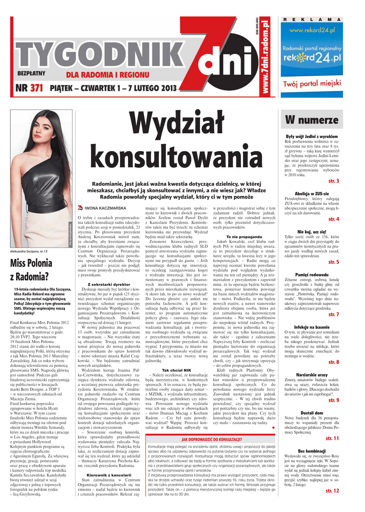 R Wydział konsultowania Radomianie, jest jakaś ważna kwestia dotycząca dzielnicy, w której mieszkasz, chciałbyś ją skonsultować z innymi, a nie wiesz jak? Władze Radomia powołały specjalny wydział, który ci w tym pomoże Fot. Iza Grzybowska IWONA KACZMARSKA Aleksandra Szczęsna, nr 13 Miss Polonia z Radomia? O trybie i zasadach przeprowadzania takich konsultacji radni zdecydowali podczas sesji w poniedziałek, 21 stycznia. Po głosowaniu prezydent Andrzej Kosztowniak mówił nam, że chciałby, aby kwestiami związanymi z konsultacjami zajmowało się Centrum Organizacji Pozarządowych. Nie wykluczał także powołania specjalnego wydziału. Decyzji – jak twierdził – jeszcze nie podjął; musi swoje pomysły przedyskutować z prawnikami. Z sekretarki dyrektor 19-letnia radomianka Ola Szczęsna, Miss Radia Rekord ma ogromne szanse, by zostać najpiękniejszą Polką! Zdecyduje o tym głosowanie SMS. Dlatego wspierajmy naszą kandydatkę! Finał Konkursu Miss Polonia 2012 odbędzie się w sobotę, 2 lutego. Będzie go transmitować o godz. 20.10 TVP2. Tego wieczoru 19 finalistek Miss Polonia 2012 stanie do walki o koronę najpiękniejszej Polki, którą otrzyma z rąk Miss Polonia 2011 Marceliny Zawadzkiej. Jak co roku wyboru dokonają telewidzowie za pomocą głosowania SMS. Nagrodą główną jest samochód. Podczas gali finałowej uczestniczki zaprezentują się publiczności w kreacjach marki Betti Designe, a TOP 5 – w wieczorowych sukniach od Macieja Zienia. Finał konkursu poprzedza zgrupowanie w hotelu Hyatt w Warszawie. W tym czasie finalistki Miss Polonia codziennie odbywają treningi na siłowni pod okiem trenera Witolda Szmandy, który na co dzień mieszka i pracuje w Los Angeles, gdzie trenuje z gwiazdami Hollywood. Kolejnym punktem programu są zajęcia choreograficzne z Agustinem Egurolą. Za właściwą prezencję, grację, poruszanie oraz pracę z obiektywem aparatu i kamery odpowiada top modelka Kamila Szczawińska. Kandydatki biorą również udział w sesji zdjęciowej z jedną z topowych fotografek na polskim rynku – Izą Grzybowską. Dyskusje musiały być krótkie i konstruktywne, bo już w piątek (25 stycznia) prezydent wydał zarządzenie zatwierdzające schemat organizacyjny nowego Wydziału Współpracy z Organizacjami Pozarządowymi i Konsultacji Społecznych. Działalność rozpoczyna od dzisiaj (1 lutego). W nowej jednostce ma pracować 13 osób, wszystkie już zatrudnione w magistracie. – Nie wszystkie etaty są obsadzone. Trwają rozmowy na temat przejścia do nowej jednostki z pracownikami do spraw kontroli – mówi sekretarz miasta Rafał Czajkowski. – Nie będziemy zatrudniać nowych urzędników, Wydziałem kieruje Joanna Pałka-Czerwińska, dotychczasowy zastępca dyrektora wydziału zdrowia, a wcześniej pierwsza sekretarka prezydenta Kosztowniaka. W strukturze jednostki znalazło się Centrum Organizacji Pozarządowych, które od swojego powstania podlegało wydziałowi zdrowia, referat zajmujący się konsultacjami społecznymi oraz wieloosobowe stanowisko do spraw kontroli dotacji udzielanych organizacjom i stowarzyszeniom. – Stworzenie osobnej komórki, która sprawdzałaby prawidłowość wydawania pieniędzy zalecała Najwyższa Izba Kontroli. Praktyka była taka, że rozliczaniem dotacji zajmował się ten wydział, który jej udzielał – tłumaczy Katarzyna Piechota-Kaim, rzecznik prezydenta Radomia. Kierownik z kancelarii Stan zatrudnienia w Centrum Organizacji Pozarządowych się nie zmienia – nadal będzie to kierownik i czterech pracowników. Referat zaj- mujący się konsultacjami społecznymi to kierownik i dwóch pracowników. Szefem został Paweł Dycht z Kancelarii Prezydenta. Kontrolerów także ma być trzech; tu schemat kierownika nie przewiduje. Wydział będzie miał także sekretarkę. Zenonowi Krawczykowi, przewodniczącemu klubu radnych SLD pomysł utworzenia wydziału zajmującego się konsultacjami społecznymi nie przypadł do gustu. – Jeśli konsultacje dotyczą np. inwestycji, to oczekuję zaangażowania kogoś z wydziału inwestycji, kto jest zorientowany w prawnych i finansowych możliwościach proponowanych przez mieszkańców rozwiązań. A skoro tak, to po co nowy wydział? Do liczenia głosów czy ankiet nie potrzeba fachowców. A jeśli konsultacje będą odbywać się przez Internet, to program automatycznie policzy głosy – zauważa. Jego zdaniem zarówno regulamin przeprowadzania konsultacji, jak i tworzenie osobnego wydziału są związane z przyszłorocznymi wyborami samorządowymi, które prezydent chce wygrać. I przypomina, że miasto nie tak dawno zlikwidowało wydział infrastruktury, a teraz tworzy nową jednostkę. Tak chciał NIK – Należy oczekiwać, że konsultacje będą merytoryczne, w konkretnych sprawach. A to oznacza, że będą potrzebne osoby znające dany temat – z MZDiK, z wydziału infrastruktury, budżetowego, architektury czy zdrowia. Powstanie nowego wydziału więc ich nie odciąży w obowiązkach – mówi Damian Maciąg z Kocham Radom. – Czy był sens powoływać wydział? Wątpię. Przecież konsultacje w Radomiu odbywały się w przeszłości i magistrat sobie z tym zadaniem radził. Dobrze jednak, że prezydent nie zatrudnił nowych osób, tylko przeniósł dotychczasowych pracowników. E K L A M A W numerze Były wójt Jedlni z wyrokiem Rok pozbawienia wolności w zawieszeniu na trzy lata oraz 8 tys. zł grzywny – taką karę wymierzył sąd byłemu wójtowi Jedlni-Letnisko oraz jego zastępczyni, uznając, że przekroczyli uprawnienia przy rejestrowaniu wyborców w 2010 roku. str. 3 Abolicja w ZUS-sie Przedsiębiorcy, którzy zalegają ZUS-owi ze składkami na własne ubezpieczenie społeczne, mogą liczyć na ich darowanie. str. 4 Nie kuj, ucz się! To nie propaganda Jakub Kowalski, szef klubu radnych PiS w radzie miejskiej uważa, że to prezydent decyduje o strukturze urzędu, ta kwestia leży w jego kompetencjach. – Radni mogą c