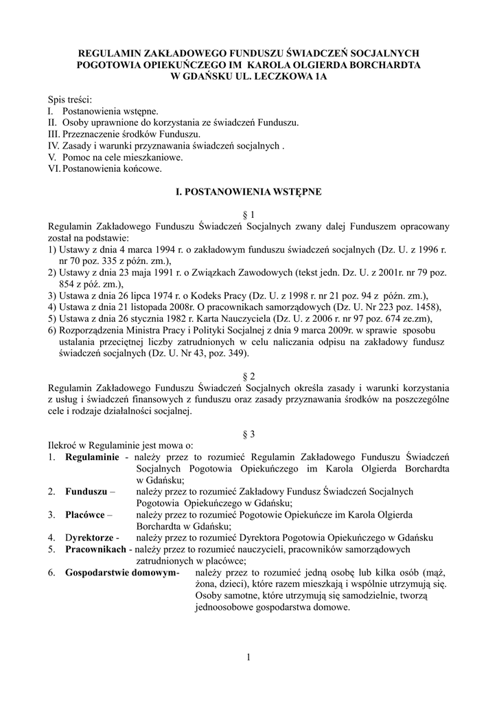 REGULAMIN ZAKŁADOWEGO FUNDUSZU ŚWIADCZEŃ SOCJALNYCH POGOTOWIA OPIEKUŃCZEGO IM KAROLA OLGIERDA BORCHARDTA W GDAŃSKU UL. LECZKOWA 1A Spis treści: I. Postanowienia wstępne. II. Osoby uprawnione do korzystania ze świadczeń Funduszu. III. Przeznaczenie środków Funduszu. IV. Zasady i warunki przyznawania świadczeń socjalnych . V. Pomoc na cele mieszkaniowe. VI. Postanowienia końcowe. I. POSTANOWIENIA WSTĘPNE §1 Regulamin Zakładowego Funduszu Świadczeń Socjalnych zwany dalej Funduszem opracowany został na podstawie: 1) Ustawy z dnia 4 marca 1994 r. o zakładowym funduszu świadczeń socjalnych (Dz. U. z 1996 r. nr 70 poz. 335 z późn. zm.), 2) Ustawy z dnia 23 maja 1991 r. o Związkach Zawodowych (tekst jedn. Dz. U. z 2001r. nr 79 poz. 854 z póź. zm.), 3) Ustawa z dnia 26 lipca 1974 r. o Kodeks Pracy (Dz. U. z 1998 r. nr 21 poz. 94 z późn. zm.), 4) Ustawa z dnia 21 listopada 2008r. O pracownikach samorządowych (Dz. U. Nr 223 poz. 1458), 5) Ustawa z dnia 26 stycznia 1982 r. Karta Nauczyciela (Dz. U. z 2006 r. nr 97 poz. 674 ze.zm), 6) Rozporządzenia Ministra Pracy i Polityki Socjalnej z dnia 9 marca 2009r. w sprawie sposobu ustalania przeciętnej liczby zatrudnionych w celu naliczania odpisu na zakładowy fundusz świadczeń socjalnych (Dz. U. Nr 43, poz. 349). §2 Regulamin Zakładowego Funduszu Świadczeń Socjalnych określa zasady i warunki korzystania z usług i świadczeń finansowych z funduszu oraz zasady przyznawania środków na poszczególne cele i rodzaje działalności socjalnej. §3 Ilekroć w Regulaminie jest mowa o: 1. Regulaminie - należy przez to rozumieć Regulamin Zakładowego Funduszu Świadczeń Socjalnych Pogotowia Opiekuńczego im Karola Olgierda Borchardta w Gdańsku; 2. Funduszu – należy przez to rozumieć Zakładowy Fundusz Świadczeń Socjalnych Pogotowia Opiekuńczego w Gdańsku; 3. Placówce – należy przez to rozumieć Pogotowie Opiekuńcze im Karola Olgierda Borchardta w Gdańsku; 4. Dyrektorze należy przez to rozumieć Dyrektora Pogotowia Opiekuńczego w Gdańsku 5. Pracownikach - należy przez to rozumieć nauczycieli, pracowników samorządowych zatrudnionych w placówce; 6. Gospodarstwie domowymnależy przez to rozumieć jedną osobę lub kilka osób (mąż, żona, dzieci), które razem mieszkają i wspólnie utrzymują się. Osoby samotne, które utrzymują się samodzielnie, tworzą jednoosobowe gospodarstwa domowe. 1 §4 1.Fundusz tworzy się z corocznego odpisu podstawowego naliczonego w stosunku do przeciętnej liczby zatrudnionych pracowników. 2.Wysokość odpisu podstawowego o którym mowa w ust. 1 wynosi: a) dla pracowników samorządowych - na jednego zatrudnionego 37,5% przeciętnego wynagrodzenia miesięcznego w gospodarce narodowej w roku poprzednim lub w drugim półroczu roku poprzedniego, jeżeli przeciętne wynagrodzenie z tego okresu stanowiło kwotę wyższą, b) dla pracowników pedagogicznych zatrudnionych w oparciu o ustawę Karta Nauczyciela zgodnie z art. 53 ust.1 Karta Nauczyciela - jako iloczyn planowanej, przeciętnej w danym roku kalendarzowym, liczby nauczycieli zatrudnionych w pełnym i niepełnym wymiarze zajęć (po przeliczeniu na pełny wymiar zajęć) skorygowanej w końcu roku do faktycznej przeciętnej liczby zatrudnionych nauczycieli (po przeliczeniu na pełny wymiar zajęć) i 110 % kwoty bazowej, c) dla nauczycieli rencistów i emerytów tworzy się odpis w wysokości 5 % pobieranych przez nich rent i emerytur (Art. 53 ust.2 Karta Nauczyciela). 3.Wysokość odpisu podstawowego o którym mowa w ust. 2 pkt. c ustala się na podstawie aktualizowanej corocznie przez emerytów i rencistów informacji o wysokości pobieranych przez nich świadczeń w formie kserokopii decyzji ZUS o przyznaniu emerytury lub renty, składanych do 30 kwietnia każdego roku. 4. Dla emerytów i rencistów niebędących nauczycielami tworzy się odpis w wysokości 6,25 % podstawy naliczenia na osobę ( Art. 5 ust.5 Ustawy o ZFŚS). §5 1. W Pogotowiu Opiekuńczym istnieje jeden niepodzielny Fundusz, administrowany przez Dyrektora. 2. Decyzje w sprawie przyznania świadczenia z ZFŚS wymagają uzgodnienia ze związkami zawodowymi (w przypadku braku organizacji związkowej rolę taką spełnia wybrany przedstawiciel pracowników). 3. Gospodarowanie środkami ZFŚS odbywa się w porozumieniu z Komisją Socjalną zwaną dalej Komisją. 4. Podstawą gospodarowania środkami ZFŚS stanowi roczny preliminarz określający podział tych środków na poszczególne cele, rodzaje i formy działalności socjalnej, organizowanej przez placówkę na rzecz osób uprawnionych do korzystania z ZFŚS uzgodniony ze związkami ze związkami zawodowymi. 5. Środki finansowe Funduszu gromadzone są na odrębnym rachunku bankowym. 6. Środki finansowe nie wykorzystane w danym roku kalendarzowym przechodzą na rok następny. §6 1. Wyboru członków Komisji Socjalnej dokonuje się podczas zebrania pracowników, wybierani są na tym zebraniu przez Dyrektora PO. 2. W skład Komisji wchodzą: a) Przewodniczący Komisji Socjalnej; b) Członkowie Komisji Socjalnej (w tym przedstawiciele związków zawodowych). 3. Kadencja Komisji trwa dwa lata, a pracą Komisji kieruje przewodniczący wybrany przez pracowników na zebraniu, zatwierdzony przez Dyrektora. Nie wyklucza się powołania tych samych osób na kolejne lata. 4. W przypadku zmian kadrowych w placówce Dyrektor uzupełnia skład Komisji. 5. Komisja Socjalna zobowiązana jest do: a) corocznego przygotowania preliminarza; b) opiniowania wniosków o udzielenie pomocy z Funduszu; c) informowania związków zawodowych o rozpatrywanych wnioskach; d) organizowania pomocy socjalnej dla osób uprawnionych do korzystania z Funduszu; 2 e) sporządzania protokołów z posiedzeń; f) prowadzenia ewidencji świadczeń indywidualnie dla każdego uprawnionego; g) złożenia sprawozdania ze swojej działalności na koniec kadencji ogółowi pracowników na zebraniu; 6. Komisja uprawniona jest do przeprowa