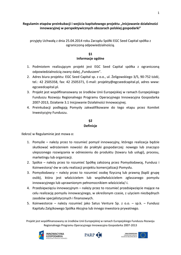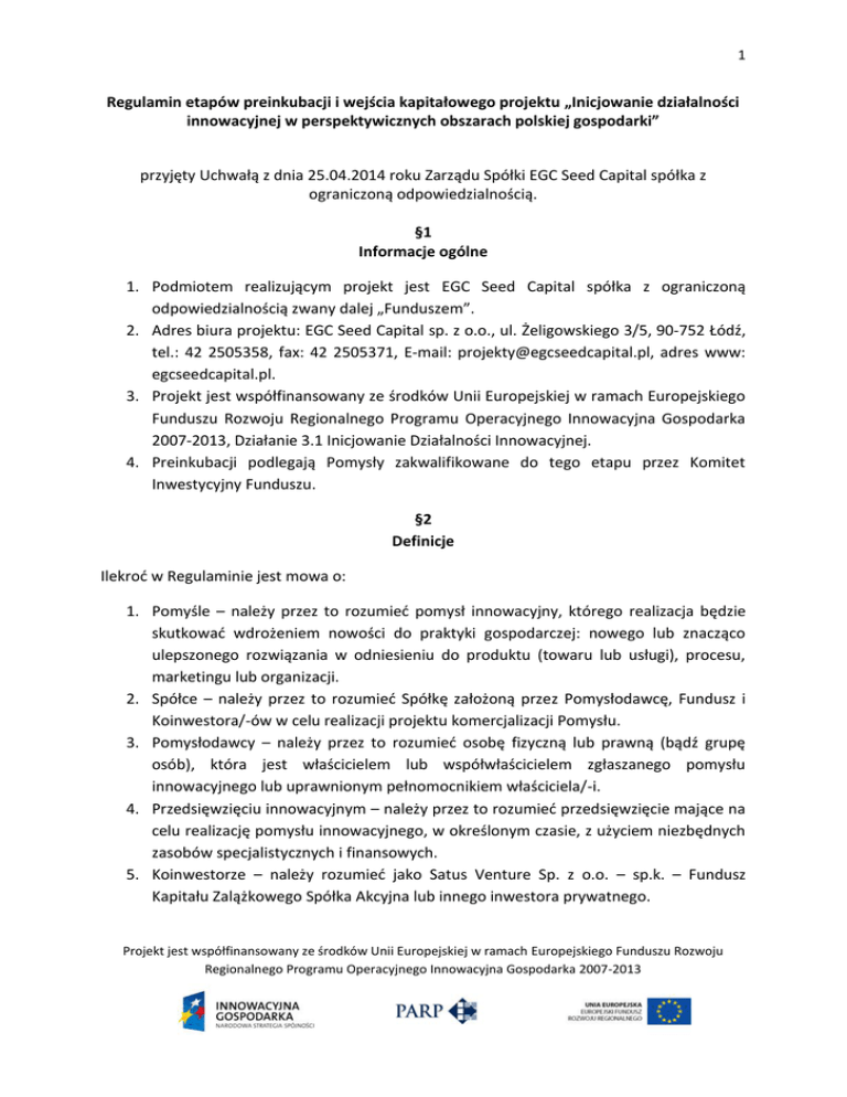 1 Regulamin etapów preinkubacji i wejścia kapitałowego projektu „Inicjowanie działalności innowacyjnej w perspektywicznych obszarach polskiej gospodarki” przyjęty Uchwałą z dnia 25.04.2014 roku Zarządu Spółki EGC Seed Capital spółka z ograniczoną odpowiedzialnością. §1 Informacje ogólne 1. Podmiotem realizującym projekt jest EGC Seed Capital spółka z ograniczoną odpowiedzialnością zwany dalej „Funduszem”. 2. Adres biura projektu: EGC Seed Capital sp. z o.o., ul. Żeligowskiego 3/5, 90-752 Łódź, tel.: 42 2505358, fax: 42 2505371, E-mail: [email protected], adres www: egcseedcapital.pl. 3. Projekt jest współfinansowany ze środków Unii Europejskiej w ramach Europejskiego Funduszu Rozwoju Regionalnego Programu Operacyjnego Innowacyjna Gospodarka 2007-2013, Działanie 3.1 Inicjowanie Działalności Innowacyjnej. 4. Preinkubacji podlegają Pomysły zakwalifikowane do tego etapu przez Komitet Inwestycyjny Funduszu. §2 Definicje Ilekroć w Regulaminie jest mowa o: 1. Pomyśle – należy przez to rozumieć pomysł innowacyjny, którego realizacja będzie skutkować wdrożeniem nowości do praktyki gospodarczej: nowego lub znacząco ulepszonego rozwiązania w odniesieniu do produktu (towaru lub usługi), procesu, marketingu lub organizacji. 2. Spółce – należy przez to rozumieć Spółkę założoną przez Pomysłodawcę, Fundusz i Koinwestora/-ów w celu realizacji projektu komercjalizacji Pomysłu. 3. Pomysłodawcy – należy przez to rozumieć osobę fizyczną lub prawną (bądź grupę osób), która jest właścicielem lub współwłaścicielem zgłaszanego pomysłu innowacyjnego lub uprawnionym pełnomocnikiem właściciela/-i. 4. Przedsięwzięciu innowacyjnym – należy przez to rozumieć przedsięwzięcie mające na celu realizację pomysłu innowacyjnego, w określonym czasie, z użyciem niezbędnych zasobów specjalistycznych i finansowych. 5. Koinwestorze – należy rozumieć jako Satus Venture Sp. z o.o. – sp.k. – Fundusz Kapitału Zalążkowego Spółka Akcyjna lub innego inwestora prywatnego. Projekt jest współfinansowany ze środków Unii Europejskiej w ramach Europejskiego Funduszu Rozwoju Regionalnego Programu Operacyjnego Innowacyjna Gospodarka 2007-2013 2 6. Komitecie Inwestycyjnym (KI) – należy przez to rozumieć czteroosobowy Komitet Inwestycyjny powołany przez Fundusz oraz Satus Venture Sp. z o.o. – sp.k. – Fundusz Kapitału Zalążkowego Spółka Akcyjna. 7. Przewodniczącym - należy przez to rozumieć osobę będącą Członkiem KI powołaną na Przewodniczącego z ramienia Funduszu. 8. Etapie Preinkubacji – należy przez to rozumieć pierwszy etap wspierania przez Fundusz innowacyjnych przedsięwzięć. Na tym etapie Fundusz zaoferuje wstępnie wyselekcjonowanym pomysłodawcom szeroki wachlarz usług doradczych (m. in. badania techniczne, analizy rynku, opracowanie biznesplanu etc.). 9. Formularzu Zgłoszeniowym – należy przez to rozumieć kwestionariusz, którego wypełnienie przez Pomysłodawcę będzie warunkiem przyjęcia Pomysłu do oceny. 10. Wykonalności technologicznej pomysłu – należy przez to rozumieć ocenę możliwości wdrożenia pomysłu pod względem technicznym i/lub technologicznym. 11. Wstępnym biznesplanie (WBP) – należy przez to rozumieć uproszczony biznesplan bazujący na ocenie Wykonalności technologicznej pomysłu oraz prognozach pomysłodawcy wstępnie zweryfikowanych przez analityka. 12. Warunkowej Umowie Inwestycyjnej (WUI) – należy przez to rozumieć promesę umowy inwestycyjnej, której realizacja uzależniona jest od efektów weryfikacji deklaracji pomysłodawcy w III fazie etapu Preinkubacji. Zawiera ona strukturę kapitałową przyszłego podmiotu. 13. Umowie Inwestycyjnej (UI) – należy przez to rozumieć umowę inwestycyjną, sankcjonującą powstanie nowego podmiotu gospodarczego powołanego wspólnie przez Fundusz i Pomysłodawcę i opcjonalnie Koinwestora. Jego forma prawna oraz struktura własnościowa zostały określone w Warunkowej Umowie Inwestycyjnej. 14. Umowa Preinkubacji – należy przez to rozumieć umowę określającą warunki Preinkubacji podpisywaną bezpośrednio przed pierwszym etapem Preinkubacji. §3 Głosowanie Komitetu Inwestycyjnego 1. Komitet Inwestycyjny zatwierdza uchwały większością głosów. W przypadku równej liczby głosów decyduje głos oddany przez Przewodniczącego. 2. Członkowie Komitetu Inwestycyjnego mogą brać udział w podejmowaniu uchwał KI, oddając swój głos przy wykorzystaniu środków bezpośredniego porozumiewania się na odległość. KI podejmuje uchwały przy wykorzystaniu środków bezpośredniego porozumiewania się na odległość w ten sposób, iż każdy z biorących udział w głosowaniu Członków KI oddaje głos przesyłając wiadomość za pośrednictwem poczty elektronicznej na adres wskazany przez Przewodniczącego lub faksem na wskazany Projekt jest współfinansowany ze środków Unii Europejskiej w ramach Europejskiego Funduszu Rozwoju Regionalnego Programu Operacyjnego Innowacyjna Gospodarka 2007-2013 3 numer, załączając do wiadomości projekt uchwały poddanej pod głosowanie i zaznaczając w treści wiadomości jednoznacznie, czy głosuje za czy przeciw uchwale. 3. Uchwały podjęte w tym trybie wraz ze wskazaniem sposobu głosowania zostają przedstawione na najbliższym posiedzeniu KI i w formie załącznika dołączane są do protokołu z tego posiedzenia oraz podpisywane przez wszystkich obecnych na posiedzeniu Członków KI, którzy brali udział w podejmowaniu uchwały, chyba że zostały podpisane wcześniej. Głosy oddane pocztą elektroniczną lub faksem oraz pozostała korespondencja dokumentująca przebieg głosowania dołączane są do tego protokołu; materiały elektroniczne załączane są w formie wydruków. §4 Etap Preinkubacji 1. Etap Preinkubacji składa się z trzech faz. Na zakończenie każdej z trzech faz dokonywana jest ocena Pomysłów, która będzie p