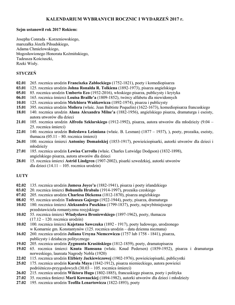 KALENDARIUM WYBRANYCH ROCZNIC I WYDARZEŃ 2017 r. Sejm ustanowił rok 2017 Rokiem: Josepha Conrada - Korzeniowskiego, marszałka Józefa Piłsudskiego, Adama Chmielowskiego, błogosławionego Honorata Koźmińskiego, Tadeusza Kościuszki, Rzeki Wisły. STYCZEŃ 02.01 03.01 05.01 06.01 10.01 15.01 18.01 21.01 22.01 26.01 27.01 28.01 265. rocznica urodzin Franciszka Zabłockiego (1752-1821), poety i komediopisarza 125. rocznica urodzin Johna Ronalda R. Tolkiena (1892-1973), pisarza angielskiego 85. rocznica urodzin Umberto Eco (1932-2016), włoskiego pisarza, publicysty i krytyka 165. rocznica śmierci Louisa Braille’a (1809-1852), twórcy alfabetu dla niewidomych 125. rocznica urodzin Melchiora Wańkowicza (1892-1974), pisarza i publicysty 395. rocznica urodzin Moliera (właśc. Jean Babtiste Poquelin) (1622-1673), komediopisarza francuskiego 140. rocznica urodzin Alana Alexandra Milne’a (1882-1956), angielskiego pisarza, dramaturga i eseisty, autora utworów dla dzieci 105. rocznica urodzin Alfreda Szklarskiego (1912-1992), pisarza, autora utworów dla młodzieży (9.04 – 25. rocznica śmierci) 140. rocznica urodzin Bolesława Leśmiana (właśc. B. Lesman) (1877 – 1937), ), poety, prozaika, eseisty, tłumacza (05.11 – 80. rocznica śmierci) 100. rocznica śmierci Antoniny Domańskiej (1853-1917), powieściopisarki, autorki utworów dla dzieci i młodzieży 185. rocznica urodzin Lewisa Carrolla (właśc. Charles Lutwidge Dodgson) (1832-1898), angielskiego pisarza, autora utworów dla dzieci 15. rocznica śmierci Astrid Lindgren (1907-2002), pisarki szwedzkiej, autorki utworów dla dzieci (14.11 – 105. rocznica urodzin) LUTY 02.02 03.02 07.02 08.02 10.02 10.02 10.02 16.02 19.02 19.02 22.02 25.02 26.02 27.02 27.02 135. rocznica urodzin Jamesa Joyce’a (1882-1941), pisarza i poety irlandzkiego 20. rocznica śmierci Bohumila Hrabala (1914-1997), prozaika czeskiego 205. rocznica urodzin Charlesa Dickensa (1812-1870), pisarza angielskiego 95. rocznica urodzin Tadeusza Gajcego (1922-1944), poety, pisarza, dramaturga 180. rocznica śmierci Aleksandra Puszkina (1799-1837), poety, najwybitniejszego przedstawiciela romantyzmu rosyjskiego 55. rocznica śmierci Władysława Broniewskiego (1897-1962), poety, tłumacza (17.12 – 120. rocznica urodzin) 100. rocznica śmierci Kajetana Sawczuka (1892 - 1917), poety ludowego, urodzonego w Komarnie gm. Konstantynów (125. rocznica urodzin – data dzienna nieznana) 260. rocznica urodzin Juliana Ursyna Niemcewicza (1757 lub 1758 - 1841), pisarza, publicysty i działacza politycznego 205. rocznica urodzin Zygmunta Krasińskiego (1812-1859), poety, dramatopisarza 65. rocznica śmierci Knuta Hamsuna (właśc. Knud Pedersen) (1859-1952), pisarza i dramaturga norweskiego, laureata Nagrody Nobla (1920) 115. rocznica urodzin Elżbiety Jackiewiczowej (1902-1976), powieściopisarki, publicystki 175. rocznica urodzin Karola Maya (1842-1912), pisarza niemieckiego, autora powieści podróżniczo-przygodowych (30.03 – 105. rocznica śmierci) 215. rocznica urodzin Wiktora Hugo (1802-1885), francuskiego pisarza, poety i polityka 35. rocznica śmierci Marii Kownackiej (1894-1982), autorki utworów dla dzieci i młodzieży 195. rocznica urodzin Teofila Lenartowicza (1822-1893), poety 27.02 115. rocznica urodzin Johna Steinbecka (1902-1968), amerykańskiego pisarza i reportera, laureata Nagrody Nobla (1962) 28.02 205. rocznica śmierci Hugona Kołłątaja (1750-1812), działacza i pisarza politycznego MARZEC 02.03 02.03 04.03 04.03 14.03 19.03 21.03 22.03 23.03 25.03 30.03 30.03 75. rocznica urodzin Marii Józefackiej (1942), poetki, autorki powieści dla młodzieży 75. rocznica urodzin Johna Irvinga (1942), amerykańskiego prozaika 85. rocznica urodzin Ryszarda Kapuścińskiego (1932-2007), dziennikarza, reportera, pisarza 165. rocznica śmierci Nikołaja Gogola (1809-1852), pisarza i dramaturga rosyjskiego 85. rocznica urodzin Jerzego Szczygła (1932-1983), prozaika, autora utworów dla młodzieży 130. rocznica śmierci Józefa Ignacego Kraszewskiego (1812-1887), powieściopisarza, publicysty (28.07 – 205. rocznica urodzin) 85. rocznica urodzin Andrzeja Bursy (1932-1957), poety i prozaika (15.11 – 60. rocznica śmierci) 185. rocznica śmierci Johanna Wolfganga Goethego (1749-1832), niemieckiego prozaika, poety, dramaturga 175. rocznica śmierci Stendhala (właśc. Henri Beyle) (1783-1842), pisarza francuskiego 85. rocznica urodzin Wiesława Myśliwskiego (1932), powieściopisarza 105. rocznica śmierci Karola Maya (1842-1912), pisarza niemieckiego, autora powieści podróżniczo-przygodowych (25.02 – 175. rocznica urodzin) 160. rocznica urodzin Gabrieli Zapolskiej (1857-1921), pisarki, komediopisarki, publicystki KWIECIEŃ 02.04 02.04 02.04 09.04 11.04 14.04 14.04 21.04 21.04 23.04 24.04 Międzynarodowy Dzień Książki Dziecięcej 85. rocznica urodzin Joanny Chmielewskiej (1932-2013), pisarki 65. rocznica śmierci Ferenca Molnára (1878-1952), pisarza węgierskiego 25. rocznica śmierci Alfreda Szklarskiego (1912-1992), pisarza, autora utworów dla młodzieży (21.01 – 105. rocznica urodzin) 30. rocznica śmierci Erskine’a Caldwella (1903-1987), pisarza amerykańskiego 100. rocznica śmierci Ludwika Łazarza Zamenhofa (1859-1917), twórcy języka międzynarodowego esperanto 75. rocznica urodzin Danuty Wawiłow (1942-1999), poetki, autorki utworów dla dzieci 35. rocznica śmierci Haliny Rudnickiej (1909-1982), pisarki, autorki utworów dla młodzieży 100. rocznica urodzin Miry Jaworczakowej (1917-2009), pisarki, autorki książek dla dzieci i młodzieży Światowy Dzień Książki i Praw Autorskich 75. rocznica śmierci Lucy Maud Montgomery (1874-1942), pisarki kanadyjskiej MAJ 07.05 150. rocznica urodzin Władysława Stanisława Reymonta (właśc. S. W. Rejment) (1867 -1925), powieściopisarza, nowelisty, laureata Nagrody Nobla (1924) 08 – 15 maja Tydzień Bibliotek 11.05 110. rocznica urodzin Lucyny Krzemienieckiej (1907-1955), poetki, auto