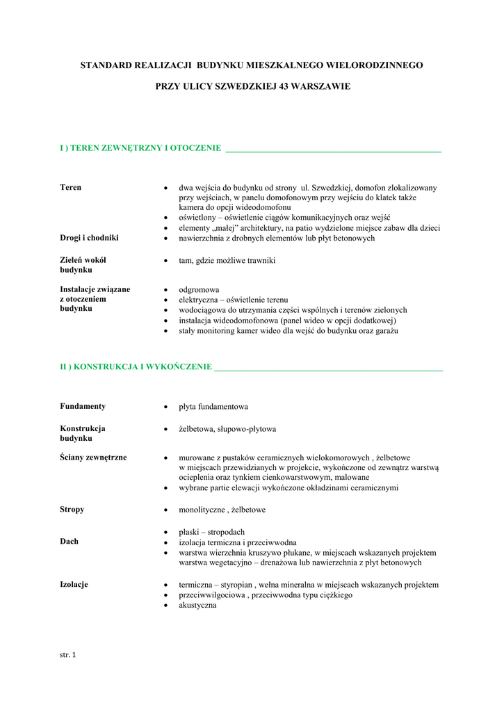 STANDARD REALIZACJI BUDYNKU MIESZKALNEGO WIELORODZINNEGO PRZY ULICY SZWEDZKIEJ 43 WARSZAWIE I ) TEREN ZEWNĘTRZNY I OTOCZENIE ___________________________________________________ Teren Drogi i chodniki dwa wejścia do budynku od strony ul. Szwedzkiej, domofon zlokalizowany przy wejściach, w panelu domofonowym przy wejściu do klatek także kamera do opcji wideodomofonu oświetlony – oświetlenie ciągów komunikacyjnych oraz wejść elementy „małej” architektury, na patio wydzielone miejsce zabaw dla dzieci nawierzchnia z drobnych elementów lub płyt betonowych Zieleń wokół budynku tam, gdzie możliwe trawniki Instalacje związane z otoczeniem budynku odgromowa elektryczna – oświetlenie terenu wodociągowa do utrzymania części wspólnych i terenów zielonych instalacja wideodomofonowa (panel wideo w opcji dodatkowej) stały monitoring kamer wideo dla wejść do budynku oraz garażu II ) KONSTRUKCJA I WYKOŃCZENIE ______________________________________________________ Fundamenty płyta fundamentowa Konstrukcja budynku żelbetowa, słupowo-płytowa Ściany zewnętrzne murowane z pustaków ceramicznych wielokomorowych , żelbetowe w miejscach przewidzianych w projekcie, wykończone od zewnątrz warstwą ocieplenia oraz tynkiem cienkowarstwowym, malowane wybrane partie elewacji wykończone okładzinami ceramicznymi Stropy monolityczne , żelbetowe Dach płaski – stropodach izolacja termiczna i przeciwwodna warstwa wierzchnia kruszywo płukane, w miejscach wskazanych projektem warstwa wegetacyjno – drenażowa lub nawierzchnia z płyt betonowych termiczna – styropian , wełna mineralna w miejscach wskazanych projektem przeciwwilgociowa , przeciwwodna typu ciężkiego akustyczna Izolacje str. 1 III ) MIESZKANIA ________________________________________________________________________ Wysokość kondygnacji wysokość od podkładu betonowego do wytynkowanego sufitu – 268 cm +/- 3 cm na kondygnacji 9 (8 piętrze) wysokość 300 cm +/- 3 cm Drzwi wejściowe drzwi typu La Porte, Gerda, Dierre z blokadami antywłamaniowymi typu C, pełne z okładziną drewnopodobną z zewnątrz lokalu i białą od wewnątrz, atestowane Ściany wewnętrzne konstrukcyjne żelbetowe monolityczne lub murowane międzylokalowe murowane z pustaków ceramicznych lub cegły silikatowej, akustyczne działowe murowane z cegły ceramicznej lub silikatowej, akustyczne w miejscach wskazanych projektem tynk gipsowy mechaniczny, zewnętrzne narożniki wzmocnione profilami systemowymi, jednokrotnie malowane w łazienkach - tynk gipsowy wykończony na ,,ostro” Sufity tynk gipsowy mechaniczny jednokrotnie malowany Posadzki wylewki cementowe, pływające na styropianie z dylatacją obwodową Okna i drzwi balkonowe okna PVC z nawietrzakami manualnymi, szklone szybami zespolonymi, skrzydła rozwierne z okuciami obwiedniowymi, w miejscach przewidzianych w projekcie skrzydła nieotwieralne ,,fix”. w każdym pomieszczeniu przynajmniej jedno skrzydło z dodatkową funkcją uchylania podwyższona izolacja akustyczna od ulicy Szwedzkiej Parapety wewnętrzne do montażu indywidualnego Klienta Drzwi wewnętrzne do montażu indywidualnego Klienta, otwory przygotowane do montażu ościeżnic i skrzydeł drzwiowych Kuchnie instalacja elektryczna - trójfazowa pod elektryczne płyty kuchenne instalacja lokalowa wodna i c.o. - podposadzkowa (rury z tworzywa sztucznego) wyprowadzone po jednym podejściu wodnym i kanalizacyjnym (trójnik na pionie) Łazienki Instalacja CO str. 2 bez urządzeń sanitarnych instalacja lokalowa wodna i c.o. - podposadzkowa (rury z tworzywa sztucznego) wyprowadzone po jednym podejścia wodnym i kanalizacyjnym (trójnik na pionie) indywidualne wodomierze mieszkaniowe zimnej i ciepłej wody dostęp do odczytu liczników bezpośrednio z klatki schodowej grzejniki płytowe z zaworami i głowicami termostatycznymi w łazienkach grzejniki drabinkowe, płytowe w miejscach wskazanych projektem instalacja lokalowa podposadzkowa (rury z tworzywa sztucznego) podłączenie do miejskiej sieci ciepłowniczej Instalacja wentylacyjna wentylacja mechaniczna w części budynku 9-o kondygnacyjnym wentylacja grawitacyjna w części budynku 5-o kondygnacyjnym w kuchni dodatkowy pion do podłączenia okapu kuchennego Instalacja elektryczna miedziana z osprzętem np. produkcji krajowej tablice mieszkaniowe natynkowe Inne instalacje gniazdo RTV/SAT w salonie (dostępny sygnał naziemnej telewizji cyfrowej) telefoniczna, odbiór sygnału po podpisaniu umowy z operatorem telekomunikacji wideodomofonowa (funkcja video aktywna po opcjonalnym dokupieniu panelu lokalowego) Balkony / Tarasy / Loggie okładziny gresowe mrozoodporne na balkonach i w loggiach na tarasach część powierzchni utwardzona płytami tarasowymi, część wykończona kruszywem płukanym balustrady zewnętrzne stalowe zabezpieczone antykorozyjnie, w miejscach przewidzianych w projekcie wypełnienie szkłem bezpiecznym, ażurowe metalowe lub pełne żelbetowe przegrody między łączącymi się balkonami pełne z laminatu, płyt HPL lub inne przegrody między tarasami ażurowe, na szerokości utwardzenia pełne IV ) GARAŻE _____________________________________________________________________________ Ściany, słupy ściany zewnętrzne żelbetowe ściany wewnętrzne murowane silikatowe i żelbetowe słupy żelbetowe Sufit oczyszczony żelbetowy, w miejscach wskazanych projektem wełna mineralna Posadzki płyta fundamentowa betonowa zacierana z wyznaczeniem i oznakowaniem miejsc parkingowych Drzwi stalowe według wymagań ppoż. (do pomieszczeń technicznych i klatek schodowych) Bramy wjazdowe otwierane automatycznie przy pomocy karty magnetycznej lub pilota jednodzielne (wjazd i wyjazd) Instalacje wentylacja mechaniczna wywiewna oraz oddymiająca elektryczna– oświetleniowa z oprawami kanalizacyjna wraz z odwodnieniem instalacja ppoż. str. 3 V ) KLATKI SCHODOWE __________________________________________________________________ Wejście do budynku w poz