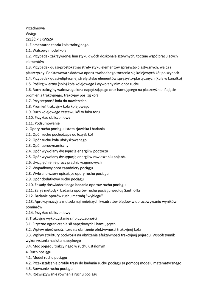 Przedmowa Wstęp CZĘŚĆ PIERWSZA 1. Elementarna teoria koła trakcyjnego 1.1. Walcowy model koła 1.2. Przypadek zakrzywionej linii styku dwóch doskonale sztywnych, tocznie współpracujących elementów 1.3. Przypadek quasi-prostokątnej strefy styku elementów sprężysto-plastycznych: walca i płaszczyzny. Podstawowa składowa oporu swobodnego toczenia się kolejowych kół po szynach 1.4. Przypadek quasi-eliptycznej strefy styku elementów sprężysto-plastycznych (kula w kanałku) 1.5. Poślizg wiertny (spin) koła kolejowego i wywołany nim opór ruchu 1.6. Ruch trakcyjny walcowego koła napędzającego oraz hamującego na płaszczyźnie. Pojęcie promienia trakcyjnego, trakcyjny poślizg koła 1.7. Przyczepność koła do nawierzchni 1.8. Promień trakcyjny koła kolejowego 1.9. Ruch kolejowego zestawu kół w łuku toru 1.10. Przykład obliczeniowy 1.11. Podsumowanie 2. Opory ruchu pociągu. Istota zjawiska i badania 2.1. Opór ruchu pochodzący od łożysk kół 2.2. Opór ruchu koła ułożyskowanego 2.3. Opór aerodynamiczny 2.4. Opór wywołany dyssypacją energii w podtorzu 2.5. Opór wywołany dyssypacją energii w zawieszeniu pojazdu 2.6. Uwzględnienie pracy prądnic wagonowych 2.7. Wypadkowy opór zasadniczy pociągu 2.8. Wybrane wzory opisujące opory ruchu pociągu 2.9. Opór dodatkowy ruchu pociągu 2.10. Zasady doświadczalnego badania oporów ruchu pociągu 2.11. Zarys metodyki badania oporów ruchu pociągu według Sauthoffa 2.12. Badanie oporów ruchu metodą "wybiegu" 2.13. Aproksymacyjna metoda najmniejszych kwadratów błędów w opracowywaniu wyników pomiarów 2.14. Przykład obliczeniowy 3. Trakcyjne wykorzystanie sił przyczepności 3.1. Fizyczne ograniczenia sił napędowych i hamujących 3.2. Wpływ nierówności toru na obniżenie efektywności trakcyjnej koła 3.3. Wpływ struktury podwozia na obniżenie efektywności trakcyjnej pojazdu. Współczynnik wykorzystania nacisku napędnego 3.4. Moc pojazdu trakcyjnego w ruchu ustalonym 4. Ruch pociągu 4.1. Model ruchu pociągu 4.2. Przekształcenie profilu trasy do badania ruchu pociągu za pomocą modelu matematycznego 4.3. Równanie ruchu pociągu 4.4. Rozwiązywanie równania ruchu pociągu 4.5. Charakterystyczne prędkości pociągu 4.6. Wyznaczanie mocy znamionowej pojazdu trakcyjnego 4.7. Wyznaczanie minimalnego nacisku napędnych zestawów kół pojazdu trakcyjnego na tor 4.8. Wykorzystanie równania ruchu pociągu (RRP) w zadaniach projektowych taboru trakcyjnego 4.9. Wykorzystanie równania ruchu pociągu (RRP) w planowaniu przewozów energooszczędnych 4.10. Praca jednostkowa członów napędowych pociągu CZĘŚĆ DRUGA 5. Pojazdy z elektrycznymi silnikami trakcyjnymi 5.1. Zasilanie pojazdów w energię elektryczną 5.2. Układy elektryczne pojazdów trakcyjnych do pracy w poszczególnych systemach zasilania 5.3. Zasady sterowania elektrycznych szeregowych trakcyjnych silników komutatorowych prądu stałego (DC) w lokomotywach 5.4. Pojęcie prądu ciągłego. Izolacja uzwojeń silników 5.5. Przewietrzanie silników 5.6. Zasady sterowania lokomotyw z asynchronicznymi silnikami prądu przemiennego (AC) 6. Projektowanie charakterystyki pojazdu szynowego z trakcyjnymi silnikami elektrycznymi 6.1. Przełożenie przekładni mechanicznej między silnikiem a osią napędnego zestawu pojazdu trakcyjnego 6.2. Dobór wartości przełożenia przekładni przy zastosowaniu trakcyjnych silników szeregowych prądu stałego 6.3. Dobór wartości przełożenia przekładni przy zastosowaniu trakcyjnych trójfazowych silników asynchronicznych prądu przemiennego 7. Pojazdy spalinowe z przekładnią elektryczną 7.1. Warianty strukturalne układu przetworników energii elektrycznej w trakcji spalinowej 7.2. Przekładnia elektryczna prąd stały - prąd stały (wariant I). Współpraca generatora prądu z elektrycznymi silnikami trakcyjnymi 7.3. Dobór wartości przełożenia przekładni mechanicznej 7.4. Przekładnia elektryczna prąd trójfazowy - prąd stały (wariant II). Współpraca generatora prądu z elektrycznymi silnikami trakcyjnymi prądu stałego sterowanymi impulsowo 7.5. Przekładnia elektryczna prąd trójfazowy - prąd trójfazowy (wariant III) 7.6. Przekładnia elektryczna prąd stały - prąd trójfazowy (wariant IV) Załącznik. Techniczno-eksploatacyjna charakterystyka lokomotyw Literatura