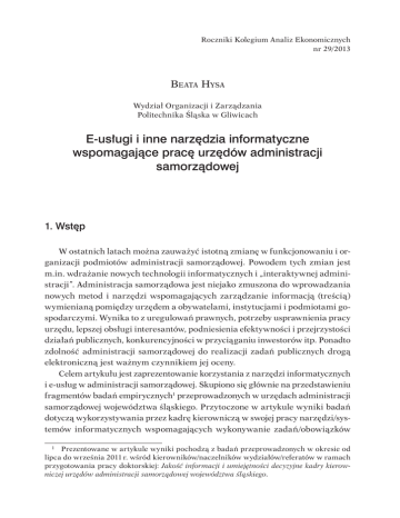 Roczniki Kolegium Analiz Ekonomicznych nr 29/2013 Beata Hysa Wydział Organizacji i Zarządzania Politechnika Śląska w Gliwicach E-usługi i inne narzędzia informatyczne wspomagające pracę urzędów administracji samorządowej 1. Wstęp W ostatnich latach można zauważyć istotną zmianę w funkcjonowaniu i organizacji podmiotów administracji samorządowej. Powodem tych zmian jest m.in. wdrażanie nowych technologii informatycznych i „interaktywnej administracji”. Administracja samorządowa jest niejako zmuszona do wprowadzania nowych metod i narzędzi wspomagających zarządzanie informacją (treścią) wymienianą pomiędzy urzędem a obywatelami, instytucjami i podmiotami gospodarczymi. Wynika to z uregulowań prawnych, potrzeby usprawnienia pracy urzędu, lepszej obsługi interesantów, podniesienia efektywności i przejrzystości działań publicznych, konkurencyjności w przyciąganiu inwestorów itp. Ponadto zdolność administracji samorządowej do realizacji zadań publicznych drogą elektroniczną jest ważnym czynnikiem jej oceny. Celem artykułu jest zaprezentowanie korzystania z narzędzi informatycznych i e-usług w administracji samorządowej. Skupiono się głównie na przedstawieniu fragmentów badań empirycznych1 przeprowadzonych w urzędach administracji samorządowej województwa śląskiego. Przytoczone w artykule wyniki badań dotyczą wykorzystywania przez kadrę kierowniczą w swojej pracy narzędzi/systemów informatycznych wspomagających wykonywanie zadań/obowiązków Prezentowane w artykule wyniki pochodzą z badań przeprowadzonych w okresie od lipca do września 2011 r. wśród kierowników/naczelników wydziałów/referatów w ramach przygotowania pracy doktorskiej: Jakość informacji i umiejętności decyzyjne kadry kierowniczej urzędów administracji samorządowej województwa śląskiego. 1 92 Beata Hysa i podejmowanie decyzji. Dodatkowo w artykule wskazano na pojawiające się przyczyny opóźnień podczas przetwarzania informacji, której posiadanie jest niezbędne do podejmowania przez kierowników decyzji. 2. E-usługi w Polsce Rozwój Internetu i powszechność nowoczesnych technologii i komunikacji umożliwiły rozwój interaktywnej administracji publicznej (e-Government)2. Jej rozwiązania umożliwiają powszechne udostępnianie obywatelom i firmom usług administracji rządowej i samorządowej poprzez nowoczesne media telekomunikacyjne3, wspomagają tym samym pracę urzędników, którzy dzięki aktualnej, rzetelnej, dostępnej informacji szybciej podejmują decyzje dotyczące spraw obywateli. Jak te usługi rozwijają się w Polsce? W Polsce usługi e-Government mają tendencję wzrostową (choć niektóre raporty pokazują tendencję wręcz malejącą4), jednak jest to wzrost bardzo powolny i znacznie odbiegający od wzrostu w innych państwach europejskich. W raporcie Głównego Urzędu Statystycznego5 stwierdza się, że w Polsce tylko 25% spraw urzędowych można zrealizować drogą elektroniczną. Daje to Polsce ostatnie miejsce w Europie pod względem dostępności usług administracji publicznej on-line. Taką sytuację potwierdza również opublikowany raport ONZ na temat e-administracji, czyli usług świadczonych na rzecz obywateli i firm przez administrację drogą elektroniczną. W rankingu rozwoju e-administracji Polska zajęła w tym roku 48. miejsce w świecie, podczas gdy w 2010 r. było to 45., a w 2008 r. 33.6 W tym okresie nastąpiło dużo pozytywnych zmian, wiele samorządów wprowadziło e-usługi, powinno więc być lepiej, ale jest gorzej. Istnieje jednak szansa na to, że e-administracja stanie się realną i popularną usługą w Polsce. Po półtorarocznym opóźnieniu, w czerwcu 2011 r. zaistniała możliwość rejestrowania profilu zaufanego na platformie ePUAP (Elektroniczna J. N. Danziger, K. V. Andersen, The impacts of information technology on public administration: an analysis of empirical research from the „Golden age” of transformation, „International Journal of Public Administration” 2002, vol. 25, no. 5, s. 591–627. 3 M. Bugdol, Zarządzanie jakością w urzędach administracji publicznej, Difin, Warszawa 2008, s. 162. 4 K. Rybiński, Dramat w e-administracji, „Dziennik Gazeta Prawna”, 7.06.2011. 5 Na podstawie: I. Blicharz, Wirtualne urzędy to fikcja, „Dziennik Gazeta Prawna”, 29–30.11.2010. 6 S. Czupkowska, Wielki wstyd dla Polski, „Dziennik Gazeta Prawna”, 6.03.2012. 2 E-usługi i inne narzędzia informatyczne wspomagające pracę urzędów... 93 Platforma Usług Administracji Publicznej). Dzięki temu istnieje możliwość założenia w Internecie konta, w którym potwierdza się swoje dane, i dzięki temu można sprawy urzędowe zrealizować zdalnie, a co najważniejsze – z ominięciem drogiego podpisu elektronicznego. Nie najgorzej wyglądają wyniki wdrażania innych e-usług. Zgodnie z oceną Komisji Europejskiej, najlepszy dostęp do usług publicznych on-line oferują w Polsce trzy witryny: e-Inspektorat ZUS (Zakład Ubezpieczeń Społecznych), e-Deklaracje.gov.pl oraz e-Sad.gov.pl. Potwierdza to ich duża popularność. W e-Sądzie tylko w pierwszym roku jego działalności złożono ponad 700 tys. pozwów, na elektroniczne rozliczenie się z podatków w 2011 r. (w trzecim roku działalności systemu) zdecydował się już milion osób, a witrynę e-Inspektoratu od marca, gdy została uruchomiona, odwiedzono już blisko 27 mln razy7. Przyczyn barier elektronicznej administracji w Polsce należy szukać po stronie wysokich kosztów wdrożenia nowych technologii, braku wykwalifikowanych urzędników (lub ich przyzwyczajeń), a także w obrębie niejasnych (lub braku) przepisów prawnych. Ponadto, jak wskazuje opublikowany w tym roku raport8 MAC9, aby móc wdrażać standardy zarządzania procesowego10, które – według MAC – powinny poprawić działanie e- administracji w Polsce, należy zacząć od podniesienia kompetencji menadżerów odpowiedzialnych 