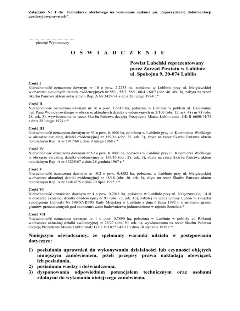 Załącznik Nr 1 do formularza ofertowego na wykonanie zadania pn. „Sporządzenie dokumentacji geodezyjno-prawnych”. ....................................... pieczęć Wykonawcy O Ś W I A D C Z E N I E Powiat Lubelski reprezentowany przez Zarząd Powiatu w Lublinie ul. Spokojna 9, 20-074 Lublin Część I Nieruchomość oznaczona dawnym nr 10 o pow. 2,2253 ha, położona w Lublinie przy ul. Mełgiewskiej w obszarze aktualnych działek ewidencyjnych nr 55/1, 55/7, 58/1, 60/4 i 60/7 (obr. 46, ark. 8), nabyta na rzecz Skarbu Państwa aktem notarialnym Rep. A Nr 3429/74 z dnia 28 lutego 1974 r.* Część II Nieruchomość oznaczona dawnym nr 16 o pow. 1,6618 ha, położona w Lublinie w pobliżu ul. Dziewanny i ul. Pana Wołodyjowskiego w obszarze aktualnych działek ewidencyjnych nr 2/103 (obr. 15, ark. 4) i nr 91 (obr. 28, ark. 8), wywłaszczona na rzecz Skarbu Państwa decyzją Prezydenta Miasta Lublin znak: GK.II-6600/14/74 z dnia 28 lutego 1974 r.* Część III Nieruchomość oznaczona dawnym nr 53 o pow. 0,1000 ha, położona w Lublinie przy ul. Kazimierza Wielkiego w obszarze aktualnej działki ewidencyjnej nr 159/16 (obr. 28, ark. 3), zbyta na rzecz Skarbu Państwa aktem notarialnym Rep. A nr 1917/68 z dnia 9 lutego 1968 r.* Część IV Nieruchomość oznaczona dawnym nr 52 o pow. 0,1000 ha, położona w Lublinie przy ul. Kazimierza Wielkiego w obszarze aktualnej działki ewidencyjnej nr 159/16 (obr. 28, ark. 3), zbyta na rzecz Skarbu Państwa aktem notarialnym Rep. A nr 15258/67 z dnia 28 grudnia 1967 r.* Część V Nieruchomość oznaczona dawnym nr 10/2 o pow. 0,4582 ha, położona w Lublinie przy ul. Mełgiewskiej w obszarze aktualnej działki ewidencyjnej nr 48/18 (obr. 46, ark. 8), zbyta na rzecz Skarbu Państwa aktem notarialnym Rep. A nr 14014/75 z dnia 29 lipca 1975 r.* Część VI Nieruchomość oznaczona dawnym nr 4 o pow. 0,2011 ha, położona w Lublinie przy ul. Nałęczowskiej 141d w obszarze aktualnej działki ewidencyjnej nr 91 (obr. 73, ark. 13), nabytej na rzecz Gminy Lublin w związku z podjęciem Uchwały Nr 196/XVIII/95 Rady Miejskiej w Lublinie z dnia 6 lipca 1995 r. o ustaleniu granic gruntów przeznaczonych pod skoncentrowane budownictwo jednorodzinne w rejonie Szerokie.* Część VII Nieruchomość oznaczona dawnym nr 1 o pow. 0,7890 ha, położona w Lublinie w pobliżu ul. Różanej w obszarze aktualnej działki ewidencyjnej nr 28/27 (obr. 30, ark. 4), wywłaszczona na rzecz Skarbu Państwa decyzją Prezydenta Miasta Lublin znak: GTO.VII.8221/45/77 z dnia 18 stycznia 1978 r.* Niniejszym oświadczamy, że spełniamy warunki udziału w postępowaniu dotyczące: 1) posiadania uprawnień do wykonywania działalności lub czynności objętych niniejszym zamówieniem, jeżeli przepisy prawa nakładają obowiązek ich posiadania, 2) posiadania wiedzy i doświadczenia, 3) dysponowania odpowiednim potencjałem technicznym oraz osobami zdolnymi do wykonania niniejszego zamówienia, 4) sytuacji ekonomicznej i finansowej. ........................................... (miejscowość, data) * niepotrzebne skreślić ........................................ (podpis Wykonawcy lub osoby upoważnionej)