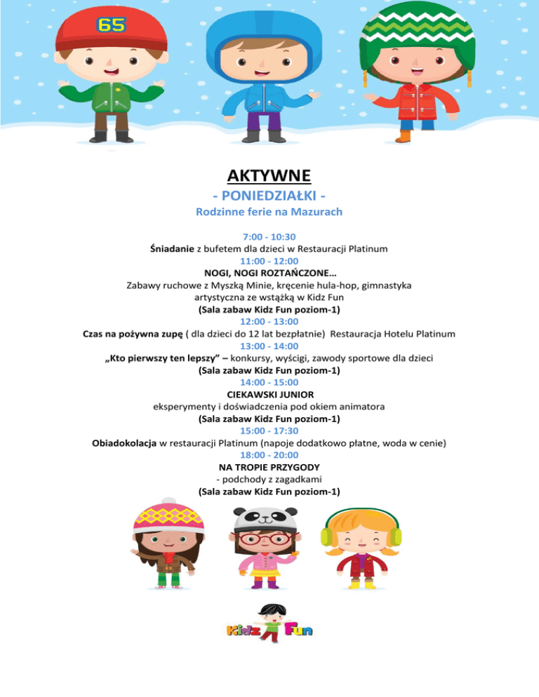 AKTYWNE - PONIEDZIAŁKI Rodzinne ferie na Mazurach 7:00 - 10:30 Śniadanie z bufetem dla dzieci w Restauracji Platinum 11:00 - 12:00 NOGI, NOGI ROZTAŃCZONE… Zabawy ruchowe z Myszką Minie, kręcenie hula-hop, gimnastyka artystyczna ze wstążką w Kidz Fun (Sala zabaw Kidz Fun poziom-1) 12:00 - 13:00 Czas na pożywna zupę ( dla dzieci do 12 lat bezpłatnie) Restauracja Hotelu Platinum 13:00 - 14:00 „Kto pierwszy ten lepszy” – konkursy, wyścigi, zawody sportowe dla dzieci (Sala zabaw Kidz Fun poziom-1) 14:00 - 15:00 CIEKAWSKI JUNIOR eksperymenty i doświadczenia pod okiem animatora (Sala zabaw Kidz Fun poziom-1) 15:00 - 17:30 Obiadokolacja w restauracji Platinum (napoje dodatkowo płatne, woda w cenie) 18:00 - 20:00 NA TROPIE PRZYGODY - podchody z zagadkami (Sala zabaw Kidz Fun poziom-1) BAJKOWE BAJKOWE - WTORKI Rodzinne ferie na Mazurach 7:00 - 10:30 Śniadanie z bufetem dla dzieci w Restauracji Platinum 11:00 - 12:00 „COŚ SIĘ LEPI , COŚ SIĘ GNIECIE” Zabawy z masą solną oraz tworzenie własnego antystresowego Gniotka (Sala zabaw Kidz Fun poziom-1) 12:00 - 13:00 Czas na pożywna zupę ( dla dzieci do 12 lat bezpłatnie) Restauracja Hotelu Platinum 13:00 - 14:00 CIASTECZKOWY POTWÓR - tworzenie wspólnie wielkiego stworka (Sala zabaw Kidz Fun poziom-1) 15:00 - 16:00 BAJECZNE CIASTECZKA rodzinne warsztaty kulinarne w Restauracji Platinum 15:00 - 17:30 Obiadokolacja w restauracji Platinum (napoje dodatkowo płatne, woda w cenie) 18:00 - 19:00 BAŚNIOWE KALAMBURY w Kidz Fun (Sala zabaw Kidz Fun poziom-1) 19:00 - 20:00 PLATINUM DZIECIOM Wieczorne czytanie bajek z ciasteczkami i kakao w Kidz Fun (Sala zabaw Kidz Fun poziom-1) PRZYGODOWE - ŚRODY Rodzinne ferie na Mazurach 7:00 - 10:30 Śniadanie z bufetem dla dzieci w Restauracji Platinum 11:00 - 12:00 KIDZ TROPICIELE gdzie się podziała Myszka Minie – zabawy tropiące (Sala zabaw Kidz Fun poziom-1) 12:00 - 13:00 Czas na pożywna zupę ( dla dzieci do 12 lat bezpłatnie) Restauracja Hotelu Platinum 13:00 - 15:00 KREDKI, FARBY I MAZAKI – NAMALUJĄ ŚWIAT DZIECIAKI - warsztaty plastyczne, tworzenie bajkowych postaci z kartonu, zabawy z masą solną, robienie makaronowej biżuterii w Kidz Fun (Sala zabaw Kidz Fun poziom-1) 14:00 - 15:00 CIEKAWSKI JUNIOR eksperymenty i doświadczenia pod okiem animatora (Sala zabaw Kidz Fun poziom-1) 15:00 - 17:30 Obiadokolacja w restauracji Platinum (napoje dodatkowo płatne, woda w cenie) 18:00 - 20:00 BAŃKOWE SZALEŃSTWO (Sala zabaw Kidz Fun poziom-1) WESOŁE - CZWARTKI Rodzinne ferie na Mazurach 7:00 - 10:30 Śniadanie z bufetem dla dzieci w Restauracji Platinum 11:00 - 12:00 KIDZ SPA maseczki i makijaże dla dziewczynek, fryzurki dla chłopców w Kidz FUN (Sala zabaw Kidz Fun poziom-1) 12:00 - 13:00 Czas na pożywna zupę ( dla dzieci do 12 lat bezpłatnie) Restauracja Hotelu Platinum 13:00 - 14:00 „Kto pierwszy ten lepszy” - przeciąganie liny , skoki w workach (Sala zabaw Kidz Fun poziom-1) 14:00 - 15:00 „Prawie jak w piaskownicy” zabawy z piaskiem kinetycznym w Kidz Fun (Sala zabaw Kidz Fun poziom-1) 15:00 - 17:30 Obiadokolacja w restauracji Platinum (napoje dodatkowo płatne, woda w cenie) 18:00 - 20:00 „Łamigłówki dla główki” zagadki, rebusy, krzyżówki , labirynty (Sala zabaw Kidz Fun poziom-1) ROZTAŃCZONE ROZTAŃCZONE - PIĄTKI Rodzinne ferie na Mazurach 7:00 - 10:30 Śniadanie z bufetem dla dzieci w Restauracji Platinum 11:00 - 12:00 KIDZ FIT Poranna gimnastyka dla najmłodszych w Kidz Fun (Sala zabaw Kidz Fun poziom-1) 12:00 - 13:00 Czas na pożywna zupę ( dla dzieci do 12 lat bezpłatnie) Restauracja Hotelu Platinum 13:00 - 14:00 „Muzyka w moich uszach” – gry na przeróżnych instrumentach (Sala zabaw Kidz Fun poziom-1) 14:00 - 15:00 ZABAWY RUCHOWE Zabawy ruchowe z zadaniami przy muzyce (Sala zabaw Kidz Fun poziom-1) 15:00 - 17:30 Obiadokolacja w restauracji Platinum (napoje dodatkowo płatne, woda w cenie) 18:00 - 19:00 CIEKAWSKI GEORGE - zostań mistrzem zgadywanek w Kidz Fun (Sala zabaw Kidz Fun poziom-1) OD 19:00 KINO MALUCHA z ciasteczkami i ciepłym kakao (Sala Perłowa poziom 0) ZAKRĘCONE - SOBOTY Rodzinne ferie na Mazurach 7:00 - 10:30 Śniadanie z bufetem dla dzieci w Restauracji Platinum 11:00 - 12:00 PORANNA GIMNASTYKA Zabawy ruchowe na dobry początek dnia w Kidz Fun (Sala zabaw Kidz Fun poziom-1) 12:00 - 13:00 Czas na pożywna zupę ( dla dzieci do 12 lat bezpłatnie) Restauracja Hotelu Platinum 13:00 - 14:00 ZABAWY Z CHUSTĄ- zabawy z chustą animacyjną „KLANZA” (Sala zabaw Kidz Fun poziom-1) 14:00 - 15:00 ZABAWY STOLIKOWE Wszelkiego rodzaju gry planszowe, układanie puzzli (Sala zabaw Kidz Fun poziom-1) 15:00 - 17:30 Obiadokolacja w restauracji Platinum (napoje dodatkowo płatne, woda w cenie) 18:00 - 19:00 W BAJKOWYM ŚWIECIE - warsztaty przygotowywania masek na bal w Kidz Fun (Sala zabaw Kidz Fun poziom-1) 19:00 - 22:00 DISCO KIDZ na taneczną dyskotekę z przekąskami zapraszają postacie Disneya w Sali Perłowej (Sala Perłowa poziom 0) LENIWE - NIEDZIELERodzinne ferie na Mazurach 7:00 - 10:30 Śniadanie z bufetem dla dzieci w Restauracji Platinum 11:00 - 12:30 MINI PIZZERINKI. Rodzinne warsztaty przygotowywania pizzy w Restauracji Platinum 12:00 - 13:00 Czas na pożywna zupę ( dla dzieci do 12 lat bezpłatnie) Restauracja Hotelu Platinum 13:00 - 14:00 „Baw się z nami origami” – papierowe cudeńka bez użycia kleju i nożyczek (Sala zabaw Kidz Fun poziom-1)