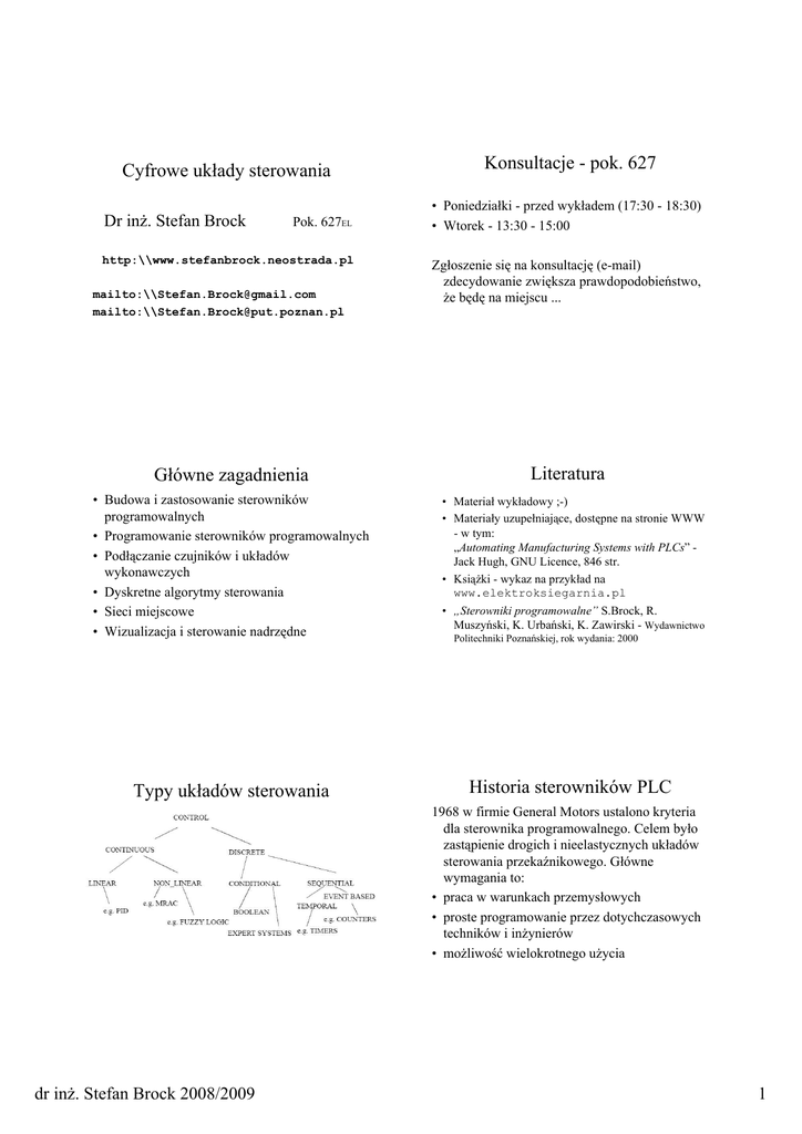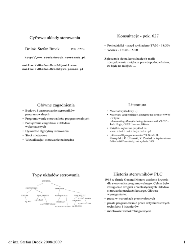 Cyfrowe układy sterowania Dr inŜ. Stefan Brock Pok. 627EL http:\\www.stefanbrock.neostrada.pl mailto:\\[email protected] mailto:\\[email protected] Główne zagadnienia • Budowa i zastosowanie sterowników programowalnych • Programowanie sterowników programowalnych • Podłączanie czujników i układów wykonawczych • Dyskretne algorytmy sterowania • Sieci miejscowe • Wizualizacja i sterowanie nadrzędne Typy układów sterowania Konsultacje - pok. 627 • Poniedziałki - przed wykładem (17:30 - 18:30) • Wtorek - 13:30 - 15:00 Zgłoszenie się na konsultację (e-mail) zdecydowanie zwiększa prawdopodobieństwo, Ŝe będę na miejscu ... Literatura • Materiał wykładowy ;-) • Materiały uzupełniające, dostępne na stronie WWW - w tym: „Automating Manufacturing Systems with PLCs” Jack Hugh, GNU Licence, 846 str. • KsiąŜki - wykaz na przykład na www.elektroksiegarnia.pl • „Sterowniki programowalne” S.Brock, R. Muszyński, K. Urbański, K. Zawirski - Wydawnictwo Politechniki Poznańskiej, rok wydania: 2000 Historia sterowników PLC 1968 w firmie General Motors ustalono kryteria dla sterownika programowalnego. Celem było zastąpienie drogich i nieelastycznych układów sterowania przekaźnikowego. Główne wymagania to: • praca w warunkach przemysłowych • proste programowanie przez dotychczasowych techników i inŜynierów • moŜliwość wielokrotnego uŜycia dr inŜ. Stefan Brock 2008/2009 1 The 6 parts of the IEC 61131 Standard IEC 61131-3 - 1 General overview, definitions - 2 Hardware - 3 Programming Languages - 4 User Guidelines “The best thing that happened to industrial control” - 5 Messaging Service Specification - 7 Fuzzy Logic Sugar Lantic on Automation Maillist The IEC 61131-3 Programming Languages Instruction List LD Structured Text A ANDN B ST C C:= A AND NOT B Function Block Diagram • Standardized, rationalized set of relay ladder programming symbols • Based on well-known North american style of programming, resembling US-type of electrical drawing standard Ladder Diagram AND A Ladder Diagram (LD) A B C C -| |--|/|----------------( ) B A B C -| |--|/|----------------( ) Structured Text (ST) Instruction List (IL) • Single Accumulator based execution model • Based upon the German ‘Anweisungsliste’, AWL • One operation such as storing a value in the accumulator register, is allowed per line LD A ANDN B ST C dr inŜ. Stefan Brock 2008/2009 • High level language, block structured • Syntax resembles PASCAL • Complex statements and nested instructions possible • Support for – Iteration loops (REPEAT-UNTIL; WHILE-DO) – Conditional execution (IF-THEN-ELSE; CASE) – Functions (SQRT(), SIN()) C:= A AND NOT B 2 Function Block Diagram (FBD) • Graphical language, widely used in Europe • Allows program elements which appear as blocks to be "wired" together in a form analogous to a circuit diagram • Used in many applications that involve the flow of information or data between control components AND A chemistry C B Sequential Function Chart, SFC • Powerful graphical technique for describing the sequential behaviour of a control program • Used to partition a control problem • Shows overview, also suitable for rapid diagnostics • The basic elements are STEPS with ACTION BLOCKS and TRANSITIONS • Support for alternative and parallel sequences Step 1 N FILL Transition 1 Step 2 S Empty Transition 2 Step 3 Elementy języka LD SFC : alternative sequences Styk normalnie otwarty Styk normalnie zamknięty Step 1 Transition 1a N FILL Negacja Transition 1b Zbocze narastające Step 2 a S Empty Step 2 b Transition 2a S Empty Transition 2b Step 3 Zbocze opadające Cewka wyjściowa normalna Cewka wyjściowa z pamięcią typu Set i Reset dr inŜ. Stefan Brock 2008/2009 3 Zasady tworzenia sieci (network, szczebel) Układ z podtrzymaniem Połączenie mostkowe dr inŜ. Stefan Brock 2008/2009 Nieprawidłowe Przełączanie – bit pomocniczy Połączenie z diodami 4 Przełącznik Układy czasowe - timery Przykład TOF dr inŜ. Stefan Brock 2008/2009 5 Timer typu TP dr inŜ. Stefan Brock 2008/2009 Liczniki – impulsy zewnętrzne 6