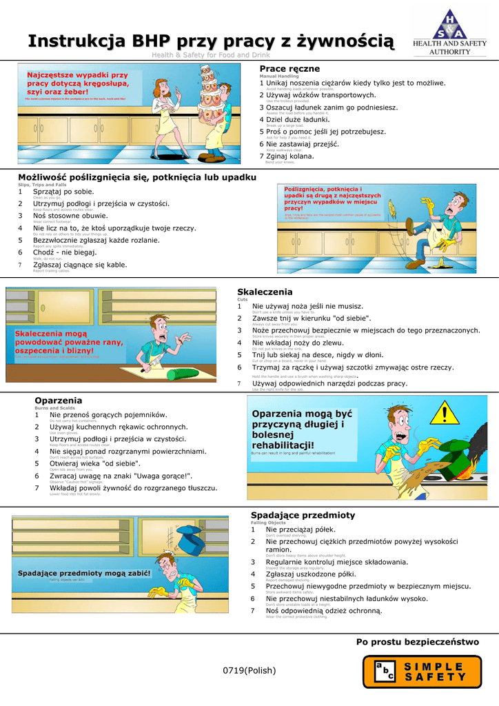 Instrukcja BHP przy pracy z żywnością Health & Safety for Food and Drink Prace ręczne Manual Handling 1 Unikaj noszenia ciężarów kiedy tylko jest to możliwe. Avoid handling loads wherever possible. 2 Używaj wózków transportowych. Use the trolleys provided. 3 Oszacuj ładunek zanim go podniesiesz. Assess the load before you handle it. 4 Dziel duże ładunki. Break up a large load. 5 Proś o pomoc jeśli jej potrzebujesz. Ask for help if you need it. 6 Nie zastawiaj przejść. Keep walkways clear. 7 Zginaj kolana. Bend your knees. Możliwość poślizgnięcia się, potknięcia lub upadku Slips, Trips and Falls 1 Sprzątaj po sobie. 2 Utrzymuj podłogi i przejścia w czystości. 3 Noś stosowne obuwie. 4 Nie licz na to, że ktoś uporządkuje twoje rzeczy. 5 Bezzwłocznie zgłaszaj każde rozlanie. 6 Chodź - nie biegaj. Clean as you go. Keep floors and access routes clear. Wear correct footwear. Do not rely on others to tidy your things up. Report any spills immediately. Walk, do not run. 7 Zgłaszaj ciągnące się kable. Report trailing cables. Skaleczenia Cuts 1 Nie używaj noża jeśli nie musisz. 2 Zawsze tnij w kierunku "od siebie". 3 Noże przechowuj bezpiecznie w miejscach do tego przeznaczonych. 4 Nie wkładaj noży do zlewu. 5 Tnij lub siekaj na desce, nigdy w dłoni. 6 Trzymaj za rączkę i używaj szczotki zmywając ostre rzeczy. Hold the handle and use a brush when washing sharp objects. Używaj odpowiednich narzędzi podczas pracy. 7 Don’t use a knife unless you have to. Always cut away from you. Store knives securely in then proper areas. Do not put knives in the sink. Cut or chop on a board, never in your hand. Use the right knife for the job. Oparzenia Burns and Scalds 1 Nie przenoś gorących pojemników. 2 Używaj kuchennych rękawic ochronnych. 3 Utrzymuj podłogi i przejścia w czystości. 4 Nie sięgaj ponad rozgrzanymi powierzchniami. 5 Otwieraj wieka "od siebie". 6 Zwracaj uwagę na znaki "Uwaga gorące!". 7 Wkładaj powoli żywność do rozgrzanego tłuszczu. Do not carry hot containers. Use oven gloves. Keep floors and access routes clear. Don’t reach across hot surfaces. Open lids away from you. Observe “Caution Hot” signage. Lower food into hot fat slowly. Spadające przedmioty Falling Objects 1 Nie przeciążaj półek. 2 Nie przechowuj ciężkich przedmiotów powyżej wysokości ramion. 3 Regularnie kontroluj miejsce składowania. 4 Zgłaszaj uszkodzone półki. 5 Przechowuj niewygodne przedmioty w bezpiecznym miejscu. Don’t overload shelving. Don’t store heavy items above shoulder height. Inspect the storage area regularly. Report damaged shelving. Store awkward items safely. 6 Nie przechowuj niestabilnych ładunków wysoko. Don’t store unstable loads at a height. 7 Noś odpowiednią odzież ochronną. Wear the correct protective clothing. Po prostu bezpieczeństwo 0719(Polish)