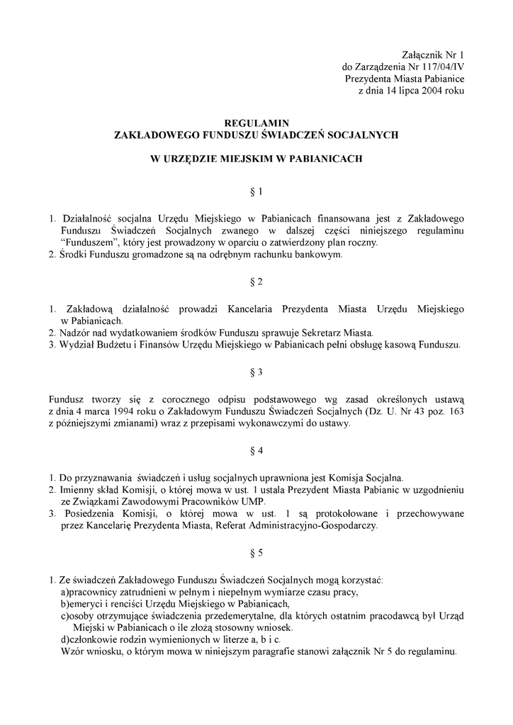 Załącznik Nr 1 do Zarządzenia Nr 117/04/IV Prezydenta Miasta Pabianice z dnia 14 lipca 2004 roku REGULAMIN ZAKŁADOWEGO FUNDUSZU ŚWIADCZEŃ SOCJALNYCH W URZĘDZIE MIEJSKIM W PABIANICACH §1 1. Działalność socjalna Urzędu Miejskiego w Pabianicach finansowana jest z Zakładowego Funduszu Świadczeń Socjalnych zwanego w dalszej części niniejszego regulaminu “Funduszem”, który jest prowadzony w oparciu o zatwierdzony plan roczny. 2. Środki Funduszu gromadzone są na odrębnym rachunku bankowym. §2 1. Zakładową działalność prowadzi Kancelaria Prezydenta Miasta Urzędu Miejskiego w Pabianicach. 2. Nadzór nad wydatkowaniem środków Funduszu sprawuje Sekretarz Miasta. 3. Wydział BudŜetu i Finansów Urzędu Miejskiego w Pabianicach pełni obsługę kasową Funduszu. §3 Fundusz tworzy się z corocznego odpisu podstawowego wg zasad określonych ustawą z dnia 4 marca 1994 roku o Zakładowym Funduszu Świadczeń Socjalnych (Dz. U. Nr 43 poz. 163 z późniejszymi zmianami) wraz z przepisami wykonawczymi do ustawy. §4 1. Do przyznawania świadczeń i usług socjalnych uprawniona jest Komisja Socjalna. 2. Imienny skład Komisji, o której mowa w ust. 1 ustala Prezydent Miasta Pabianic w uzgodnieniu ze Związkami Zawodowymi Pracowników UMP. 3. Posiedzenia Komisji, o której mowa w ust. 1 są protokołowane i przechowywane przez Kancelarię Prezydenta Miasta, Referat Administracyjno-Gospodarczy. §5 1. Ze świadczeń Zakładowego Funduszu Świadczeń Socjalnych mogą korzystać: a)pracownicy zatrudnieni w pełnym i niepełnym wymiarze czasu pracy, b)emeryci i renciści Urzędu Miejskiego w Pabianicach, c)osoby otrzymujące świadczenia przedemerytalne, dla których ostatnim pracodawcą był Urząd Miejski w Pabianicach o ile złoŜą stosowny wniosek. d)członkowie rodzin wymienionych w literze a, b i c. Wzór wniosku, o którym mowa w niniejszym paragrafie stanowi załącznik Nr 5 do regulaminu. 2. Za członków rodzin uprawnionych do świadczeń z Funduszu uwaŜa się: a)współmałŜonków, b)pozostające na utrzymaniu i wychowaniu uczące się dzieci własne, dzieci przysposobione, przyjęte na wychowanie w ramach rodziny zastępczej oraz dzieci współmałŜonków w wieku do lat 20-tu bez względu na pobieranie lub nie pobieranie zasiłku rodzinnego. 3. Warunkiem uzyskania świadczeń z Funduszu jest przepracowanie w Urzędzie Miejskim w Pabianicach co najmniej 1 roku lub podjęcia zatrudnienia w wyniku: a) przeniesienia słuŜbowego, b) powołania lub wyboru, c) porozumienia między zakładami. §6 Przyznanie świadczeń oraz ich wysokość uzaleŜnione jest od sytuacji Ŝyciowej, rodzinnej i materialnej osoby uprawnionej do korzystania z Funduszu. § 7. Środki Funduszu przeznaczone są na: 1. Dofinansowanie wypoczynku dzieci i młodzieŜy nie częściej niŜ raz w roku w wysokości określonej w tabeli odpłatności. 2. Na dofinansowanie wypoczynku dzieci niepełnosprawnych wraz z opiekunem nie częściej niŜ raz w roku w wysokości określonej w tabeli odpłatności. 3. Dofinansowanie wypoczynku pracowników nie częściej niŜ raz na dwa lata w wysokości określonej w tabeli, w następujących formach: a) krajowych wczasów pracowniczych zakupionych przez zakład pracy lub indywidualnie przez pracownika, b) wypoczynku urlopowego organizowanego przez pracownika we własnym zakresie (tzw. „wczasy pod gruszą”) pod warunkiem korzystania z urlopu wypoczynkowego w ilości nie mniejszej niŜ 14 kolejnych dni kalendarzowych. Dofinansowanie jest udzielane przed datą rozpoczęcia wypoczynku urlopowego. 4. Na dofinansowanie prezentów gwiazdkowych dla dzieci do lat 15-tu. 5. Na dofinansowanie prezentów gwiazdkowych dla dzieci niepełnosprawnych do lat 18-tu. 6. Na dofinansowanie imprez kulturalnych i rekreacyjnych np. bilety do kina lub grzybobranie. 7. Na dofinansowanie zwrotnej pomocy na cele mieszkaniowe określonej odrębną umową. 8. Na dofinansowanie zwrotnej pomocy na częściowe zrekompensowanie szkód poniesionych przez pracownika na skutek przypadków losowych np.: poŜar, zalanie mieszkania, powódź, huragan itp. - do 3-krotnej wysokości pomocy na cele mieszkaniowe. § 8. Pracownik ubiegający się o dopłatę do wypoczynku na dany rok, składa wypełniony w całości wniosek do Kancelarii Prezydenta Miasta w następujących terminach: do 15 grudnia na I-wszy kwartał roku następnego, do 30 kwietnia na pozostałe kwartały. Wzór wniosku, o którym mowa w niniejszym paragrafie stanowi załącznik Nr 2 do regulaminu. § 9. 1. Wysokość odpłatności za wczasy, kolonie, zimowiska, obozy i wypoczynek organizowany przez pracownika we własnym zakresie (tzw. „wczasy pod gruszą”) określona jest w „Tabeli odpłatności” ustalonej na kaŜdy rok przez Prezydenta Miasta Pabianic w uzgodnieniu ze Związkami Zawodowymi Pracowników UMP. 2. W przypadku wyŜszej ceny skierowań od podanych w tabeli, róŜnicę pokrywa pracownik. § 10. 1. Zarobek pracownika konieczny do wyliczenia odpłatności za kolonie, obozy, zimowiska, wczasy, wczasy pod gruszą - to osiągnięty w I-szym kwartale danego roku, średni dochód brutto pomniejszony o potrącenia świadczeń społecznych, zdrowotnych, podatek i z wyłączeniem dodatkowego wynagrodzenia rocznego dla pracowników jednostek sfery budŜetowej. 2. W przypadku współmałŜonków pracowników Urzędu Miejskiego, którzy prowadzą działalność gospodarczą, w swoich oświadczeniach wykazują faktycznie osiągnięte w I-szym kwartale danego roku średnie dochody. Dochody te będą jednak przyjmowane w wysokości nie niŜszej, niŜ została zadeklarowana do podstawy wymiaru składek na ubezpieczenie społeczne, a jeŜeli nie podlegają ubezpieczeniu społecznemu – w wysokości nie niŜszej od najniŜszej podstawy wymiaru składek. § 11. Dochód obejmuje: 1. Składniki uwzględnione przy obliczeniu zasiłków rodzinnych i pielęgnacyjnych, to jest: a) wynagrodzenie z tytułu: - zatrudnienia wykonywanego na po