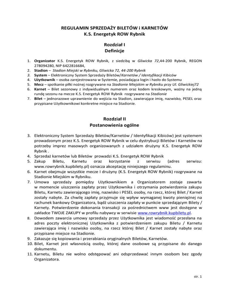 REGULAMIN SPRZEDAŻY BILETÓW i KARNETÓW K.S. Energetyk ROW Rybnik Rozdział I Definicje 1. Organizator K.S. Energetyk ROW Rybnik, z siedzibą w Gliwicka 72,44-200 Rybnik, REGON 278094280, NIP 6422816684, 2. Stadion – Stadion Miejski w Rybniku, Gliwicka 72, 44-200 Rybnik 3. System – Elektroniczny System Sprzedaży Biletów/Karnetów / Identyfikacji Kibiców 4. Użytkownik – osoba zarejestrowana w Systemie, posiadająca login i hasło do Systemu 5. Mecz – spotkanie piłki nożnej rozgrywane na Stadionie Miejskim w Rybniku przy Ul. Gliwickiej72 6. Karnet – Bilet sezonowy z indywidualnym numerem oraz kodem kreskowym, ważny na jedną rundę sezonu na mecze K.S. Energetyk ROW Rybnik rozgrywane na Stadionie 7. Bilet – jednorazowe uprawnienie do wejścia na Stadion, zawierające imię, nazwisko, PESEL oraz przypisane Użytkownikowi konkretne miejsce na Stadionie. Rozdział II Postanowienia ogólne 3. Elektroniczny System Sprzedaży Biletów/Karnetów / Identyfikacji Kibiców) jest systemem prowadzonym przez K.S. Energetyk ROW Rybnik w celu dystrybucji Biletów i Karnetów na potrzeby imprez masowych organizowanych z udziałem drużyny K.S. Energetyk ROW Rybnik . 4. Sprzedaż karnetów lub Biletów prowadzi K.S. Energetyk ROW Rybnik 5. Zakup Biletu, Karnetu oraz korzystanie z serwisu (adres serwisu: www.rowrybnik.kupbilety.pl) oznacza akceptację niniejszego regulaminu. 6. Karnet obejmuje wszystkie mecze I drużyny (K.S. Energetyk ROW Rybnik) rozgrywane na Stadionie Miejskim w Rybniku. 7. Umowa sprzedaży pomiędzy Użytkownikiem a Organizatorem zostaje zawarta w momencie uiszczenia zapłaty przez Użytkownika i otrzymania potwierdzenia zakupu Biletu, Karnetu zawierającego imię, nazwisko i PESEL osoby, na rzecz, której Bilet / Karnet zostały nabyte. Za chwilę zapłaty przyjmuje się wpływ wymaganej kwoty pieniężnej na rachunek bankowy Organizatora, bądź uiszczenia zapłaty w punkcie sprzedającym Bilety / Karnety. Potwierdzenie dokonania transakcji za pośrednictwem www jest dostępne w zakładce TWOJE ZAKUPY w profilu nabywcy w serwisie www.rowrybnik.kupbilety.pl. 8. Dowodem zawarcia umowy sprzedaży przez Użytkownika jest wiadomość przesłana na adres poczty elektronicznej Użytkownika z potwierdzeniem zakupu Biletu / Karnetu zawierająca imię i nazwisko osoby, na rzecz której Bilet / Karnet zostały nabyte oraz przypisane miejsce na Stadionie. 9. Zakazuje się kopiowania i przerabiania oryginalnych Biletów, Karnetów. 10. Bilet, Karnet jest własnością osoby, której dane osobowe są przypisane do danego dokumentu. 11. Karnetu, Biletu nie wolno odstępować ani odsprzedawać innym osobom bez zgody Organizatora. str. 1 12. Wykorzystując Bilet lub Karnet, Użytkownik akceptuje ogólne warunki i zasady ustalone przez Organizatora oraz oświadcza, że zapoznał się z regulaminem stadionu, na którym odbywa się mecz i regulaminem imprezy masowej. 13. Użytkownik oświadcza, że będzie korzystał z Elektronicznego Systemu Sprzedaży Biletów i Identyfikacji Kibiców wyłącznie w celu zakupu Biletu, karnetu bądź założenia profilu. 14. Organizator nie ponosi odpowiedzialności za niezawiniony przez Organizatora brak możliwości korzystania przez Użytkowników z Systemu. 15. Karnetów lub Biletów nie sprzedaje się osobom: a) Wobec których zostało wydane orzeczenie zakazujące wstępu na imprezę masową lub orzeczenie zobowiązujące do powstrzymywania się od przebywania w miejscach przeprowadzania imprez masowych wydane przez sąd w związku z warunkowym zawieszeniem wykonania kary pozbawienia wolności; b) Wobec których został wydany zakaz stadionowy nałożony przez uprawnione do tego podmioty innych państw, o którym informacje przekazano Komendantowi Głównemu Policji; c) Wobec których został wydany aktualny zakaz klubowy. 16. K.S. Energetyk ROW Rybnik nie ponosi odpowiedzialności za odwołanie zawodów z przyczyn losowych oraz spowodowanych siłą wyższą. Rozdział III Ogólne zasady sprzedaży Karnetów, Biletów online System sprzedaży on-line na stronie rowrybnik.kupbilety.pl jest serwisem sprzedaży, w którym odbywa się dystrybucja Biletów na mecze K.S. Energetyk ROW Rybnik rozgrywane na Stadionie. 1. Realizacja płatności w systemie sprzedaży on-line przebiega zgodnie z regulaminem operatora systemu PayU S.A. (z siedzibą w Poznaniu ul. Marcelińska 90) (należy wprowadzić dane innego systemu jeżeli korzystają z innego). Zapłata jest regulowana przez Użytkownika z własnego konta bankowego lub za pomocą karty kredytowej. 2. System płatności on-line obsługuje następujące sposoby płatności: a) KARTA KREDYTOWA: MasterCard, VISA, Diners Club, b) Szybki przelew bankowy ON LINE: MTransfer, Multi Transfer, Inteligo, Przelew 24, iPKO, Nordea, Pekao24Przelew, Lukas e-przelew, Przelew z Millennium, Przelew Eurobank, Przelew ING. 3. Do każdej transakcji zakupu Biletu, Karnetu w Internecie doliczana będzie opłata manipulacyjna, w której zawarte są prowizje bankowe wynikające z systemu płatności online. 4. W celu dokonania zakupu zależy zarejestrować się w serwisie www.rowrybnik.kupbilety.pl lub założyć profil w punkcie sprzedaży (nie dotyczy osób, które posiadały karnety lub kupowały Bilety na poprzednią rundę). 5. Jeden Kibic może zarejestrować w Systemie innego Kibica, pod warunkiem, że zna jego wszystkie dane (w tym adres e-mail niezbędny do aktywacji konta). Rejestrujący tym samym bierze odpowiedzialność za podanie prawidłowych danych. 6. Na jednego zarejestrowanego kibica przypada jeden Karnet lub Bilet na dany mecz. 7. Każda umowa rejestrowana jest w systemie informatycznym Organizatora. str. 2 8. Kwota należności wynikająca z zamówienia winna zostać zrealizowana natychmiast po dokonaniu zamówienia. Bilety i karnety pozostają własnością klubu do momentu odnotowania płatności na rachunku Organizatora. 9. Czas oczekiwania na zaksięgowanie wpłaty wynosi 24 godziny (z wyłączeniem 