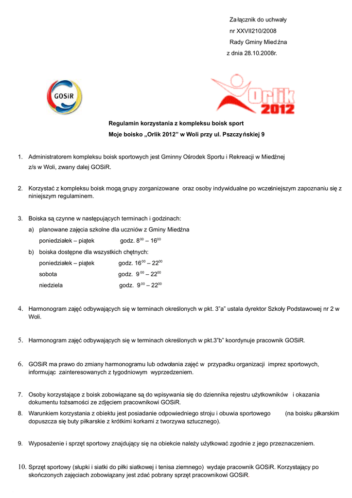 Za łącznik do uchwały nr XXVII210/2008 Rady Gminy Mied źna z dnia 28.10.2008r. Regulamin korzystania z kompleksu boisk sport Moje boisko „Orlik 2012” w Woli przy ul. Pszczyńskiej 9 1. Administratorem kompleksu boisk sportowych jest Gminny Ośrodek Sportu i Rekreacji w Miedźnej z/s w Woli, zwany dalej GOSiR. 2. Korzystać z kompleksu boisk mogą grupy zorganizowane oraz osoby indywidualne po wcześniejszym zapoznaniu się z niniejszym regulaminem. 3. Boiska są czynne w następujących terminach i godzinach: a) planowane zajęcia szkolne dla uczniów z Gminy Miedźna poniedziałek – piątek godz. 8 00 – 1600 b) boiska dostępne dla wszystkich chętnych: poniedziałek – piątek godz. 16 00 – 2200 sobota godz. 9 00 – 2200 niedziela godz. 9 00 – 2200 4. Harmonogram zajęć odbywających się w terminach określonych w pkt. 3”a” ustala dyrektor Szkoły Podstawowej nr 2 w Woli. 5. Harmonogram zajęć odbywających się w terminach określonych w pkt.3”b” koordynuje pracownik GOSiR. 6. GOSiR ma prawo do zmiany harmonogramu lub odwołania zajęć w przypadku organizacji imprez sportowych, informując zainteresowanych z tygodniowym wyprzedzeniem. 7. Osoby korzystające z boisk zobowiązane są do wpisywania się do dziennika rejestru użytkowników i okazania dokumentu tożsamości ze zdjęciem pracownikowi GOSiR. 8. Warunkiem korzystania z obiektu jest posiadanie odpowiedniego stroju i obuwia sportowego dopuszcza się buty piłkarskie z krótkimi korkami z tworzywa sztucznego). (na boisku piłkarskim 9. Wyposażenie i sprzęt sportowy znajdujący się na obiekcie należy użytkować zgodnie z jego przeznaczeniem. 10. Sprzęt sportowy (słupki i siatki do piłki siatkowej i tenisa ziemnego) wydaje pracownik GOSiR. Korzystający po skończonych zajęciach zobowiązany jest zdać pobrany sprzęt pracownikowi GOSiR. 11. W celu zapewnienia bezpieczeństwa użytkownikom i korzystania z boisk zgodnie z ich przeznaczeniem zabrania się: a) używania butów piłkarskich na wysokich plastikowych i metalowych korkach oraz kolców, b) wprowadzania i użytkowania sprzętu innego niż zgodnie z przeznaczeniem boisk, np. rower, motorower, deskorolka, rolki itp. c) wnoszenia petard, materiałów łatwopalnych, szklanych opakowań oraz innych przedmiotów niebezpiecznych, d) niszczenie urządzeń sportowych i płyty boiska, e) wchodzenia na ogrodzenie i urządzenia sportowe, f) palenia tytoniu i spożywania alkoholu, g) zaśmiecania i rzucania wszelkich przedmiotów na płytę boiska, h) przeszkadzania w zajęciach lub grze, i) zakłócania porządku i używania wulgarnych słów, j) przebywania na terenie obiektu osobom poniżej 15 roku życia po zmroku, k) wprowadzania zwierząt, l) korzystania z boisk bez zgody pracownika GOSiR. 12. Odpowiedzialność za bezpieczeństwo uczniów na obiekcie w czasie planowanych zajęć szkolnych ponosi nauczyciel , zajęć pozalekcyjnych trener, instruktor, animator sportu itp. 13. Osoby niepełnoletnie mogą korzystać z kompleksu boisk jedynie w obecności i pod nadzorem osób dorosłych (rodzic, trener, nauczyciel). Opiekun opuszcza obiekt ostatni po wyjściu całej grupy, za którą był odpowiedzialny. 14. Użytkownicy korzystają z boisk sportowych na własną odpowiedzialność. 15. Przed każdymi zajęciami prowadzący zajęcia ma obowiązek sprawdzić stan udostępnionych urządzeń oraz sprzętu sportowego. 16. Prowadzący zajęcia sportowo – rekreacyjne (nauczyciel, trener, opiekun) jest zobowiązany powiadomić pracownika GOSiR o każdym zaistniałym wypadku lub kontuzji ćwiczącego. 17. GOSiR nie ponosi odpowiedzialności za wypadki powstałe w czasie korzystania z obiektu przez użytkowników. Jednocześnie korzystający zobowiązany jest do zgłaszania każdego zauważonego uszkodzenia sprzętu sportowego pracownikowi GOSiR. 18. Za zniszczenia powstałe w czasie korzystania z boisk odpowiedzialność materialną ponoszą osoby korzystające. 19. W czasie niekorzystnych warunków atmosferycznych o korzystaniu z boisk decyduje pracownik GOSiR. 20. W czasie wakacji letnich i ferii zimowych obowiązuje odrębny harmonogram korzystania z obiektu. 21. GOSiR nie ponosi odpowiedzialności za rzeczy osobiste pozostawione na obiekcie przez użytkowników. 22. Rozstrzygnięcia dotyczące postępowania przez korzystających zgodnego z wytycznymi w pkt. 11 podejmuje pracownik GOSiR, który w zależności od sytuacji może: - nakazać zmianę obuwia sportowego, - zwrócić uwagę na niewłaściwe, niezgodne z regulaminem zachowanie lub korzystanie z obiektu, - nakazać opuszczenie terenu boisk. 23. Korzystający z kompleksu boisk sportowych zobowiązuje się do przestrzegania przepisów Ppoż. i BHP. 24. Korzystający z obiektu są zobowiązani do bezwzględnego przestrzegania niniejszego regulaminu. 25.Niezastosowanie się do niniejszego regulaminu rozpatrywane będzie w drodze postępowania karno-administracyjnego (z art. 51 §1 i 2 Kw, art.54 Kw), a w szczególnych wypadkach w drodze postępowania karnego (z art. 193 Kk). Również podlegać będzie zakazowi dalszych wstępów na boiska.