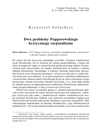 Przegląd Filozoficzny – Nowa Seria R. 23: 2014, Nr 4 (92), ISSN 1230–1493 Krzysztof Szlachcic Dwa problemy Popperowskiego krytycznego racjonalizmu Słowa kluczowe: K.R. Popper, krytyczny racjonalizm, falsyfikacjonizm, sprzeczności w filozofii Poppera, definiowanie terminów Do miana filozofii krytycznej pretendują wszystkie orientacje współczesnej myśli filozoficznej. Jest to bowiem ten rodzaj autokwalifikacji, z której nie może zrezygnować żadne ze stanowisk pod groźbą poważnej sankcji. W przeciwnym razie skazywałoby się niejako automatycznie na banicję z obszaru refleksji filozoficznej. Dominujące w kulturze Zachodu nastawienie sprowadza bowiem rzecz do prostej konstatacji: niekrytyczna filozofia to niefilozofia. Nie trzeba przy tym dodawać, że za poszczególnymi werbalnymi deklaracjami o krytycyzmie własnej tradycji filozoficznej kryją się różne rozumienia owego krytycyzmu, metody krytycznej, filozofii krytycznej, a to z kolei daje okazję do niekończącego się deprecjonowania konkurencji filozoficznej, deprecjonowania przeprowadzanego w imię prawdziwego krytycyzmu. Wśród tych, którzy szczególnie głośno w ostatnich dziesięcioleciach zgłaszali swoje roszczenia do miana filozofii krytycznej byli popperyści, traktujący krytycyzm jako jeden z podstawowych znaków rozpoznawczych swojej orientacji filozoficznej. Efektem tych usiłowań zwolenników Poppera jest obecnie dość powszechne traktowanie określenia „krytyczny racjonalizm” jako wskazującego bezpośrednio na filozofię Wiedeńczyka i jego zdeklarowanych naśladowców1. Ta swoista aneksja terminu nie byłaby oczywiście możliwa bez 1 Praktycznie rzecz biorąc, zatarte zostały w środowiskowej świadomości filozoficznej dwudziestowieczne próby wykorzystywania terminu krytyczny racjonalizm dla oznaczenia stanowisk innych niż Popperowskie (na przykład koncepcji propagowanej znacznie wcześniej przez Josiaha Royce’a). 164 Krzysztof Szlachcic znacznej popularności myśli Poppera, popularności wykraczającej daleko poza środowiska akademickiej filozofii. Moim celem jest wskazanie i rozważenie dwóch trudności Popperowskiego krytycznego racjonalizmu, filozofii samego protoplasty tej orientacji. Pierwsza z trudności to swoista ambiwalencja postawy Poppera wobec możliwości definitywnego obalenia określonego fragmentu empirycznej wiedzy teoretycznej, takiego jak teoria naukowa czy prawo nauki empirycznej. Owe obalenia w kontekście popperyzmu komentowane są często z przywołaniem terminu „falsyfikacja” i mają swój ścisły związek ze starym problemem możliwości przeprowadzenia eksperymentu krzyżowego w naukach. Moja wykładnia wskazanego aspektu stanowiska Poppera w istotny sposób odbiega od standardowych jego odczytań. I choć sama w sobie jest prosta, nie angażując złożonego aparatu teoretycznego i wyrafinowanych technik interpretacji, to jednak jej uchwycenie wymaga nieco obszerniejszego wprowadzenia i dlatego w tym miejscu ograniczę się jedynie do enigmatycznego odnotowania istnienia owej „ambiwalencji” właściwej stanowisku samego Poppera. Drugiej trudności upatruję w niedostrzeganiu, albo ostrożniej, niedocenianiu istotnego rysu stanowiska Poppera: pojawiających się przez dziesięciolecia w jego pismach deklaracji, że świadomie rezygnuje on z definiowania, z doprecyzowania znaczeń niektórych terminów istotnych dla jego filozofii, na przykład takich jak „falsyfikacja” czy „falsyfikacjonizm”. Twierdzę, że również i ta Popperowska praktyka ma destrukcyjny wpływ na propagowany przez niego od połowy stulecia program krytycznego racjonalizmu. W najlepszym przypadku wskazana praktyka prowadzi do znaczącego zmniejszenia atrakcyjności teoretycznej krytycznego racjonalizmu. Wymienione zagadnienia mają odmienny charakter w tym sensie, że należy je w różny sposób umiejscawiać w zespole idei Popperowskiej filozofii, w obrębie krytycznego racjonalizmu. Mówiąc obrazowym językiem Lakatosowej metodologii naukowych programów badawczych, pierwsze z nich należy do kluczowych tez twardego rdzenia filozoficznego projektu Poppera, drugie zaś może być traktowane jako część tzw. pasa ochronnego tegoż projektu. Owe różnice „umownej wagi” poszczególnych problemów wypływające z odmiennego ich usytuowania nie wpływają jednak na zasadniczą ich ocenę: oba dają okazję do teoretycznego „demolowania” programu krytycznego racjonalizmu, oba radykalnie zmniejszają przypisywaną mu przez samego Poppera wartość argumentacyjną, a tym samym prowadzą do wielkiego zmniejszenia jego przewag nad konkurencją filozoficzną, również akcentującą znaczenie krytycyzmu w badaniach. Kolejne części moich rozważań będą ukazywać uzasadnienie dla przedstawionych ocen. Już z tej wstępnej zapowiedzi wynika, że moje spostrzeżenia zawierać będą elementy surowego osądu koncepcji Popperowskich, niezależnie od tego, że Dwa problemy Popperowskiego krytycznego racjonalizmu 165 przede wszystkim zorientowane są na wydobycie specyficznych rozstrzygnięć z prac autora Nędzy historycyzmu i ewentualne zainteresowanie nimi Czytelnika. Z tego też względu, by nie być zaliczonym do kręgu krytykujących w czambuł Poppera i odnoszących nad nim „łatwe zwycięstwo”, pozwolę sobie na dodatkową deklarację na zakończenie tych wstępnych uwag. Daleki jestem od lekceważenia dzieła Karla Poppera. Dostrzegając jego poważne ograniczenia, mam także głębokie przekonanie, że do ich autora nadal można zastosować parafrazę starego powiedzenia Erazma: Wśród licznych ślepców jednooki może być królem!2 *** Przypomnienie na początku kilku Popperowskich rozstrzygnięć filozoficznych pozwoli mi w dalszej części rozważań na mniej rozbudowaną prezentację wskazanych tu trudności jego stanowiska. Rozpoczynam więc od kwestii na pozór dość odległych od owych dwóch kłopotliwych problemów filozofii Wiedeńczyk