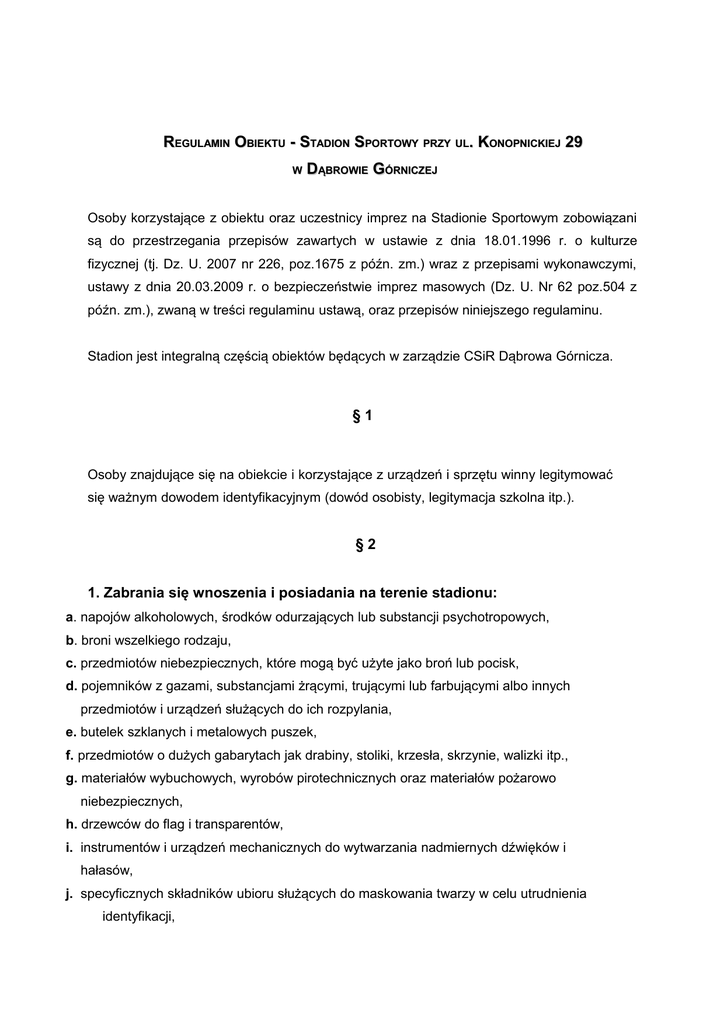 REGULAMIN OBIEKTU - STADION SPORTOWY PRZY UL. KONOPNICKIEJ 29 W DĄBROWIE GÓRNICZEJ Osoby korzystające z obiektu oraz uczestnicy imprez na Stadionie Sportowym zobowiązani są do przestrzegania przepisów zawartych w ustawie z dnia 18.01.1996 r. o kulturze fizycznej (tj. Dz. U. 2007 nr 226, poz.1675 z późn. zm.) wraz z przepisami wykonawczymi, ustawy z dnia 20.03.2009 r. o bezpieczeństwie imprez masowych (Dz. U. Nr 62 poz.504 z późn. zm.), zwaną w treści regulaminu ustawą, oraz przepisów niniejszego regulaminu. Stadion jest integralną częścią obiektów będących w zarządzie CSiR Dąbrowa Górnicza. §1 Osoby znajdujące się na obiekcie i korzystające z urządzeń i sprzętu winny legitymować się ważnym dowodem identyfikacyjnym (dowód osobisty, legitymacja szkolna itp.). §2 1. Zabrania się wnoszenia i posiadania na terenie stadionu: a. napojów alkoholowych, środków odurzających lub substancji psychotropowych, b. broni wszelkiego rodzaju, c. przedmiotów niebezpiecznych, które mogą być użyte jako broń lub pocisk, d. pojemników z gazami, substancjami żrącymi, trującymi lub farbującymi albo innych przedmiotów i urządzeń służących do ich rozpylania, e. butelek szklanych i metalowych puszek, f. przedmiotów o dużych gabarytach jak drabiny, stoliki, krzesła, skrzynie, walizki itp., g. materiałów wybuchowych, wyrobów pirotechnicznych oraz materiałów pożarowo niebezpiecznych, h. drzewców do flag i transparentów, i. instrumentów i urządzeń mechanicznych do wytwarzania nadmiernych dźwięków i hałasów, j. specyficznych składników ubioru służących do maskowania twarzy w celu utrudnienia identyfikacji, 3. Ponadto zabrania się osobom korzystającym z obiektu lub biorących udział w imprezie: a. wchodzenia na obszary, które nie są dopuszczone dla widzów (boisko i jego zaplecze, wszelkie pomieszczenia wewnętrzne, pomieszczenia służbowe, dach, konstrukcje obiektu, okna, parapety, barierki na widowni ,reżyserka, winda itp.), b. rzucania jakimikolwiek przedmiotami na boisko ,na zawodników i na uczestników imprezy, c. używania wulgarnego słownictwa, śpiewania obscenicznych piosenek, obrażania jakichkolwiek osób ,wywieszania oraz eksponowania napisów i transparentów o obraźliwej , prowokacyjnej lub zabronionej treści, d. rozniecania ognia, zapalania fajerwerków, odpalania petard i rac, e. palenia tytoniu i papierosów na stadionie, f. sprzedawania jakiegokolwiek towaru, biletów, kart wstępu bez zgody Organizatora imprezy, g. rozdawania jakichkolwiek druków i ulotek, prowadzenia agitacji oraz prowadzenia zbiórek pieniężnych lub innej kwesty bez zgody Organizatora imprezy, h. pisania ,rysowania lub malowania na budowlach, ścianach i urządzeniach oraz ich oklejania jakimikolwiek drukami, i. załatwiania potrzeb fizjologicznych poza toaletami oraz zaśmiecania obiektu, j. wprowadzania zwierząt, k. zasłaniania twarzy w sposób uniemożliwiający identyfikację; §3 Osoba korzystająca z obiektu lub biorąca udział w imprezie, która wyrządza szkodę w jego wyposażeniu, zobowiązana jest niezależnie od ewentualnych następstw karnych do odszkodowania w wysokości zapewniającej pokrycie szkody oraz wszystkich kosztów z tym związanych. §4 1. Osoby przebywające na terenie stadionu powinny zachowywać się w sposób kulturalny, nie zagrażający pozostałym jej użytkownikom i nie stwarzający zagrożenia dla samego obiektu. 2. Widzowie zobowiązani są stosować się do zarządzeń Organizatora imprezy, Policji, służb porządkowych i informacyjnych oraz do zaleceń podawanych w formie komunikatów przez spikera prowadzącego imprezę. 3. Na czas trwania imprezy masowej Organizator powołuje Kierownika ds. Bezpieczeństwa, który w jego imieniu kieruje służbami porządkowymi i informacyjnymi oraz czuwa nad bezpieczeństwem jej uczestników. 4. W trakcie trwania imprezy masowej wszystkie wejścia, wyjścia, przejścia i drogi ewakuacyjne muszą być drożne i wolne od jakichkolwiek przeszkód. §5 1. Służba porządkowa i informacyjna jest uprawniona w szczególności do: a. nie wpuszczania do obiektu i usuwania z niego osób będących pod widocznym wpływem alkoholu, środków odurzających, psychotropowych lub innych podobnie działających środków, jak i nie posiadających ważnej karty (biletu) lub innego dokumentu uprawniającego do wstępu lub usiłujących wnosić przedmioty wymienione w pkt. b poniżej, b. przeglądania zawartości bagaży i odzieży osób w przypadku podejrzenia ,że wnoszą one broń lub inne niebezpieczne przedmioty, materiały wybuchowe, materiały pirotechniczne, materiały pożarowo niebezpieczne, napoje alkoholowe, środki odurzające lub substancje psychotropowe, c. legitymowania osób w celu ustalenia ich tożsamości, d. sprawdzania uprawnień do przebywania na imprezie masowej oraz w innej formie korzystania z obiektu, e. wydawania poleceń porządkowych osobom zakłócającym porządek na imprezie lub zachowującym się niezgodnie z regulaminem imprezy lub regulaminem obiektu (terenu), a w przypadku niewykonania tych poleceń - wezwania ich do opuszczenia imprezy, f. stosowania siły fizycznej w przypadkach przewidzianych przez obowiązujące przepisy, w tym zwłaszcza art. 20 ustawy, g. ujęcia, w celu niezwłocznego przekazania Policji, osób stwarzających bezpośrednie zagrożenie dla dóbr powierzonych ochronie oraz osób dopuszczających się czynów zabronionych, h. usuwania z terenu stadionu osób nie przestrzegających regulaminu. §6 1. Organizator imprezy może odmówić wstępu na nią lub przy pomocy służby porządkowej i informacyjnej usunąć z niej osobę: a. wobec której zostało wydane orzeczenie zakazujące wstępu na imprezy masowe, b. znajdującej się pod widocznym wpływem alkoholu, środków odurzających itp., c. posiadającej broń, niebezpieczne przedmioty, alkohol ,środki narkotyczne, materiały wybuchowe i pirotechniczne jak i pożarowo n