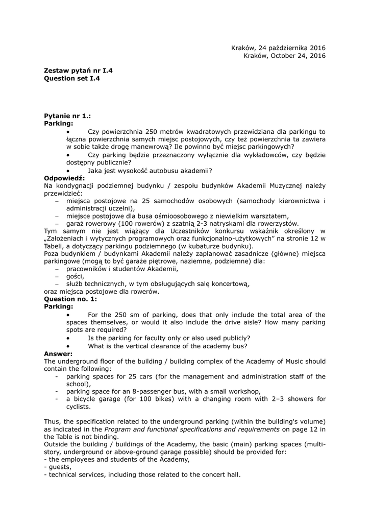 Kraków, 24 października 2016 Kraków, October 24, 2016 Zestaw pytań nr I.4 Question set I.4 Pytanie nr 1.: Parking: Czy powierzchnia 250 metrów kwadratowych przewidziana dla parkingu to łączna powierzchnia samych miejsc postojowych, czy też powierzchnia ta zawiera w sobie także drogę manewrową? Ile powinno być miejsc parkingowych? Czy parking będzie przeznaczony wyłącznie dla wykładowców, czy będzie dostępny publicznie? Jaka jest wysokość autobusu akademii? Odpowiedź: Na kondygnacji podziemnej budynku / zespołu budynków Akademii Muzycznej należy przewidzieć: miejsca postojowe na 25 samochodów osobowych (samochody kierownictwa i administracji uczelni), miejsce postojowe dla busa ośmioosobowego z niewielkim warsztatem, garaż rowerowy (100 rowerów) z szatnią 2-3 natryskami dla rowerzystów. Tym samym nie jest wiążący dla Uczestników konkursu wskaźnik określony w „Założeniach i wytycznych programowych oraz funkcjonalno-użytkowych” na stronie 12 w Tabeli, a dotyczący parkingu podziemnego (w kubaturze budynku). Poza budynkiem / budynkami Akademii należy zaplanować zasadnicze (główne) miejsca parkingowe (mogą to być garaże piętrowe, naziemne, podziemne) dla: pracowników i studentów Akademii, gości, służb technicznych, w tym obsługujących salę koncertową, oraz miejsca postojowe dla rowerów. Question no. 1: Parking: For the 250 sm of parking, does that only include the total area of the spaces themselves, or would it also include the drive aisle? How many parking spots are required? Is the parking for faculty only or also used publicly? What is the vertical clearance of the academy bus? Answer: The underground floor of the building / building complex of the Academy of Music should contain the following: - parking spaces for 25 cars (for the management and administration staff of the school), - parking space for an 8-passenger bus, with a small workshop, - a bicycle garage (for 100 bikes) with a changing room with 2–3 showers for cyclists. Thus, the specification related to the underground parking (within the building's volume) as indicated in the Program and functional specifications and requirements on page 12 in the Table is not binding. Outside the building / buildings of the Academy, the basic (main) parking spaces (multistory, underground or above-ground garage possible) should be provided for: - the employees and students of the Academy, - guests, - technical services, including those related to the concert hall. There should also be bike parking spaces. Pytanie nr 2: Sala prób orkiestry i chóru: W dokumencie 2.3 na stronie 7 programu dla sal prób orkiestry i chóru przewidziano łączną powierzchnię 150 m2; na stronie 13 sala prób chóru i orkiestry wymienione są oddzielnie z oddzielnymi wymaganiami, podano 150m2 dla sali prób chóru i 200–250 m2 dla sali prób orkiestry. Plik z wymaganiami akustycznymi także wymienia te sale jako oddzielne na stronach 7–10. Prosimy o wyjaśnienie, czy powinniśmy przewidzieć dwie oddzielne sale. Odpowiedź: Należy przewidzieć dwa osobne pomieszczenia: sala prób dla chóru – optymalna powierzchnia: ok. 150 m2. sala prób dla orkiestry – optymalna powierzchnia: 200-250 m2. Należy też przewidzieć, zgodnie z zapisem na stronie 13 dokumentu „Założenia i wytyczne programowe oraz funkcjonalno-użytkowe” pokój dla dyrygenta chóru: (10 m2). Sale prób powinny mieć magazyn – może to być jeden wspólny magazyn dla obu sal prób: sali prób chóru i sali prób orkiestry (o powierzchni ok. 70 m2). Question no. 2: Orchestra and choir rehearsal room: The program in document 2.3 on page 7 groups Orchestra and Choir rehearsal room with a total area of 150sm; on page 13, the choir rehearsal room and orchestra rehearsal room are listed separately with separate requirements, with 150sm for the choir rehearsal room and 200-250sm for the orchestra rehearsal room. The acoustical document 2.5 also lists the rooms as separate on pages 7-10. Please advise if we should provide two separate rooms. Answer: There should be two separate rooms: - a choir rehearsal room – optimum surface: c. 150 m2 - an orchestra rehearsal – optimum surface: 200–250 m2 The project should also include, as specified on page 13 of the document Program and functional specifications and requirements, a room for the choir conductor (10m2). The rehearsal rooms should be have a storage room – this may be one common storage space for both rehearsal rooms: the choir rehearsal room and the orchestra rehearsal room (about 70 m2). Pytanie nr 3: Gościnna sala prób orkiestry: Na stronie 11 programu w pliku 2.3 wyszczególniono 150 m2 zaplecza dla orkiestr gościnnych, które ma być wykorzystywane jako sale ćwiczeniowe dla akademii. Prosimy o wyjaśnienie, czy ma to być jedna sala wielkości 150m2 czy kilka mniejszych sal. Odpowiedź: Powinna to być jedna sala, z możliwością podziału, w razie takiej potrzeby, na kilka (np.3-4) mniejszych sal. Question no. 3: Guest Orchestra Rehearsal Room: The program in document 2.3 on page 11 lists 150sm for backrooms for guest orchestra, which are also to be used as practice rooms for the academy. Please clarify if this is one room at 150sm, or several rooms at smaller sizes. Answer: This should be one room, which can be divided, if there is such need, into several (for example, 3–4) smaller rooms. Pytanie nr 4: Centrum Dokumentacji Twórczości Kompozytorów Krakowskich: Czy Centrum Dokumentacji Twórczości Kompozytorów Krakowskich wymienione w programie ma w zamierzeniu pełnić funkcję publiczną, i jeśli nie, to czy może? Odpowiedź: Założyć należy, że Centrum może w przyszłości pełnić funkcję publiczną. Question no. 4: Documentation Center of Krakow Composer’s Output: Is the Documentation Center of Krakow Composer’s Output in the program meant to have a public function, and if not, can it? Answer: It should be assumed that the Center may h