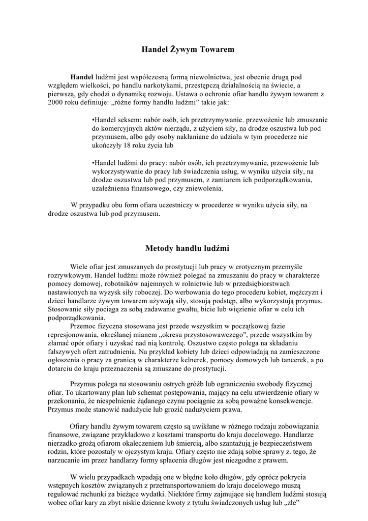Handel Żywym Towarem Handel ludźmi jest współczesną formą niewolnictwa, jest obecnie drugą pod względem wielkości, po handlu narkotykami, przestępczą działalnością na świecie, a pierwszą, gdy chodzi o dynamikę rozwoju. Ustawa o ochronie ofiar handlu żywym towarem z 2000 roku definiuje: „różne formy handlu ludźmi” takie jak: •Handel seksem: nabór osób, ich przetrzymywanie. przewożenie lub zmuszanie do komercyjnych aktów nierządu, z użyciem siły, na drodze oszustwa lub pod przymusem, albo gdy osoby nakłaniane do udziału w tym procederze nie ukończyły 18 roku życia lub •Handel ludźmi do pracy: nabór osób, ich przetrzymywanie, przewożenie lub wykorzystywanie do pracy lub świadczenia usług, w wyniku użycia siły, na drodze oszustwa lub pod przymusem, z zamiarem ich podporządkowania, uzależnienia finansowego, czy zniewolenia. W przypadku obu form ofiara uczestniczy w procederze w wyniku użycia siły, na drodze oszustwa lub pod przymusem. Metody handlu ludźmi Wiele ofiar jest zmuszanych do prostytucji lub pracy w erotycznym przemyśle rozrywkowym. Handel ludźmi może również polegać na zmuszaniu do pracy w charakterze pomocy domowej, robotników najemnych w rolnictwie lub w przedsiębiorstwach nastawionych na wyzysk siły roboczej. Do werbowania do tego procederu kobiet, mężczyzn i dzieci handlarze żywym towarem używają siły, stosują podstęp, albo wykorzystują przymus. Stosowanie siły pociąga za sobą zadawanie gwałtu, bicie lub więzienie ofiar w celu ich podporządkowania. Przemoc fizyczna stosowana jest przede wszystkim w początkowej fazie represjonowania, określanej mianem „okresu przystosowawczego", przede wszystkim by złamać opór ofiary i uzyskać nad nią kontrolę. Oszustwo często polega na składaniu fałszywych ofert zatrudnienia. Na przykład kobiety lub dzieci odpowiadają na zamieszczone ogłoszenia o pracy za granicą w charakterze kelnerek, pomocy domowych lub tancerek, a po dotarciu do kraju przeznaczenia są zmuszane do prostytucji. Przymus polega na stosowaniu ostrych gróźb lub ograniczeniu swobody fizycznej ofiar. To ukartowany plan lub schemat postępowania, mający na celu utwierdzenie ofiary w przekonaniu, że niespełnienie żądanego czynu pociągnie za sobą poważne konsekwencje. Przymus może stanowić nadużycie lub grozić nadużyciem prawa. Ofiary handlu żywym towarem często są uwikłane w różnego rodzaju zobowiązania finansowe, związane przykładowo z kosztami transportu do kraju docelowego. Handlarze nierzadko grożą ofiarom okaleczeniem lub śmiercią, albo szantażują je bezpieczeństwem rodzin, które pozostały w ojczystym kraju. Ofiary często nie zdają sobie sprawy z. tego, że narzucanie im przez handlarzy formy spłacenia długów jest niezgodne z prawem. W wielu przypadkach wpadają one w błędne koło długów, gdy oprócz pokrycia wstępnych kosztów związanych z przetransportowaniem do kraju docelowego muszą regulować rachunki za bieżące wydatki. Niektóre firmy zajmujące się handlem ludźmi stosują wobec ofiar kary za zbyt niskie dzienne kwoty z tytułu świadczonych usług lub „złe” zachowanie, które powodują dalsze powiększanie zadłużenia. Większość ofiar nigdy nie widzi zarabianych rzekomo pieniędzy, a nawet nie zna konkretnej kwoty swojego „długu". Nawet jeśli ofiary czują, że takie uzależnienie wynikające z zaciągniętego długu jest niesprawiedliwe, trudno jest im znaleźć pomoc ze względu na bariery językowe, społeczne i fizyczne, które powstrzymują je przed szukaniem wsparcia. Przepisy karne dotyczące handlu ludźmi: Art. 204. § l. Kto. w celu osiągnięcia korzyści majątkowej, nakłania inną osobę do uprawiania prostytucji lub jej to ułatwia, podlega karze pozbawienia wolności do lat 3. § 2. Karze określonej w § l podlega, kto czerpie korzyści majątkowe z uprawiania prostytucji przez inną osobę. £ 3. Jeżeli osoba określona w § l lub 2 jest małoletnim, sprawca podlega karze pozbawienia wolności od roku do lat 10. § 4. Karze określonej w § 3 podlega, kto zwabia lub uprowadza inną osobę w celu uprawiania prostytucji za granicą. Art. 253. § l. Kto uprawia handel ludźmi nawet za ich zgodą, podlega karze pozbawienia wolności na czas nie krótszy od lat 3. § 2. Kto, w celu osiągnięcia korzyści majątkowej, zajmuje się organizowaniem adopcji dzieci wbrew przepisom ustawy, podlega karze pozbawienia wolności od 3 miesięcy do lat 5. Art. 8.PPDKK Kto powoduje oddanie innej osoby w stan niewolnictwa albo uprawia handel niewolnikami, podlega karze pozbawienia wolności na czas nie krótszy od lat 3. Przepisy pozostające najczęściej w zbiegu z przestępstwem handlu ludźmi. Art. 189. § 1. Kto pozbawia człowieka wolności, podlega karze pozbawienia wolności od 3 miesięcy do lat 5. § 2. Jeżeli pozbawienie wolności trwało dłużej niż 7 dni lub łączyło się ze szczególnym udręczeniem, sprawca podlega karze pozbawienia wolności od roku do lat 10. Art. 190. § 1. Kto grozi innej osobie popełnieniem przestępstwa na jej szkodę lub szkodę osoby najbliższej, jeżeli groźba wzbudza w zagrożonym uzasadnioną obawę, że będzie spełniona, podlega grzywnie, karze ograniczenia wolności albo pozbawienia wolności do lat 2. § 2. Ściganie następuje na wniosek pokrzywdzonego. Art. 191. § 1. Kto stosuje przemoc wobec osoby lub groźbę bezprawną w celu zmuszenia innej osoby do określonego działania, zaniechania lub znoszenia, podlega karze pozbawienia wolności do lat 3. § 2. Jeżeli sprawca działa w sposób określony w § l w celu wymuszenia zwrotu wierzytelności, podlega karze pozbawienia wolności od 3 miesięcy do lat 5. Art. 197. § 1. Kto przemocą, groźbą bezprawną lub podstępem doprowadza inną osobę do obcowania płciowego, podlega karze pozbawienia wolności od roku do lat 10. § 2. Jeżeli sprawca, w sposób określony w § 1, doprowadza inną osobę do poddan