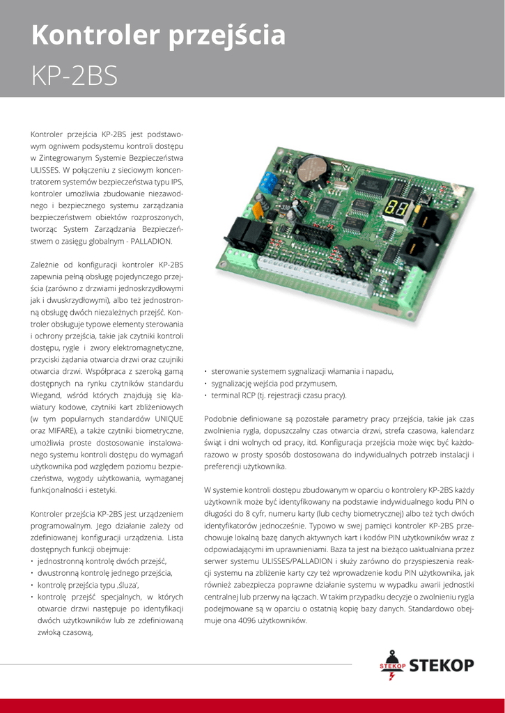Kontroler przejścia KP-2BS Kontroler przejścia KP-2BS jest podstawowym ogniwem podsystemu kontroli dostępu w Zintegrowanym Systemie Bezpieczeństwa ULISSES. W połączeniu z sieciowym koncentratorem systemów bezpieczeństwa typu IPS, kontroler umożliwia zbudowanie niezawodnego i bezpiecznego systemu zarządzania bezpieczeństwem obiektów rozproszonych, tworząc System Zarządzania Bezpieczeństwem o zasięgu globalnym - PALLADION. Zależnie od konfiguracji kontroler KP-2BS zapewnia pełną obsługę pojedynczego przejścia (zarówno z drzwiami jednoskrzydłowymi jak i dwuskrzydłowymi), albo też jednostronną obsługę dwóch niezależnych przejść. Kontroler obsługuje typowe elementy sterowania i ochrony przejścia, takie jak czytniki kontroli dostępu, rygle i zwory elektromagnetyczne, przyciski żądania otwarcia drzwi oraz czujniki otwarcia drzwi. Współpraca z szeroką gamą • sterowanie systemem sygnalizacji włamania i napadu, dostępnych na rynku czytników standardu • sygnalizację wejścia pod przymusem, Wiegand, wśród których znajdują się kla- • terminal RCP (tj. rejestracji czasu pracy). wiatury kodowe, czytniki kart zbliżeniowych (w tym popularnych standardów UNIQUE Podobnie definiowane są pozostałe parametry pracy przejścia, takie jak czas oraz MIFARE), a także czytniki biometryczne, zwolnienia rygla, dopuszczalny czas otwarcia drzwi, strefa czasowa, kalendarz umożliwia proste dostosowanie instalowa- świąt i dni wolnych od pracy, itd. Konfiguracja przejścia może więc być każdo- nego systemu kontroli dostępu do wymagań razowo w prosty sposób dostosowana do indywidualnych potrzeb instalacji i użytkownika pod względem poziomu bezpie- preferencji użytkownika. czeństwa, wygody użytkowania, wymaganej funkcjonalności i estetyki. W systemie kontroli dostępu zbudowanym w oparciu o kontrolery KP-2BS każdy użytkownik może być identyfikowany na podstawie indywidualnego kodu PIN o Kontroler przejścia KP-2BS jest urządzeniem długości do 8 cyfr, numeru karty (lub cechy biometrycznej) albo też tych dwóch programowalnym. Jego działanie zależy od identyfikatorów jednocześnie. Typowo w swej pamięci kontroler KP-2BS prze- zdefiniowanej konfiguracji urządzenia. Lista chowuje lokalną bazę danych aktywnych kart i kodów PIN użytkowników wraz z dostępnych funkcji obejmuje: odpowiadającymi im uprawnieniami. Baza ta jest na bieżąco uaktualniana przez • jednostronną kontrolę dwóch przejść, serwer systemu ULISSES/PALLADION i służy zarówno do przyspieszenia reak- • dwustronną kontrolę jednego przejścia, cji systemu na zbliżenie karty czy też wprowadzenie kodu PIN użytkownika, jak • kontrolę przejścia typu ‚śluza’, również zabezpiecza poprawne działanie systemu w wypadku awarii jednostki • kontrolę przejść specjalnych, w których centralnej lub przerwy na łączach. W takim przypadku decyzje o zwolnieniu rygla otwarcie drzwi następuje po identyfikacji podejmowane są w oparciu o ostatnią kopię bazy danych. Standardowo obej- dwóch użytkowników lub ze zdefiniowaną muje ona 4096 użytkowników. zwłoką czasową, Lokalna baza danych może również zostać załadowana z zewnętrznego komputera, bez podłączania kontrolera KP-2BS do systemów ULISSES/PALLADION. Przejście pracuje wtedy w trybie autonomicznym. Instalacja, konfiguracja oraz zarządzanie kontrolerami KP-2BS pracującymi w trybie autonomicznym są wspomagane przez program serwisowy KPView. Umożliwia on konfigurację przejścia (dostępne typy to: przejście jednostronne, przejście dwustronne, przejście typu śluza, przejście specjalne z koincydencją, przejście z funkcją rejestracji czasu pracy), testowanie parametrów łącza RS485, odczyt aktualnych stanów wejść i wyjść kontrolera, programowanie bazy danych użytkowników, definiowanie stref czasowych, a także odczyt historii zdarzeń. Podstawowe dane techniczne Klasa rozpoznania (wg PN-EN 50133-1) ............................................................................................................ 0/1/2/3 (zależnie od konfiguracji) Klasa dostępu (wg PN-EN 50133-1) …........................................................................................................................................................................... B Pamięć użytkowników …......................................................................................................................................................................... 4096 rekordów Pamięć zdarzeń ….................................................................................................................................................................................. 32767 rekordów Strefy czasowe.............................................................................................................. 32 tygodniowe strefy z dodatkowym dniem świątecznym Podtrzymanie pamięci przy całkowitym odłączeniu zasilania: pamięć użytkowników …...................................................................................................................................................................................... 10 lat pamięć zdarzeń …................................................................................................................................................................................................ 10 lat zegar RTC .............................................................................................................................................................................................................. 3 lata Wejścia: czytniki ................................................................................................................................................. 2 czytniki Wiegand 26/31/37 albo RS-485 uniwersalne wejścia dwustanowe …...................................................................................
