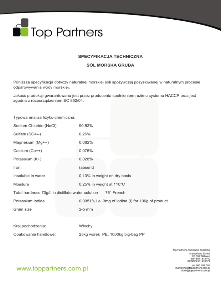 SPECYFIKACJA TECHNICZNA SÓL MORSKA GRUBA Poniższa specyfikacja dotyczy naturalnej morskiej soli spożywczej pozyskiwanej w naturalnym procesie odparowywania wody morskiej. Jakość produkcji gwarantowana jest przez producenta spełnieniem reżimu systemu HACCP oraz jest zgodna z rozporządzeniem EC 852/04. Typowa analiza fizyko-chemiczna: Sodium Chloride (NaCl) 99,52% Sulfate (SO4--) 0,26% Magnesium (Mg++) 0,082% Calcium (Ca++) 0,075% Potassium (K+) 0,028% Iron (absent) Insoluble in water 0,10% in weight on dry basis Moisture 0,25% in weight at 110°C Total hardness 70g/lt in distillate water solution 76° French Potassium Iodide 0,0051% i.e. 3mg of iodine (I) for 100g of product Grain size 2-5 mm Kraj pochodzenia: Włochy Opakowanie handlowe: 25kg worek PE, 1000kg big-bag PP