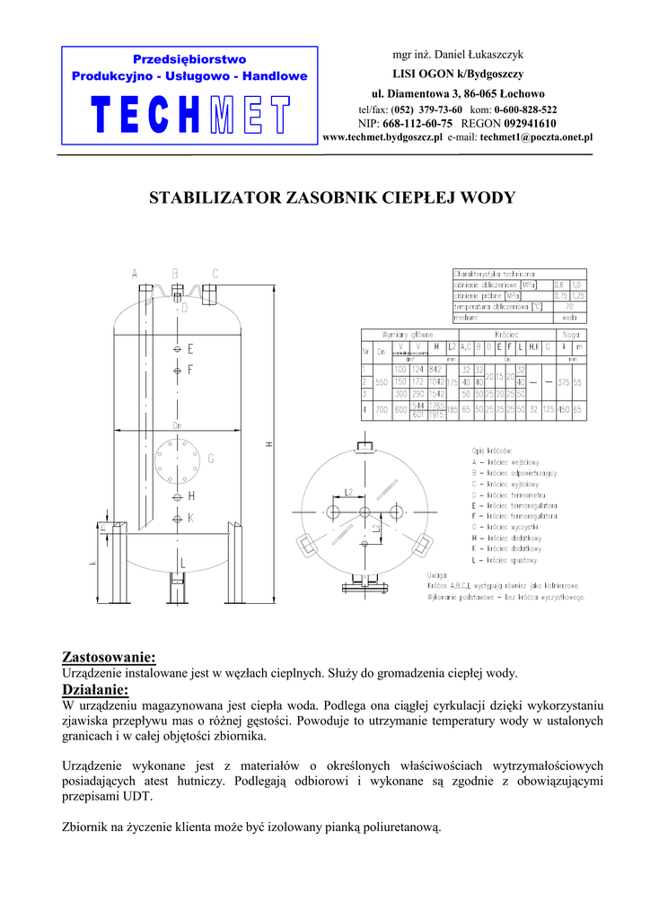 Przedsiębiorstwo Produkcyjno - Usługowo - Handlowe mgr inŜ. Daniel Łukaszczyk LISI OGON k/Bydgoszczy ul. Diamentowa 3, 86-065 Łochowo tel/fax: (052) 379-73-60 kom: 0-600-828-522 NIP: 668-112-60-75 REGON 092941610 www.techmet.bydgoszcz.pl e-mail: [email protected] STABILIZATOR ZASOBNIK CIEPŁEJ WODY Zastosowanie: Urządzenie instalowane jest w węzłach cieplnych. SłuŜy do gromadzenia ciepłej wody. Działanie: W urządzeniu magazynowana jest ciepła woda. Podlega ona ciągłej cyrkulacji dzięki wykorzystaniu zjawiska przepływu mas o róŜnej gęstości. Powoduje to utrzymanie temperatury wody w ustalonych granicach i w całej objętości zbiornika. Urządzenie wykonane jest z materiałów o określonych właściwościach wytrzymałościowych posiadających atest hutniczy. Podlegają odbiorowi i wykonane są zgodnie z obowiązującymi przepisami UDT. Zbiornik na Ŝyczenie klienta moŜe być izolowany pianką poliuretanową.