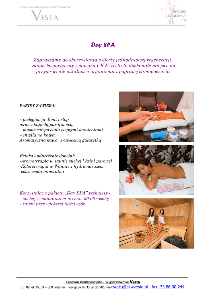 NOCLEGI RESTAURACJE SPA Day SPA Zapraszamy do skorzystania z oferty jednodniowej regeneracji. Salon kosmetyczny i masażu CKW Vesta to doskonałe miejsce na przywrócenie witalności organizmu i poprawę samopoczucia PAKIET ZAWIERA: – pielęgnacja dłoni i stóp wraz z kąpielą parafinową – masaż całego ciała ciepłymi kamieniami – chwila na kawę: Aromatyczna kawa z owocową galaretką Relaks i odprężenie dopełni: -Aromaterapia w saunie suchej i łaźni parowej -Koloroterapia w Wannie z hydromasażem -soki, woda mineralna Korzystając z pakietu „Day SPA” zyskujesz - nocleg ze śniadaniem w cenie 90,00/osobę - zniżki przy większej ilości osób Vesta Recepcja tel 33 86 36 506, mail:[email protected] fax: 33 86 00 244 Centrum Konferencyjno - Wypoczynkowe Ul. Rynek 15, 34 – 300 Jeleśnia