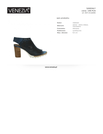 SANDAŁY cena: 199 PLN art: 4671 K2 JEANS opis produktu Kolor: niebieski Wierzch: zamsz - skóra cielęca, cieniowana Futrówka: skórzana Podeszwa: syntetyczna Wys. obcasa: 9,5 cm