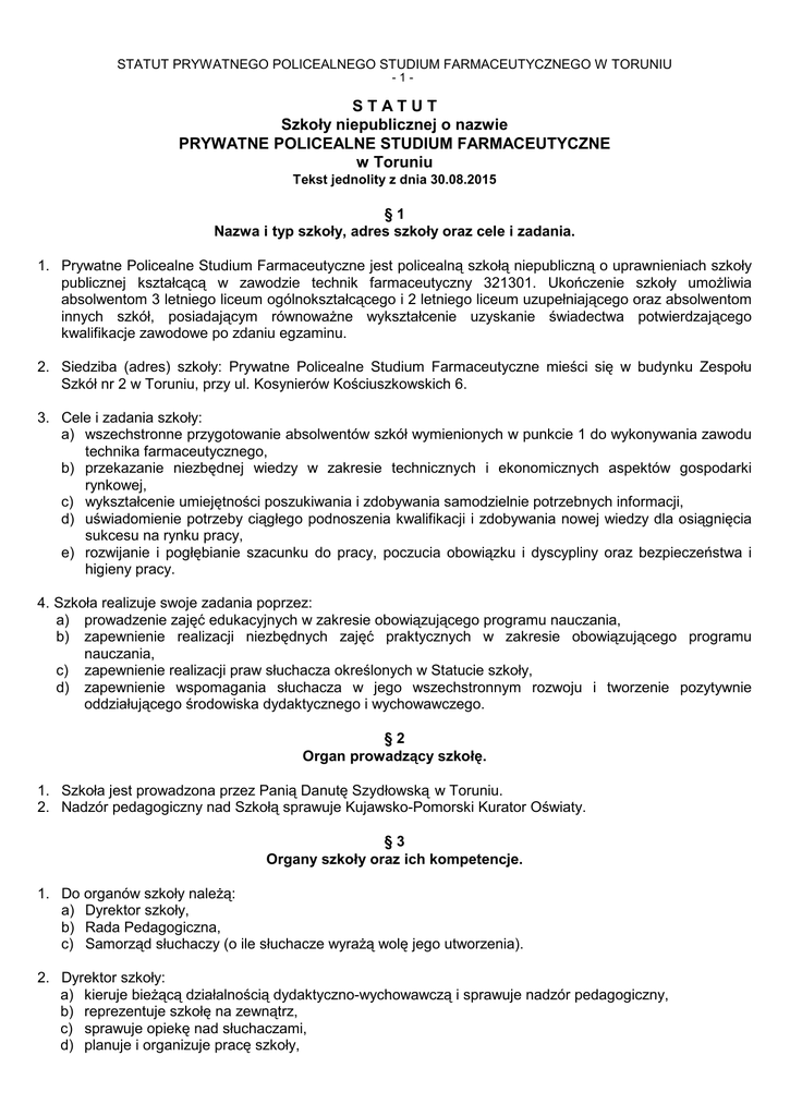 Statut PPSF - Prywatne Policealne Studium Farmaceutyczne w