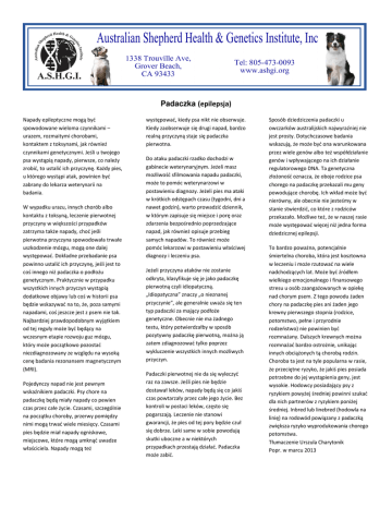 Padaczka (epilepsja) Napady epileptyczne mogą być spowodowane wieloma czynnikami – urazem, rozmaitymi chorobami, kontaktem z toksynami, jak również czynnikami genetycznymi. Jeśli u twojego psa wystąpią napady, pierwsze, co należy zrobić, to ustalić ich przyczynę. Każdy pies, u którego wystąpi atak, powinien być zabrany do lekarza weterynarii na badania. W wypadku urazu, innych chorób albo kontaktu z toksyną, leczenie pierwotnej przyczyny w większości przypadków zatrzyma także napady, choć jeśli pierwotna przyczyna spowodowała trwałe uszkodzenie mózgu, mogą one dalej występować. Dokładne przebadanie psa powinno ustalić ich przyczynę, jeśli jest to coś innego niż padaczka o podłożu genetycznym. Praktycznie w przypadku wszystkich innych przyczyn wystąpią dodatkowe objawy lub coś w historii psa będzie wskazywać na to, że, poza samymi napadami, coś jeszcze jest z psem nie tak. Najbardziej prawdopodobnym wyjątkiem od tej reguły może być będący na wczesnym etapie rozwoju guz mózgu, który może początkowo pozostać niezdiagnozowany ze względu na wysoką cenę badania rezonansem magnetycznym (MRI). Pojedynczy napad nie jest pewnym wskaźnikiem padaczki. Psy chore na padaczkę będą miały napady co pewien czas przez całe życie. Czasami, szczególnie na początku choroby, przerwy pomiędzy nimi mogą trwać wiele miesięcy. Czasami pies będzie miał napady ogniskowe, miejscowe, które mogą umknąć uwadze właściciela. Napady mogą też występować, kiedy psa nikt nie obserwuje. Kiedy zaobserwuje się drugi napad, bardzo realną przyczyną staje się padaczka pierwotna. Do ataku padaczki rzadko dochodzi w gabinecie weterynaryjnym. Jeżeli masz możliwość sfilmowania napadu padaczki, może to pomóc weterynarzowi w postawieniu diagnozy. Jeżeli pies ma ataki w krótkich odstępach czasu (tygodni, dni a nawet godzin), warto prowadzić dziennik, w którym zapisuje się miejsce i porę oraz zdarzenia bezpośrednio poprzedzające napad, jak również opisuje przebieg samych napadów. To również może pomóc lekarzowi w postawieniu właściwej diagnozy i leczeniu psa. Jeżeli przyczyna ataków nie zostanie odkryta, klasyfikuje się je jako padaczkę pierwotną czyli idiopatyczną. „Idiopatyczna” znaczy „o nieznanej przyczynie”, ale generalnie uważa się ten typ padaczki za mający podłoże genetyczne. Obecnie nie ma żadnego testu, który potwierdzałby w sposób pozytywny padaczkę pierwotną, można ją zatem zdiagnozować tylko poprzez wykluczenie wszystkich innych możliwych przyczyn. Padaczki pierwotnej nie da się wyleczyć raz na zawsze. Jeśli pies nie będzie dostawał leków, napady będą się co jakiś czas powtarzały przez całe jego życie. Bez kontroli w postaci leków, często się pogarszają. Leczenie nie stanowi gwarancji, że pies od tej pory będzie czuł się dobrze. Leki same w sobie powodują skutki uboczne a w niektórych przypadkach przestają działać. Padaczka może zabić. Sposób dziedziczenia padaczki u owczarków australijskich najwyraźniej nie jest prosty. Dotychczasowe badania wskazują, że może być ona warunkowana przez wiele genów albo też współdziałanie genów i wpływającego na ich działanie regulatorowego DNA. Ta genetyczna złożoność oznacza, że oboje rodzice psa chorego na padaczkę przekazali mu geny powodujące chorobę. Ich wkład może być nierówny, ale obecnie nie jesteśmy w stanie stwierdzić, co które z rodziców przekazało. Możliwe też, że w naszej rasie może występować więcej niż jedna forma dziedzicznej epilepsji. To bardzo poważna, potencjalnie śmiertelna choroba, która jest kosztowna w leczeniu i może rzutować na wiele nadchodzących lat. Może być źródłem wielkiego emocjonalnego i finansowego stresu u osób zaangażowanych w opiekę nad chorym psem. Z tego powodu żaden chory na padaczkę pies ani żaden jego krewny pierwszego stopnia (rodzice, potomstwo, pełne i przyrodnie rodzeństwo) nie powinien być rozmnażany. Dalszych krewnych można rozmnażać bardzo ostrożnie, unikając innych obciążonych tą chorobą rodzin. Choroba ta jest na tyle popularna w rasie, że przeciętne ryzyko, że jakiś pies posiada potrzebne do jej wystąpienia geny, jest wysokie. Hodowcy posiadający psy z ryzykiem powyżej średniej powinni szukać dla nich partnerów z ryzykiem poniżej średniej. Inbred lub linebred (hodowla na linię) na rodowód powiązany z padaczką zwiększa ryzyko wyprodukowania chorego potomstwa. Tłumaczenie Urszula Charytonik Popr. w marcu 2013