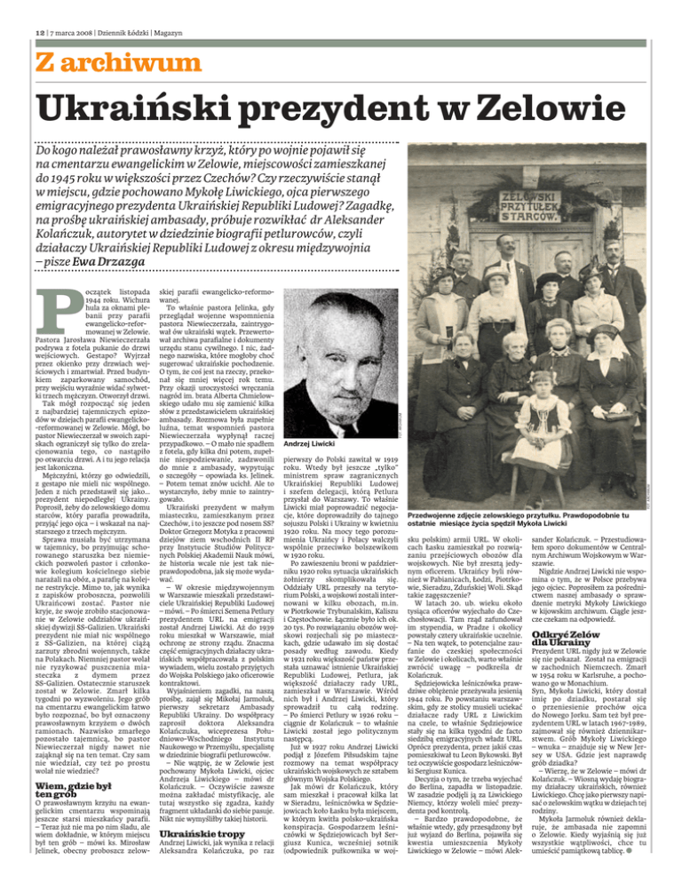 12 | 7 marca 2008 | Dziennik Łódzki | Magazyn Z archiwum Ukraiński prezydent w Zelowie Wiem, gdzie był ten grób O prawosławnym krzyżu na ewangelickim cmentarzu wspominają jeszcze starsi mieszkańcy parafii. – Teraz już nie ma po nim śladu, ale wiem dokładnie, w którym miejscu był ten grób – mówi ks. Mirosław Jelinek, obecny proboszcz zelow- skiej parafii ewangelicko-reformowanej. To właśnie pastora Jelinka, gdy przeglądał wojenne wspomnienia pastora Niewieczerzała, zaintrygował ów ukraiński wątek. Przewertował archiwa parafialne i dokumenty urzędu stanu cywilnego. I nic, żadnego nazwiska, które mogłoby choć sugerować ukraińskie pochodzenie. O tym, że coś jest na rzeczy, przekonał się mniej więcej rok temu. Przy okazji uroczystości wręczania nagród im. brata Alberta Chmielowskiego udało mu się zamienić kilka słów z przedstawicielem ukraińskiej ambasady. Rozmowa była zupełnie luźna, temat wspomnień pastora Niewieczerzała wypłynął raczej przypadkowo. – O mało nie spadłem z fotela, gdy kilka dni potem, zupełnie niespodziewanie, zadzwonili do mnie z ambasady, wypytując o szczegóły – opowiada ks. Jelinek. – Potem temat znów ucichł. Ale to wystarczyło, żeby mnie to zaintrygowało. Ukraiński prezydent w małym miasteczku, zamieszkanym przez Czechów, i to jeszcze pod nosem SS? Doktor Grzegorz Motyka z pracowni dziejów ziem wschodnich II RP przy Instytucie Studiów Politycznych Polskiej Akademii Nauk mówi, że historia wcale nie jest tak nieprawdopodobna, jak się może wydawać. – W okresie międzywojennym w Warszawie mieszkali przedstawiciele Ukraińskiej Republiki Ludowej – mówi. – Po śmierci Semena Petlury prezydentem URL na emigracji został Andrzej Liwicki. Aż do 1939 roku mieszkał w Warszawie, miał ochronę ze strony rządu. Znaczna część emigracyjnych działaczy ukraińskich współpracowała z polskim wywiadem, wielu zostało przyjętych do Wojska Polskiego jako oficerowie kontraktowi. Wyjaśnieniem zagadki, na naszą prośbę, zajął się Mikołaj Jarmoluk, pierwszy sekretarz Ambasady Republiki Ukrainy. Do współpracy zaprosił doktora Aleksandra Kolańczuka, wiceprezesa Południowo-Wschodniego Instytutu Naukowego w Przemyślu, specjalistę w dziedzinie biografii petlurowców. – Nie wątpię, że w Zelowie jest pochowany Mykoła Liwicki, ojciec Andrzeja Liwickiego – mówi dr Kolańczuk. – Oczywiście zawsze można zakładać mistyfikację, ale tutaj wszystko się zgadza, każdy fragment układanki do siebie pasuje. Nikt nie wymyśliłby takiej historii. Ukraińskie tropy Andrzej Liwicki, jak wynika z relacji Aleksandra Kolańczuka, po raz Andrzej Liwicki pierwszy do Polski zawitał w 1919 roku. Wtedy był jeszcze „tylko” ministrem spraw zagranicznych Ukraińskiej Republiki Ludowej i szefem delegacji, którą Petlura przysłał do Warszawy. To właśnie Liwicki miał poprowadzić negocjacje, które doprowadziły do tajnego sojuszu Polski i Ukrainy w kwietniu 1920 roku. Na mocy tego porozumienia Ukraińcy i Polacy walczyli wspólnie przeciwko bolszewikom w 1920 roku. Po zawieszeniu broni w październiku 1920 roku sytuacja ukraińskich żołnierzy skomplikowała się. Oddziały URL przeszły na terytorium Polski, a wojskowi zostali internowani w kilku obozach, m.in. w Piotrkowie Trybunalskim, Kaliszu i Częstochowie. Łącznie było ich ok. 20 tys. Po rozwiązaniu obozów wojskowi rozjechali się po miasteczkach, gdzie udawało im się dostać posady według zawodu. Kiedy w 1921 roku większość państw przestała uznawać istnienie Ukraińskiej Republiki Ludowej, Petlura, jak większość działaczy rady URL, zamieszkał w Warszawie. Wśród nich był i Andrzej Liwicki, który sprowadził tu całą rodzinę. – Po śmierci Petlury w 1926 roku – ciągnie dr Kolańczuk – to właśnie Liwicki został jego politycznym następcą. Już w 1927 roku Andrzej Liwicki podjął z Józefem Piłsudskim tajne rozmowy na temat współpracy ukraińskich wojskowych ze sztabem głównym Wojska Polskiego. Jak mówi dr Kolańczuk, który sam mieszkał i pracował kilka lat w Sieradzu, leśniczówka w Sędziejowicach koło Łasku była miejscem, w którym kwitła polsko-ukraińska konspiracja. Gospodarzem leśniczówki w Sędziejowicach był Sergiusz Kunica, wcześniej sotnik (odpowiednik pułkownika w woj- FOT. ARCHIWUM P oczątek listopada 1944 roku. Wichura hula za oknami plebanii przy parafii ewangelicko-reformowanej w Zelowie. Pastora Jarosława Niewieczerzała podrywa z fotela pukanie do drzwi wejściowych. Gestapo? Wyjrzał przez okienko przy drzwiach wejściowych i zmartwiał. Przed budynkiem zaparkowany samochód, przy wejściu wyraźnie widać sylwetki trzech mężczyzn. Otworzył drzwi. Tak mógł rozpocząć się jeden z najbardziej tajemniczych epizodów w dziejach parafii ewangelicko-reformowanej w Zelowie. Mógł, bo pastor Niewieczerzał w swoich zapiskach ograniczył się tylko do zrelacjonowania tego, co nastąpiło po otwarciu drzwi. A i tu jego relacja jest lakoniczna. Mężczyźni, którzy go odwiedzili, z gestapo nie mieli nic wspólnego. Jeden z nich przedstawił się jako… prezydent niepodległej Ukrainy. Poprosił, żeby do zelowskiego domu starców, który parafia prowadziła, przyjąć jego ojca – i wskazał na najstarszego z trzech mężczyzn. Sprawa musiała być utrzymana w tajemnicy, bo przyjmując schorowanego staruszka bez niemieckich pozwoleń pastor i członkowie kolegium kościelnego siebie narażali na obóz, a parafię na kolejne restrykcje. Mimo to, jak wynika z zapisków proboszcza, pozwolili Ukraińcowi zostać. Pastor nie kryje, że swoje zrobiło stacjonowanie w Zelowie oddziałów ukraińskiej dywizji SS-Galizien. Ukraiński prezydent nie miał nic wspólnego z SS-Galizien, na której ciążą zarzuty zbrodni wojennych, także na Polakach. Niemniej pastor wolał nie ryzykować puszczenia miasteczka z dymem przez SS-Galizien. Ostatecznie staruszek został