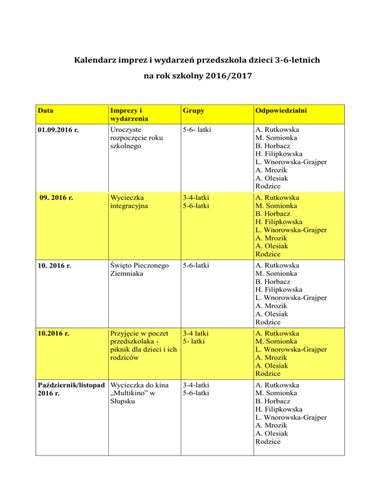 Kalendarz imprez i wydarzeń przedszkola dzieci 3-6-letnich na rok szkolny 2016/2017 Data Imprezy i wydarzenia Grupy Odpowiedzialni 01.09.2016 r. Uroczyste rozpoczęcie roku szkolnego 5-6- latki A. Rutkowska M. Somionka B. Horbacz H. Filipkowska L. Wnorowska-Grajper A. Mrozik A. Olesiak Rodzice 09. 2016 r. Wycieczka integracyjna 3-4-latki 5-6-latki A. Rutkowska M. Somionka B. Horbacz H. Filipkowska L. Wnorowska-Grajper A. Mrozik A. Olesiak Rodzice 10. 2016 r. Święto Pieczonego Ziemniaka 5-6-latki A. Rutkowska M. Somionka B. Horbacz H. Filipkowska L. Wnorowska-Grajper A. Mrozik A. Olesiak Rodzice 10.2016 r. Przyjęcie w poczet 3-4 latki przedszkolaka 5- latki piknik dla dzieci i ich rodziców A. Rutkowska M. Somionka L. Wnorowska-Grajper A. Mrozik A. Olesiak Rodzice Październik/listopad Wycieczka do kina „Multikino” w 2016 r. Słupsku 3-4-latki 5-6-latki A. Rutkowska M. Somionka B. Horbacz H. Filipkowska L. Wnorowska-Grajper A. Mrozik A. Olesiak Rodzice Data Imprezy i wydarzenia Grupy Odpowiedzialni 25.11.2016 r. Święto Pluszowego Misia 3-4 latki 5-6-latki A. Rutkowska M. Somionka B. Horbacz H. Filipkowska L. Wnorowska-Grajper A. Mrozik A. Olesiak Rodzice 30.11.2016 r. Andrzejki – dzień wróżb 3-4 latki 5-6-latki A. Rutkowska M. Somionka B. Horbacz H. Filipkowska L. Wnorowska-Grajper A. Mrozik A. Olesiak Rodzice 12.2016 r. Mikołajki 3-4 latki 5-6-latki A. Rutkowska M. Somionka B. Horbacz H. Filipkowska L. Wnorowska-Grajper A. Mrozik A. Olesiak Rodzice 12.2016 r. Spotkanie wigilijne „Jasełka” 3-4 latki 5-6-latki A. Rutkowska M. Somionka B. Horbacz H. Filipkowska L. Wnorowska-Grajper A. Mrozik A. Olesiak Rodzice 01.2017 r. Dzień Babci Dziadka 3-4 latki 5-6-latki A. Rutkowska M. Somionka B. Horbacz H. Filipkowska L. Wnorowska-Grajper A. Mrozik A. Olesiak Rodzice 02.2017 r. Bal karnawałowy A. Rutkowska M. Somionka B. Horbacz H. Filipkowska L. Wnorowska-Grajper A. Mrozik A. Olesiak 3-4-latki 5-6-latki Data Imprezy i wydarzenia Grupy Odpowiedzialni Rodzice 21.03.2017 r. Pierwszy Dzień Wiosny 3-4-latki 5-6-latki A. Rutkowska M. Somionka B. Horbacz H. Filipkowska L. Wnorowska-Grajper A. Mrozik A. Olesiak Rodzice Marzec/kwiecień 2017r. Wycieczka do teatru „Tęcza” w Słupsku 3-4-latki 5-6-latki A. Rutkowska M. Somionka B. Horbacz H. Filipkowska L. Wnorowska-Grajper A. Mrozik A. Olesiak Rodzice 04.2017r Wiosenny konkurs recytatorski 3-4 latki 5-6 latki A. Rutkowska M. Somionka B. Horbacz H. Filipkowska L. Wnorowska-Grajper A. Mrozik A. Olesiak Rodzice 05.2017r. Dzień Mamy i Taty – 3-4 latki piknik rodzinny 5-6-latki A. Rutkowska M. Somionka B. Horbacz H. Filipkowska L. Wnorowska-Grajper A. Mrozik O. Olesiak Rodzice Maj/czerwiec 2017 r. Wycieczka krajoznawcza 1.06.2017r Dzień Dziecka 3-4-latki 5-6-latki A. Rutkowska M. Somionka B. Horbacz H. Filipkowska L. Wnorowska-Grajper A. Mrozik A. Olesiak Rodzice 3-4 latki 5-6 latki A. Rutkowska M. Somionka B. Horbacz H. Filipkowska L. Wnorowska-Grajper A. Mrozik Data Imprezy i wydarzenia Grupy Odpowiedzialni A. Olesiak Rodzice 23.06.2017 r. Uroczyste zakończenie roku szkolnego 5-6-latki 30.06.2017r. Uroczyste pożegnanie 3-4 latki dzieci i rodziców B. Horbacz H. Filipkowska L. Wnorowska-Grajper A. Mrozik Rodzice A. Olesiak A. Rutkowska M. Somionka