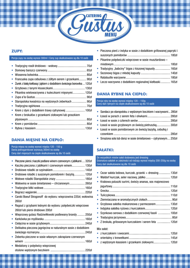 ZUPY: Porcja zupy na osobę wynosi 300ml | Ceny zup skalkulowane są dla 10 osób • • • • • • • • • • • • Tradycyjny rosół drobiowo - wołowy....................................... 70zł Domowy barszcz czerwony.................................................... 65zł Wiosenna botwinka................................................................ 80zł Francuska zupa cebulowa z żółtym serem i grzankami.......... 90zł Żurek z białą kiełbasą i jajkiem z dodatkiem świeżego borowika.... 120zł Grzybowa z lanymi kluseczkami........................................... 130zł Pikantna wielowarzywna z kuleczkami mięsnymi................. 120zł Zupa a’la Gustus.................................................................... 90zł Staropolska kwaśnica na wędzonych żeberkach.................... 90zł Tradycyjna ogórkowa............................................................. 70zł Krem z dyni z dodatkiem trawy cytrynowej.......................... 100zł Krem z brokułów z grzankami ziołowymi lub groszkiem ptysiowym............................................................................. 80zł • Krem z pomidorów................................................................. 80zł • Rybna z łososiem................................................................. 130zł DANIA MIĘSNE NA CIEPŁO: Porcja mięsa na osobę wynosi między 120 - 150 g Dania jednogarnkowe wynoszą 300ml na osobę Ceny dań mięsnych na ciepło skalkulowane są dla 10 osób • • • • • • • • • • • • • • • • Pieczone piersi z kaczki podlane winem czerwonym z jabłkami..... 320zł Kaczka pieczona z jabłkami i czerwonym winem.................. 130zł Drobiowe roladki ze szpinakiem........................................... 140zł Drobiowe roladki z suszonym pomidorem i bazylią............... 120zł Wołowe roladki Staropolskie zrazy....................................... 180zł Wołowina w sosie śmietanowo – chrzanowym..................... 260zł Tradycyjne bitki wołowe....................................................... 160zł Bogracz węgierski................................................................ 220zł Carski Boeuf Strogonoff do wyboru: .wieprzowina 220zł, wołowina 260zł Ragout z grzybami leśnymi do wyboru: polędwiczki wieprzowe 260zł lub piersi drobiowe 200zł Wieprzowy gulasz Radziwiłłowski podlewany brandy........... 250zł Karkówka po myśliwsku...................................................... 160zł Cielęcina w sosie grzybowym.............................................. 240zł Delikatna pieczona jagnięcina w naturalnym sosie z dodatkiem świeżego rozmarynu............................................................ 240zł Żeberka pieczone w sosie własnym zakrapiane czerwonym winem ................................................................................ 160zł Medaliony z polędwicy wieprzowej otulone wędzonym boczkiem .............................................. 220zł • Pieczona pierś z indyka w sosie z dodatkiem grillowanej papryki i suszonych pomidorów......................................................... 180zł • Pikantne polędwiczki wieprzowe w sosie musztardowo – miodowym........................................................................... 180zł • Tradycyjny „babciny” bigos z kiszonej kapusty..................... 160zł • Sezonowy bigos z młodej kapusty........................................ 140zł • Ratatouille warzywne........................................................... 180zł • Leczo warzywne z dodatkiem regionalnej kiełbaski.............. 165zł DANIA RYBNE NA CIEPŁO: Porcja ryby na osobę wynosi między 120 – 150g Ceny dań rybnych na ciepło skalkulowane są dla 10 osób • • • • • Sandacz po staropolsku z wędzonym boczkiem i warzywami.... 280zł Łosoś w porach z serem feta i oliwkami............................... 280zł Łosoś w sosie z czterech serów........................................... 280zł Łosoś w sosie grzybowym ze świeżą pietruszką................... 300zł Łosoś w sosie pomidorowym ze świeżą bazylią, cebulką i czosnkiem........................................................................... 280zł • Smażona sola lub dorsz w sosie śmietanowo – cytrynowym..... 250zł SAŁATKI: Do wszystkich mixów sałat dodawany jest dressing Gramatura sałatek w zależności od rodzaju wynosi między 200-250g na osobę Ceny dań skalkulowane są dla 10 osób • Cezar sałata lodowa, kurczak, grzanki + dressing................ 130zł • Waldorf kurczak, seler naciowy, jabłko................................. 120zł • Krabowa paluszki surimi, świeży ananas, sos majonezowo jogurtowy............................................................................. 110zł • Grecka................................................................................. 120zł • Tuńczykowa......................................................................... 110zł • Ziemniaczana w aromatycznych ziołach................................. 90zł • Grzybowa sałatka makaronowa z parmezanem.................... 130zł • Indyjska sałatka ryżowa z kurczakiem.................................. 120zł • Szynkowo serowa z dodatkiem czerwonej fasoli ................. 100zł • Tradycyjna jarzynowa............................................................. 80zł • Z brokuła, grilowanym kurczakiem i serem feta .................. 120zł Mix sałat: • z kurczakiem i owocami....................................................... 120zł • orientalny z krewetkami....................................................... 145zł • z wędzonym łososiem i grzankami ziołowymi....................... 120zł MIĘSA NA ZIMNO: Pasztet - foremka ok. 600g Ceny mięs na zimno skalkulowane są dla 10 osób • • • • • • • Domowy pasztet Gustus...............................................