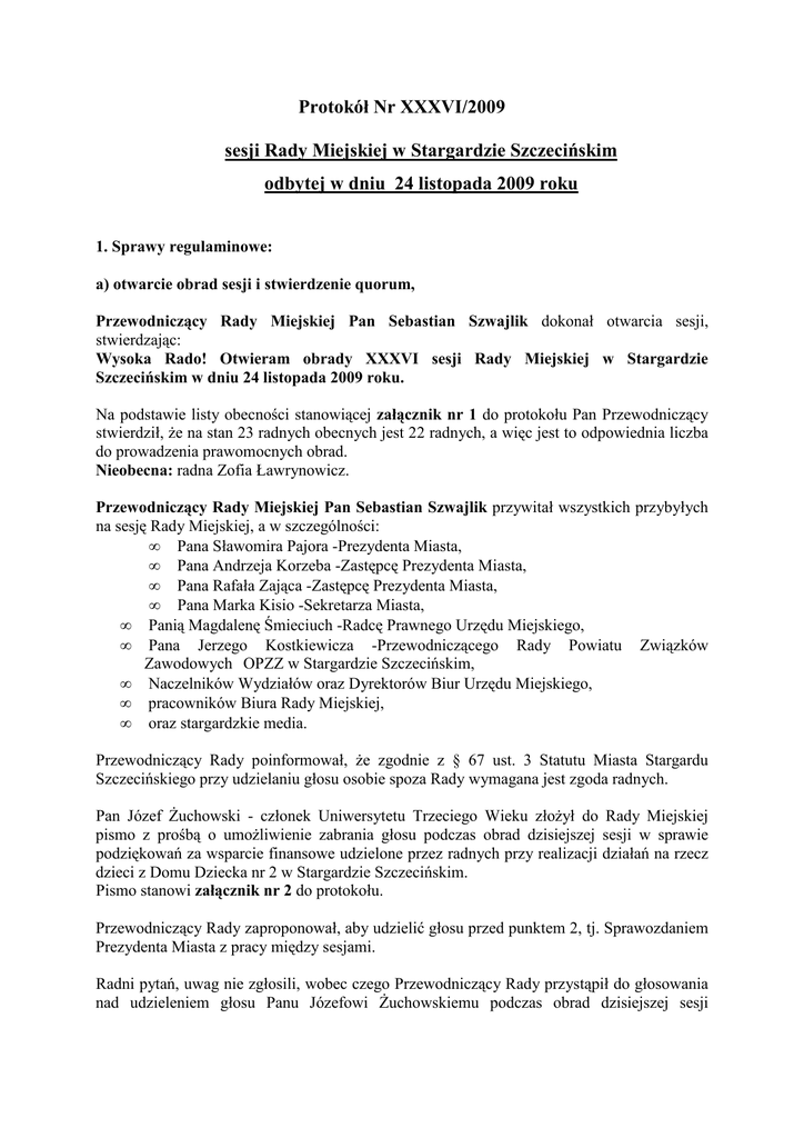 Protokół Nr XXXVI/2009 sesji Rady Miejskiej w Stargardzie Szczecińskim odbytej w dniu 24 listopada 2009 roku 1. Sprawy regulaminowe: a) otwarcie obrad sesji i stwierdzenie quorum, Przewodniczący Rady Miejskiej Pan Sebastian Szwajlik dokonał otwarcia sesji, stwierdzając: Wysoka Rado! Otwieram obrady XXXVI sesji Rady Miejskiej w Stargardzie Szczecińskim w dniu 24 listopada 2009 roku. Na podstawie listy obecności stanowiącej załącznik nr 1 do protokołu Pan Przewodniczący stwierdził, że na stan 23 radnych obecnych jest 22 radnych, a więc jest to odpowiednia liczba do prowadzenia prawomocnych obrad. Nieobecna: radna Zofia Ławrynowicz. Przewodniczący Rady Miejskiej Pan Sebastian Szwajlik przywitał wszystkich przybyłych na sesję Rady Miejskiej, a w szczególności: • Pana Sławomira Pajora -Prezydenta Miasta, • Pana Andrzeja Korzeba -Zastępcę Prezydenta Miasta, • Pana Rafała Zająca -Zastępcę Prezydenta Miasta, • Pana Marka Kisio -Sekretarza Miasta, • Panią Magdalenę Śmieciuch -Radcę Prawnego Urzędu Miejskiego, • Pana Jerzego Kostkiewicza -Przewodniczącego Rady Powiatu Związków Zawodowych OPZZ w Stargardzie Szczecińskim, • Naczelników Wydziałów oraz Dyrektorów Biur Urzędu Miejskiego, • pracowników Biura Rady Miejskiej, • oraz stargardzkie media. Przewodniczący Rady poinformował, że zgodnie z § 67 ust. 3 Statutu Miasta Stargardu Szczecińskiego przy udzielaniu głosu osobie spoza Rady wymagana jest zgoda radnych. Pan Józef Żuchowski - członek Uniwersytetu Trzeciego Wieku złożył do Rady Miejskiej pismo z prośbą o umożliwienie zabrania głosu podczas obrad dzisiejszej sesji w sprawie podziękowań za wsparcie finansowe udzielone przez radnych przy realizacji działań na rzecz dzieci z Domu Dziecka nr 2 w Stargardzie Szczecińskim. Pismo stanowi załącznik nr 2 do protokołu. Przewodniczący Rady zaproponował, aby udzielić głosu przed punktem 2, tj. Sprawozdaniem Prezydenta Miasta z pracy między sesjami. Radni pytań, uwag nie zgłosili, wobec czego Przewodniczący Rady przystąpił do głosowania nad udzieleniem głosu Panu Józefowi Żuchowskiemu podczas obrad dzisiejszej sesji w sprawie podziękowań za wsparcie finansowe udzielone przez radnych przy realizacji działań na rzecz dzieci z Domu Dziecka nr 2 w Stargardzie Szczecińskim. W wyniku głosowania Rada jednogłośnie przy 21 głosach za (1 osoba nie brała udziału w głosowaniu, obecna na sali obrad) wyraziła zgodę na udzielenie głosu na dzisiejszej sesji Panu Józefowi Żuchowskiemu. Radni przed sesją otrzymali porządek obrad wraz z projektami uchwał, autopoprawką i dwiema informacjami. Porządek obrad stanowi załącznik nr 3 do protokołu. Przewodniczący Rady poinformował, że na podstawie art.20 ust.1a rada może wprowadzić zmiany w porządku obrad bezwzględną większością głosów ustawowego składu rady. Natomiast § 50 ust. 3 Statutu Miasta Stargardu Szczecińskiego uprawnia każdego radnego oraz Prezydenta Miasta do wystąpienia z wnioskiem o zmianę porządku obrad. Komisja Budżetu, Finansów i Rozwoju po ponownym rozpatrzeniu wniosku właścicieli działki nr 425 dotyczącego udzielenia bonifikaty przy sprzedaży działki nr 424 położonej przy ulicy Generała Władysława Sikorskiego w Stargardzie Szczecińskim przedłożyła do rozpatrzenia Wysokiej Radzie inicjatywę uchwałodawczą w sprawie odmowy wyrażenia zgody na udzielenie bonifikaty przy sprzedaży w trybie bezprzetargowym nieruchomości stanowiącej własność miasta Stargard Szczeciński. Przewodniczący Rady zaproponował, aby projekt uchwały wprowadzić do porządku obrad jako punkt 12. Radni pytań, uwag nie zgłosili, wobec czego Przewodniczący Rady przystąpił do głosowania nad zmianą porządku obrad polegającą na wprowadzeniu do porządku obrad jako punktu 12 projektu uchwały w sprawie odmowy wyrażenia zgody na udzielenie bonifikaty przy sprzedaży w trybie bezprzetargowym nieruchomości stanowiącej własność miasta Stargard Szczeciński. W wyniku głosowania Rada bezwzględną większością głosów przy 21 głosach za i 1 przeciw dokonała zmiany porządku obrad polegającej na wprowadzeniu do porządku obrad jako punktu 12 projektu uchwały w sprawie odmowy wyrażenia zgody na udzielenie bonifikaty przy sprzedaży w trybie bezprzetargowym nieruchomości stanowiącej własność miasta Stargard Szczeciński. W związku z przegłosowaną zmianą projekt uchwały będzie rozpatrywany jako punkt 12 porządku obrad, wobec czego Pan Przewodniczący poprosił radnych o naniesienie stosownych zmian w numeracji porządku obrad. Komisja Gospodarcza po ponownym rozpatrzeniu wniosku właścicieli działki nr 425 dotyczącego udzielenia bonifikaty przy sprzedaży działki nr 424 położonej przy ulicy Generała Władysława Sikorskiego w Stargardzie Szczecińskim przedłożyła do rozpatrzenia Wysokiej Radzie inicjatywę uchwałodawczą w sprawie wyrażenia zgody na udzielenie bonifikaty przy sprzedaży w trybie bezprzetargowym nieruchomości stanowiącej własność miasta Stargard Szczeciński. Przewodniczący Rady zaproponował, aby projekt uchwały wprowadzić do porządku obrad jako punkt 13. 2 Radni pytań, uwag nie zgłosili, wobec czego Przewodniczący Rady przystąpił do głosowania nad zmianą porządku obrad polegającą na wprowadzeniu do porządku obrad jako punktu 13 projektu uchwały w sprawie wyrażenia zgody na udzielenie bonifikaty przy sprzedaży w trybie bezprzetargowym nieruchomości stanowiącej własność miasta Stargard Szczeciński. W wyniku głosowania Rada bezwzględną większością głosów przy 12 głosach za i 7 przeciw (3 osoby nie brały udziału w głosowaniu, obecne na sali obrad) dokonała zmiany porządku obrad polegającej na wprowadzeniu do porządku obrad jako punktu 13 projektu uchwały w sprawie wyrażenia zgody na udzielenie bonifikaty przy sprzedaży w trybie bezprzetargowym nieruchomości stanowiącej własność m