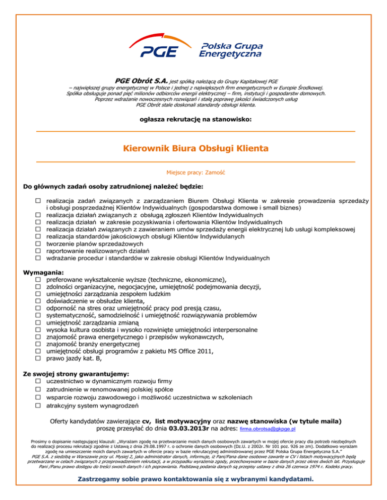PGE Obrót S.A. jest spółką należącą do Grupy Kapitałowej PGE – największej grupy energetycznej w Polsce i jednej z największych firm energetycznych w Europie Środkowej. Spółka obsługuje ponad pięć milionów odbiorców energii elektrycznej – firm, instytucji i gospodarstw domowych. Poprzez wdrażanie nowoczesnych rozwiązań i stałą poprawę jakości świadczonych usług PGE Obrót stale doskonali standardy obsługi klienta. ogłasza rekrutację na stanowisko: _______________________________________________________________ Kierownik Biura Obsługi Klienta _______________________________________________________________ Miejsce pracy: Zamość Do głównych zadań osoby zatrudnionej należeć będzie: realizacja zadań związanych z zarządzaniem Biurem Obsługi Klienta w zakresie prowadzenia sprzedaży i obsługi posprzedażnej Klientów Indywidualnych (gospodarstwa domowe i small biznes) realizacja działań związanych z obsługą zgłoszeń Klientów Indywidualnych realizacja działań w zakresie pozyskiwania i ofertowania Klientów Indywidualnych realizacja działań związanych z zawieraniem umów sprzedaży energii elektrycznej lub usługi kompleksowej realizacja standardów jakościowych obsługi Klientów Indywidulanych tworzenie planów sprzedażowych raportowanie realizowanych działań wdrażanie procedur i standardów w zakresie obsługi Klientów Indywidualnych Wymagania: preferowane wykształcenie wyższe (techniczne, ekonomiczne), zdolności organizacyjne, negocjacyjne, umiejętność podejmowania decyzji, umiejętności zarządzania zespołem ludzkim doświadczenie w obsłudze klienta, odporność na stres oraz umiejętność pracy pod presją czasu, systematyczność, samodzielność i umiejętność rozwiązywania problemów umiejętność zarządzania zmianą wysoka kultura osobista i wysoko rozwinięte umiejętności interpersonalne znajomość prawa energetycznego i przepisów wykonawczych, znajomość branży energetycznej umiejętność obsługi programów z pakietu MS Office 2011, prawo jazdy kat. B, Ze swojej strony gwarantujemy: uczestnictwo w dynamicznym rozwoju firmy zatrudnienie w renomowanej polskiej spółce wsparcie rozwoju zawodowego i możliwość uczestnictwa w szkoleniach atrakcyjny system wynagrodzeń Oferty kandydatów zawierające cv, list motywacyjny oraz nazwę stanowiska (w tytule maila) proszę przesyłać do dnia 03.03.2013r na adres: [email protected] Prosimy o dopisanie następującej klauzuli: „Wyrażam zgodę na przetwarzanie moich danych osobowych zawartych w mojej ofercie pracy dla potrzeb niezbędnych do realizacji procesu rekrutacji zgodnie z Ustawą z dnia 29.08.1997 r. o ochronie danych osobowych (Dz.U. z 2002r. Nr 101 poz. 926 ze zm). Dodatkowo wyrażam zgodę na umieszczenie moich danych zawartych w ofercie pracy w bazie rekrutacyjnej administrowanej przez PGE Polska Grupa Energetyczna S.A.” PGE S.A. z siedzibą w Warszawie przy ul. Mysiej 2, jako administrator danych, informuje, iż Pani/Pana dane osobowe zawarte w CV i listach motywacyjnych będą przetwarzane w celach związanych z przeprowadzeniem rekrutacji, a w przypadku wyrażenia zgody, przechowywane w bazie danych przez okres dwóch lat. Przysługuje Pani /Panu prawo dostępu do treści swoich danych i ich poprawiania. Podstawą podania danych są przepisy ustawy z dnia 26 czerwca 1974 r. Kodeks pracy. Zastrzegamy sobie prawo kontaktowania się z wybranymi kandydatami.