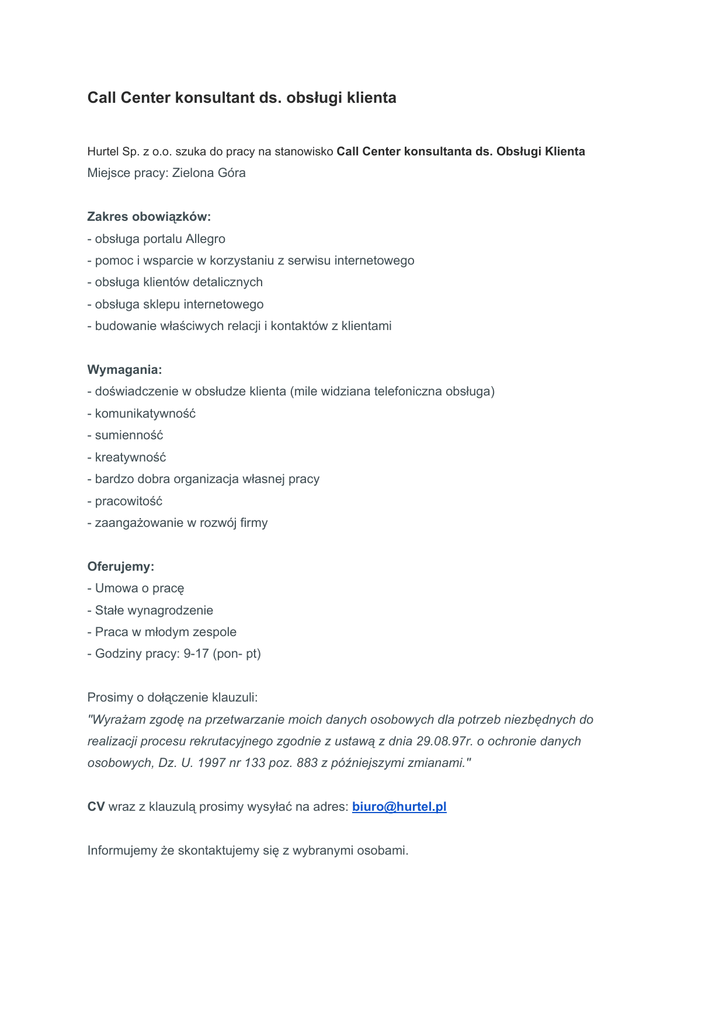 Call Center konsultant ds. obsługi klienta Hurtel Sp. z o.o. szuka do pracy na stanowisko Call Center konsultanta ds. Obsługi Klienta Miejsce pracy: Zielona Góra Zakres obowiązków: obsługa portalu Allegro pomoc i wsparcie w korzystaniu z serwisu internetowego obsługa klientów detalicznych obsługa sklepu internetowego budowanie właściwych relacji i kontaktów z klientami Wymagania: doświadczenie w obsłudze klienta (mile widziana telefoniczna obsługa) komunikatywność sumienność kreatywność bardzo dobra organizacja własnej pracy pracowitość zaangażowanie w rozwój firmy Oferujemy: Umowa o pracę Stałe wynagrodzenie Praca w młodym zespole Godziny pracy: 917 (pon pt) Prosimy o dołączenie klauzuli: "Wyrażam zgodę na przetwarzanie moich danych osobowych dla potrzeb niezbędnych do realizacji procesu rekrutacyjnego zgodnie z ustawą z dnia 29.08.97r. o ochronie danych osobowych, Dz. U. 1997 nr 133 poz. 883 z późniejszymi zmianami." CV wraz z klauzulą prosimy wysyłać na adres: [email protected] Informujemy że skontaktujemy się z wybranymi osobami.