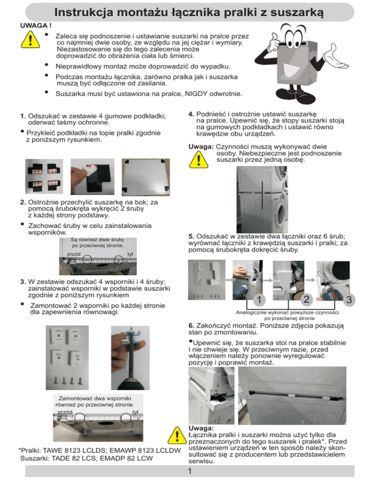 Instrukcja montażu łącznika pralki z suszarką UWAGA ! • • • • Zaleca się podnoszenie i ustawianie suszarki na pralce przez co najmniej dwie osoby, ze względu na jej ciężar i wymiary. Niezastosowanie się do tego zalecenia może doprowadzić do obrażenia ciała lub śmierci. Nieprawidłowy montaż może doprowadzić do wypadku. Podczas montażu łącznika, zarówno pralka jak i suszarka muszą być odłączone od zasilania. Suszarka musi być ustawiona na pralce, NIGDY odwrotnie. 1. Odszukać w zestawie 4 gumowe podkładki; oderwać taśmy ochronne. • Przykleić podkładki na topie pralki zgodnie z poniższym rysunkiem. 4. Podnieść i ostrożnie ustawić suszarkę na pralce. Upewnić się, że stopy suszarki stoją na gumowych podkładkach i ustawić równo krawędzie obu urządzeń. Uwaga: Czynności muszą wykonywać dwie osoby. Niebezpieczne jest podnoszenie suszarki przez jedną osobę. 2. Ostrożnie przechylić suszarkę na bok; za pomocą śrubokręta wykręcić 2 śruby z każdej strony podstawy. • Zachować śruby w celu zainstalowania wsporników. Są również dwie śruby po przeciwnej stronie. przód tył 5. Odszukać w zestawie dwa łączniki oraz 6 śrub; wyrównać łączniki z krawędzią suszarki i pralki; za pomocą śrubokręta dokręcić śruby. 3. W zestawie odszukać 4 wsporniki i 4 śruby; zainstalować wsporniki w podstawie suszarki zgodnie z poniższym rysunkiem • 1 Zamontować 2 wsporniki po każdej stronie dla zapewnienia równowagi. 2 3 Analogicznie wykonać powyższe czynności po przeciwnej stronie 6. Zakończyć montaż. Poniższe zdjęcia pokazują stan po zmontowaniu. •Upewnić się, że suszarka stoi na pralce stabilnie i nie chwieje się. W przeciwnym razie, przed włączeniem należy ponownie wyregulować pozycję i poprawić montaż. Zamontować dwa wsporniki również po przeciwnej stronie przód tył *Pralki: TAWE 8123 LCLDS; EMAWP 8123 LCLDW Suszarki: TADE 82 LCS; EMADP 82 LCW Uwaga: Łącznika pralki i suszarki można użyć tylko dla przeznaczonych do tego suszarek i pralek*. Przed ustawieniem urządzeń w ten sposób należy skonsultować się z producentem lub przedstawicielem serwisu. 1