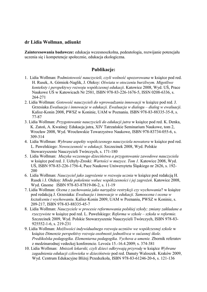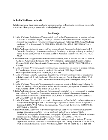 dr Lidia Wollman, adiunkt Zainteresowania badawcze: edukacja wczesnoszkolna, pedeutologia, rozwijanie potencjału uczenia się i kompetencje społecznie, edukacja ekologiczna. Publikacje: 1. Lidia Wollman: Podmiotowość nauczycieli, czyli wolność upozorowana w książce pod red. H. Rusek, A. Górniok-Naglik, J. Oleksy: Oświata w otoczeniu burzliwym. Migotliwe konteksty i perspektywy rozwoju współczesnej edukacji. Katowice 2008, Wyd. UŚ, Prace Naukowe UŚ w Katowicach Nr 2581, ISBN 978-83-226-1676-5, ISSN 0208-6336, s. 264-271 2. Lidia Wollman: Gotowość nauczycieli do wprowadzania innowacji w książce pod red. J. Grzesiaka Ewaluacja i innowacje w edukacji. Ewaluacja w dialogu – dialog w ewaluacji. Kalisz-Konin 2008, PWSZ w Koninie, UAM w Poznaniu. ISBN 978-83-88335-35-8, s. 77-87 3. Lidia Wollman: Przygotowanie nauczycieli do edukacji jutra w książce pod red. K. Denka, K. Zatoń, A. Kwaśnej: Edukacja jutra, XIV Tatrzańskie Seminarium Naukowe, tom 2, Wrocław 2008, Wyd. Wrocławskie Towarzystwo Naukowe, ISBN 978-83734-055-6, s. 309-314 4. Lidia Wollman: Wybrane aspekty współczesnego nauczyciela nowatora w książce pod red. L. Pawelskiego: Nowoczesność w edukacji. Szczecinek 2008, Wyd. Polskie Stowarzyszenie Nauczycieli Twórczych, s. 171-180 5. Lidia Wollman: Muzyka wczesnego dzieciństwa a przygotowanie zawodowe nauczyciela w książce pod red. J. Uchyły-Zroski: Wartości w muzyce. Tom 1. Katowice 2008, Wyd. UŚ, ISBN 978-83-226-1756-4, Pace Naukowe Uniwersytetu Śląskiego nr 2626, s. 192200 6. Lidia Wollman: Nauczyciel jako zagrożenie w rozwoju ucznia w książce pod redakcją H. Rusek i J. Oleksy: Młode pokolenie wobec współczesności i jej zagrożeń. Katowice 2008, Wyd. Gnome ISBN 978-83-87819-06-2, s. 11-19 7. Lidia Wollman: Ocena z zachowania jako narzędzie restrykcji czy wychowania? w książce pod redakcją J. Grzesiaka: Ewaluacja i innowacje w edukacji. Samoocena i ocena w kształceniu i wychowaniu. Kalisz-Konin 2009, UAM w Poznaniu, PWSZ w Koninie, s. 209-217, ISBN 978-83-88335-45-7 8. Lidia Wollman: Nauczyciele w procesie reformowania polskiej szkoły; zmiany zakładane a rzeczywiste w książce pod red. L. Pawelskiego: Reforma w szkole – szkoła w reformie. Szczecinek 2009, Wyd. Polskie Stowarzyszenie Nauczycieli Twórczych, ISBN 978-83925552-1-6, s. 219-231 9. Lidia Wollman: Możliwości indywidualnego rozwoju uczniów we współczesnej szkole w książce Dimenzie perspektivy rozvoja osobnosti jednotlivca w sućasnej śkole. Predśkolska pedagogika. Elementarna pedagogika. Vychova a umenie. Zbornik referatov z medzinarodnej vedeckej konferencie. Levoća 15.-16.4.2009; s. 374-381 10. Lidia Wollman: Mniszek lekarski, czyli dzieci odkrywają przyrodę w książce Wybrane zagadnienia edukacji człowieka w dzieciństwie pod red. Danuty Waloszek. Kraków 2009, Wyd. Centrum Edukacyjne Bliżej Przedszkola, ISBN 978-83-61246-20-6, s. 121-136 11. Lidia Wollman: Szanse innowacyjności nauczycieli i uczniów we współczesnej szkole polskiej w książce pod red. J. Piekarskiego, E. Czarneckiej, A. Głowali: Pedagogika tom 8. Kształcenie pedagogów – strategie, koncepcje, idee. „Język – komunikacja – etyczność – twórczość“, część II O efektywności w procesie ksztalcenia. Zeszyty Naukowe PWSZ w Płocku, Płock 2009, Wyd. PWSZ w Płocku, PRINTPAP, s. 39 – 50 12. Lidia Wollman: Kreatywność jako działanie edukacyjne w serii „Nauczyciele – Nauczycielom“ w książce pod red. W. Korzeniowskiej, A. Murzyna, U. Szuścik: Sztuka bycia uczniem i nauczycielem. Z zagadnień pedagogiki współbycia. Studia, rozprawy i szkice – z okazji jubileuszu dziesięciolecia serii „Nauczyciele – Nauczycielom“. Kraków 2009, Impuls, ISBN 978-83-7308-929-7, s. 61-66 13. Lidia Wollman: O kilku metaforach dobrej szkoły w książce pod red. Czesława Plewki: Ku dobrej szkole. Cywilizacyjne dylematy współczesnej edukacji. Tom 1, SzczecinRadom-Warszawa 2009, Wyd. Naukowe Instytutu Technologii Eksploatacji – PIB, s. 207-214 14. Lidia Wollman: Kształtowanie przyszłego człowieka we współczesnej szkole w książce pod red. M. Szczepańskiego i J. Wróblewskiej-Jachna: Społeczności lokalne i regionalne – metaomorfozy tożsamości zbiorowych. Bielsko-Biała 2009, Wyd. ATH w BielskuBiałej, s. 309-320 15. Lidia Wollman: Czynniki warunkujące adaptację zawodową nauczycieli w książce pod red. J. Szempruch i M. Blachnik-Gęsiarz (red.): Adaptacja zawodowa nauczyciela. Częstochowa 2009, Wyd. Wyższej Szkoły Lingwistycznej, s. 53-62 16. Lidia Wollman: Różnorodność i znaczenie dziecięcych zabaw w kontaktach z przyrodą w książce pod red. B. Dymary: Dziecko w świecie zabawy. Kraków 2009, Impuls, s. 229238 17. Lidia Wollman: Adaptacja zawodowa nauczyciela przedszkola w „Bliżej Przedszkola“ nr 9.108 wrzesień 2010, s. 37-41 18. Lidia Wollman: Wymagania stawiane nauczycielom w książce pod red. D. Waloszek: Edukacja przedszkolna i wczesnoszkolna. Kraków 2010, Wyd. Centrum Edukacyjne Bliżej Przedszkola, s. 115-124 19. Lidia Wollman: Wycieczki jako forma kształtowania kompetencji społecznych dzieci i młodzieży w książce pod red. W. Łozowieckiej z zespołem: Turystyczna oświata w Ukrainie: problemy i perspektywy. Zbiór prac naukowych, Lwów 2010, Wyd. Ministerstwo Oświaty i Nauki Ukrainy, Ministerstwo Kultury i Turystyki Ukrainy, s. 126-132 20. Lidia Wollman: Wprowadzanie dziecka w świat wartości (nie tylko muzycznych) a przygotowanie zawodowe nauczyciela, w książce pod red. J. Uchyły-Zroski: Wartości w muzyce, tom 3 Zarys współczesnych badań nad wartościami w muzyce. Katowice 2010, Wydawnictwo Uniwersytetu Śląskiego, s. 284-293 21. Lidia Wollman: Edukacja ekologiczna dzieci niepełnosprawnych w książce pod red. A. Klinik: Osobliwości zabiegów terapetycznych w otwartym środowisku społecznym. Problemy rehabilitacji i socjalizacji osób niepełnosprawnych. Tom 12 serii. Kraków 2010, Impuls. ISBN: 978-83-758