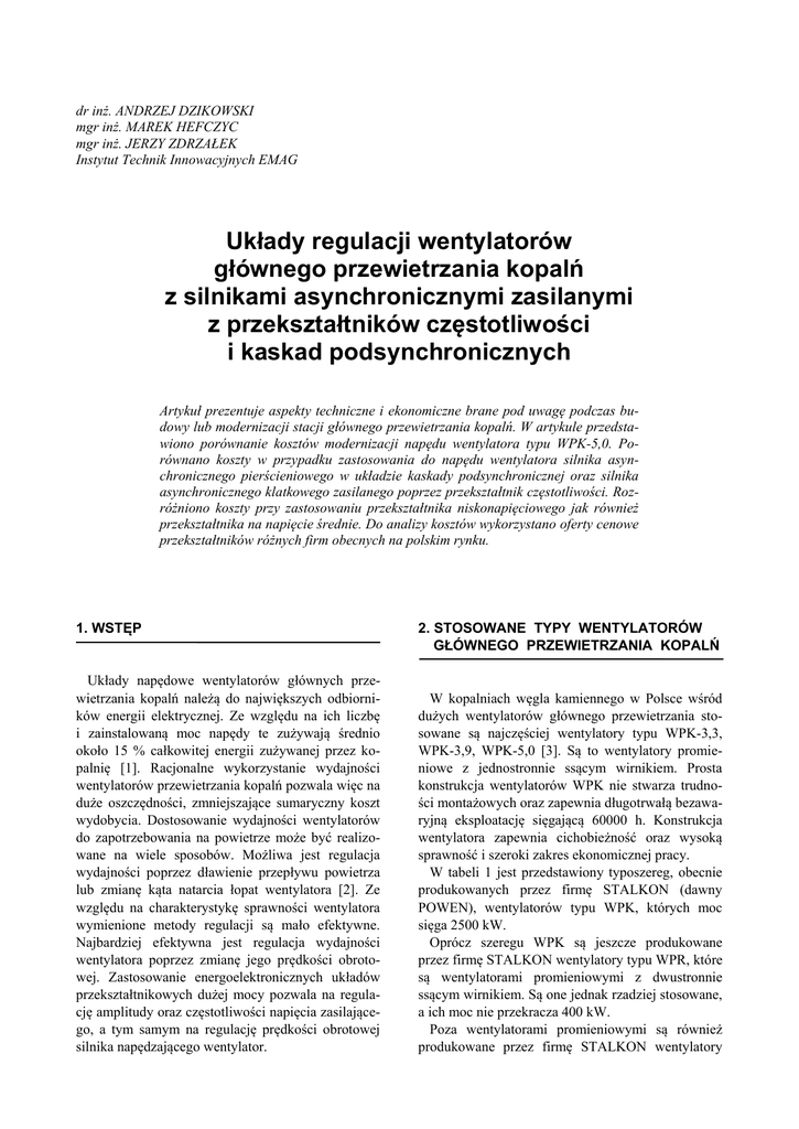 dr inż. ANDRZEJ DZIKOWSKI mgr inż. MAREK HEFCZYC mgr inż. JERZY ZDRZAŁEK Instytut Technik Innowacyjnych EMAG Układy regulacji wentylatorów głównego przewietrzania kopalń z silnikami asynchronicznymi zasilanymi z przekształtników częstotliwości i kaskad podsynchronicznych Artykuł prezentuje aspekty techniczne i ekonomiczne brane pod uwagę podczas budowy lub modernizacji stacji głównego przewietrzania kopalń. W artykule przedstawiono porównanie kosztów modernizacji napędu wentylatora typu WPK-5,0. Porównano koszty w przypadku zastosowania do napędu wentylatora silnika asynchronicznego pierścieniowego w układzie kaskady podsynchronicznej oraz silnika asynchronicznego klatkowego zasilanego poprzez przekształtnik częstotliwości. Rozróżniono koszty przy zastosowaniu przekształtnika niskonapięciowego jak również przekształtnika na napięcie średnie. Do analizy kosztów wykorzystano oferty cenowe przekształtników różnych firm obecnych na polskim rynku. 1. WSTĘP Układy napędowe wentylatorów głównych przewietrzania kopalń należą do największych odbiorników energii elektrycznej. Ze względu na ich liczbę i zainstalowaną moc napędy te zużywają średnio około 15 % całkowitej energii zużywanej przez kopalnię [1]. Racjonalne wykorzystanie wydajności wentylatorów przewietrzania kopalń pozwala więc na duże oszczędności, zmniejszające sumaryczny koszt wydobycia. Dostosowanie wydajności wentylatorów do zapotrzebowania na powietrze może być realizowane na wiele sposobów. Możliwa jest regulacja wydajności poprzez dławienie przepływu powietrza lub zmianę kąta natarcia łopat wentylatora [2]. Ze względu na charakterystykę sprawności wentylatora wymienione metody regulacji są mało efektywne. Najbardziej efektywna jest regulacja wydajności wentylatora poprzez zmianę jego prędkości obrotowej. Zastosowanie energoelektronicznych układów przekształtnikowych dużej mocy pozwala na regulację amplitudy oraz częstotliwości napięcia zasilającego, a tym samym na regulację prędkości obrotowej silnika napędzającego wentylator. 2. STOSOWANE TYPY WENTYLATORÓW GŁÓWNEGO PRZEWIETRZANIA KOPALŃ W kopalniach węgla kamiennego w Polsce wśród dużych wentylatorów głównego przewietrzania stosowane są najczęściej wentylatory typu WPK-3,3, WPK-3,9, WPK-5,0 [3]. Są to wentylatory promieniowe z jednostronnie ssącym wirnikiem. Prosta konstrukcja wentylatorów WPK nie stwarza trudności montażowych oraz zapewnia długotrwałą bezawaryjną eksploatację sięgającą 60000 h. Konstrukcja wentylatora zapewnia cichobieżność oraz wysoką sprawność i szeroki zakres ekonomicznej pracy. W tabeli 1 jest przedstawiony typoszereg, obecnie produkowanych przez firmę STALKON (dawny POWEN), wentylatorów typu WPK, których moc sięga 2500 kW. Oprócz szeregu WPK są jeszcze produkowane przez firmę STALKON wentylatory typu WPR, które są wentylatorami promieniowymi z dwustronnie ssącym wirnikiem. Są one jednak rzadziej stosowane, a ich moc nie przekracza 400 kW. Poza wentylatorami promieniowymi są również produkowane przez firmę STALKON wentylatory MECHANIZACJA I AUTOMATYZACJA GÓRNICTWA 32 Typoszereg wentylatorów głównego przewietrzania KWK typu WPK Typ i wielkość wentylatora WPK 2,6 wersja I WPK 2,6 wersja II WPK 2,6 wersja III WPK 3,1 WPK 3,3 WPK 3,9 WPK 5,0 WPK 5,3 Prędkość obrotowa n [obr./sek.] (obr./min.) 8,33 (500) 10,0 (600) 12,5 (750) 8,33 (500) 10,0 (600) 12,5 (750) 8,33 (500) 10,0 (600) 12,5 (750) 8,33 (500) 10,0 (600) 8,33 (500) 10,0 (600) 5,0 (300) 6,25 (375) 8,33 (500) 5,0 (300) 6,25 (375) 5,0 (300) 6,25 (375) Wydajność V [m3/s] 45,6 54,7 68,4 58,8 70,6 88,3 74 88,8 111,1 127,8 153,2 150 180,7 150 187 250 292 365 366,6 458,3 Spiętrzenie całkowite ∆Pc [Pa] 1568 2259 3530 1828 2634 4115 1950 2810 4390 3198 4611 3139 4525 1550 2433 4400 2904 4542 3139 4905 1 Sprawność η Moc N [kW] 0,85 0,85 0,85 0,85 0,85 0,85 0,86 0,86 0,86 0,88 0,88 0,86 0,86 0,86 0,86 0,86 0,85 0,85 0,85 0,85 84 145 284 126 219 428 168 290 566 462 798 547 951 270 529 1279 992 1939 1300 2540 Tabela 1 Masa bez silnika m [kg] 11034 13142 13123 21300 21705 25770 48300 50438 Rys. 1. Charakterystyki pracy wentylatorów typu WPK osiowe typu WOK. Wentylatory te mają przestawne łopatki wirników, co pozwala na regulację parametrów wentylatora. Ich moc nie przekracza 600 kW. Do napędu wentylatorów szeregu WPK są stosowane silniki o mocach od kilkuset do 2500 kW, co przedstawia tabela 1. O wyborze wentylatora decyduje przede wszystkim wymagana wydajność i wymagane całkowite spiętrzenie powietrza. Na rys. 1 jest przedstawiony typowy zakres pracy wentylatorów typoszeregu WPK [3]. W szczególności na podstawie charakterystyki przedstawionej na rys. 2 dla wentylatora WPK 5,3 przy prędkości obrotowej n = 6,25 obr/s (375 1 Źródło danych - http://www.stalkon.pl/wentylatory_WPKgl.html obr/min) do napędu jest potrzebny silnik o mocy 2700 kW, natomiast przy prędkości obrotowej n = 5 obr/s (300 obr/min.) do napędu tego samego wentylatora jest potrzebny silnik o mocy już tylko 1400 kW. Czyli spadek prędkości obrotowej wentylatora o 20% pociąga za sobą spadek zapotrzebowania na moc napędową o prawie 50%. Wiąże się to oczywiście ze spadkiem wydajności wentylatora, która w analizowanym przypadku, na podstawie charakterystyki wentylatora przedstawionej na rys. 2, wynosi około 20% [3]. Nr 11(465) LISTOPAD 2009 33 wirnika wentylatora. Jest to również regulacja po stronie mechanicznej, charakteryzująca się jednak większą efektywnością niż pierwsza. Jej wadą jest skomplikowana budowa mechaniczna wentylatora. Na rys. 4 została przedstawiona charakterystyka wentylatora z wirnikiem o zmiennym kącie natarcia łopat [4]. Na podstawie tej charakterystyki widać, iż zmniejszenie wydajności wentylatora o 50% wiąże się ze zmniejszeniem zapotrzebowania na moc napędową o około 40%. Czyli ten sposób regulacji jest p