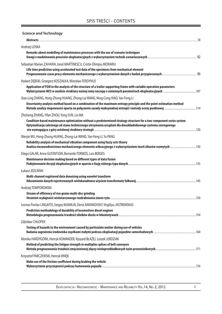SPIS TREŚCI - CONTENTS Science and Technology Abstracts............................................................................................................................................................................................................. III Andrzej LOSKA Remarks about modelling of maintenance processes with the use of scenario techniques Uwagi o modelowaniu procesów eksploatacyjnych z wykorzystaniem technik scenariuszowych................................................................ 92 Sebastian Marian Zaharia, Ionel Martinescu, Cristin Olimpiu Morariu Life time prediction using accelerated test data of the specimens from mechanical element Prognozowanie czasu pracy elementu mechanicznego z wykorzystaniem danych z badań przyspieszonych............................................. 99 Hubert Dębski, Grzegorz Koszałka, Mirosław Ferdynus Application of fem in the analysis of the structure of a trailer supporting frame with variable operation parameters Wykorzystanie mes w analizie struktury nośnej ramy naczepy o zmiennych parametrach eksploatacyjnych...............................................107 Xiao-Ling ZHANG, Hong-Zhong HUANG, Zhong-Lai WANG, Ning-Cong XIAO, Yan-Feng LI Uncertainty analysis method based on a combination of the maximum entropy principle and the point estimation method Metoda analizy niepewności oparta na połączeniu zasady maksymalnej entropii i metody oceny punktowej.............................................114 Zhisheng ZHANG, Yifan ZHOU, Yong SUN, Lin MA Condition-based maintenance optimisation without a predetermined strategy structure for a two-component series system Optymalizacja zależnego od stanu technicznego utrzymania urządzeń dla dwuskładnikowego systemu szeregowego nie wymagająca z góry ustalonej struktury strategii..............................................................................................................................................120 Wenjie WU, Hong-Zhong HUANG, Zhong-Lai WANG, Yan-Feng LI, Yu PANG Reliability analysis of mechanical vibration component using fuzzy sets theory Analiza niezawodnościowa mechanicznego elementu wibracyjnego z wykorzystaniem teorii zbiorów rozmytych.....................................130 Diego GALAR, Anna GUSTAFSON, Bernardo TORMOS, Luis BERGES Maintenance decision making based on different types of data fusion Podejmowanie decyzji eksploatacyjnych w oparciu o fuzję różnego typu danych...............................................................................................135 Łukasz JEDLIŃSKI Multi-channel registered data denoising using wavelet transform Odszumianie danych rejestrowanych wielokanałowoz użyciem transformaty falkowej....................................................................................145 Andrzej TOMPOROWSKI Stream of efficiency of rice grains multi-disc grinding Strumień wydajności wielotarczowego rozdrabniania ziaren ryżu........................................................................................................................150 Leonas Povilas LINGAITIS, Sergey MJAMLIN, Denis BARANOVSKY, Virgilijus JASTREMSKAS Prediction methodology of durability of locomotives diesel engines Metodologia prognozowania trwałości silników diesla w lokomotywach............................................................................................................154 Zdzisław Chłopek Testing of hazards to the environment caused by particulate matter during use of vehicles Badania zagrożenia środowiska cząstkami stałymi podczas eksploatacji pojazdów samochodowych............................................................160 Monika HARDYGÓRA, Henryk KOMANDER, Ryszard BŁAŻEJ, Leszek JURDZIAK Method of predicting the fatigue strength in multiplies splices of belt conveyors Metoda prognozowania trwałości zmęczeniowej złączy wieloprzekładkowych taśm przenośnikowych.........................................................171 Krzysztof PARCZEWSKI, Henryk WNĘK Make use of the friction coefficient during braking the vehicle Wykorzystanie przyczepności podczas hamowania pojazdu...................................................................................................................................176 Eksploatacja i N iezawodnosc - Maintenance and Reliability Vol.14, No. 2, 2012 I SPIS TREŚCI - CONTENTS Daniel PIENIAK, Agata M. NIEWCZAS, Paweł KORDOS Influence of thermal fatigue and ageing on the microhardness of polymer-ceramic composites for bio-medical applications Wpływ zmęczenia cieplnego oraz starzenia na mikrotwardość kompozytów polimerowo – ceramicznych do zastosowań biomedycznych.....................................................................................................................................................................................181 2012 International Conference on Quality, Reliability, Risk, Maintenance, and Safety Engineering, Chengdu, Sichuan, China.................189 II Eksploatacja i N iezawodnosc - Maintenance and Reliability Vol.14, No. 2, 2012 W SKRÓCIE - ABSTRACTS Loska A. Remarks about modelling of maintenance processes with the use of scenario techniques. Eksploatacja i Niezawodnosc - Maintenance and Reliability 2012; 14 (2): 92-98. Loska A. Uwagi o modelowaniu procesów eksploatacyjnych z wykorzystaniem technik scenariuszowych. Eksploatacja i Niezawodnosc - Maintenance and Reliability 2012; 14 (2): 92-98. This article aims at presenting the results of research use of modelling of exploitation processes in practical applications (industrial). Firstly, there has been made an identification and of solutions in this area, particular attention was paid equally to the problems associated with processes modelling in the context of wider organizational and technical approach. Basing on the performed studies, of both basic (theoretical) and industrial character, the research problem has been defined. It concentrates on the difficulties of usi