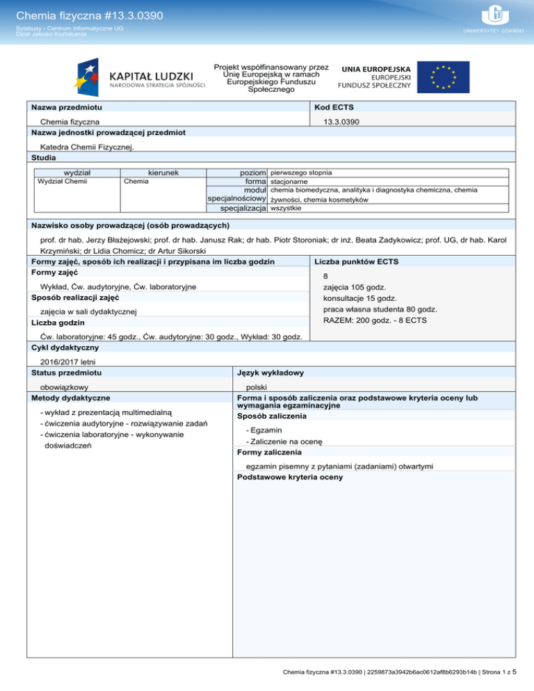Chemia fizyczna #13.3.0390 Sylabusy - Centrum Informatyczne UG Dział Jakości Kształcenia Projekt współfinansowany przez Unię Europejską w ramach Europejskiego Funduszu Społecznego Nazwa przedmiotu Kod ECTS Chemia fizyczna Nazwa jednostki prowadzącej przedmiot 13.3.0390 Katedra Chemii Fizycznej. Studia wydział Wydział Chemii kierunek Chemia poziom forma moduł specjalnościowy specjalizacja pierwszego stopnia stacjonarne chemia biomedyczna, analityka i diagnostyka chemiczna, chemia żywności, chemia kosmetyków wszystkie Nazwisko osoby prowadzącej (osób prowadzących) prof. dr hab. Jerzy Błażejowski; prof. dr hab. Janusz Rak; dr hab. Piotr Storoniak; dr inż. Beata Zadykowicz; prof. UG, dr hab. Karol Krzymiński; dr Lidia Chomicz; dr Artur Sikorski Formy zajęć, sposób ich realizacji i przypisana im liczba godzin Formy zajęć Liczba punktów ECTS 8 zajęcia 105 godz. konsultacje 15 godz. praca własna studenta 80 godz. RAZEM: 200 godz. - 8 ECTS Wykład, Ćw. audytoryjne, Ćw. laboratoryjne Sposób realizacji zajęć zajęcia w sali dydaktycznej Liczba godzin Ćw. laboratoryjne: 45 godz., Ćw. audytoryjne: 30 godz., Wykład: 30 godz. Cykl dydaktyczny 2016/2017 letni Status przedmiotu obowiązkowy Metody dydaktyczne - wykład z prezentacją multimedialną - ćwiczenia audytoryjne - rozwiązywanie zadań - ćwiczenia laboratoryjne - wykonywanie doświadczeń Język wykładowy polski Forma i sposób zaliczenia oraz podstawowe kryteria oceny lub wymagania egzaminacyjne Sposób zaliczenia - Egzamin - Zaliczenie na ocenę Formy zaliczenia egzamin pisemny z pytaniami (zadaniami) otwartymi Podstawowe kryteria oceny Chemia fizyczna #13.3.0390 | 2259873a3942b6ac0612af8b6293b14b | Strona 1 z 5 Chemia fizyczna #13.3.0390 Sylabusy - Centrum Informatyczne UG Dział Jakości Kształcenia • wykład: Warunkiem przystąpienia do egzaminu jest uzyskanie zali-czenia z ćwiczeń audytoryjnych i laboratoryjnych; przedmiot zaliczają osoby, które poprawnie odpowiedzą na co najmniej 51% pytań. Studenci, którzy nie uzyskają wymaganego progu zaliczeniowego, przystępują do egzaminu ustnego. • ćwiczenia audytoryjne: warunkiem uzyskania oceny pozytywnej jest uzyskanie z każdego z dwóch kolokwiów minimum 51% punktów obejmujących problematykę ćwiczeń audytoryjnych; ocena końcowa jest średnią arytmetyczną ocen uzyskanych z kolokwiów. Studenci, którzy nie uzyskają wymaganego progu zaliczeniowego przystępują do kolokwium poprawkowego z zakresu kolokwium, z którego zdobyli mniej niż 51% punktów. • ćwiczenia laboratoryjne - na ocenę ze sprawozdań składa się: prze-strzeganie zasad bezpieczeństwa, uzyskanie poprawnych wyników badań (w odniesieniu do wartości literaturowych, w zakresie dopusz-czalnego błędu statystycznego), poprawna analiza wyników ekspe-rymentalnych, umiejętność ilustracji graficznej wybranych zależności fizykochemicznych; na ocenę z kolokwiów składa się: poprawność odpowiedzi (ustnej lub pisemnej) na postawione pytania poprawność odpowiedzi (ustnej lub pisemnej) na postawione pytania (przywołanie odpowiedniej teorii i poprawnych wzorów wraz z jed-nostkami), poprawność zastosowanych teorii i zależności oraz po-prawny wynik rozwiązywanych zadań; Warunkiem uzyskania oceny pozytywnej jest uzyskanie z każdego z kolokwiów wejściowych i każdego ze sprawozdań minimum 51% punktów obejmujących tematykę wykonywanych eksperymentów; ocena końcowa jest średnią arytmetyczną ocen uzyskanych ze sprawozdań i kolokwiów wejściowych. Sposób weryfikacji założonych efektów kształcenia Sposób weryfikacji przyswojenia wiedzy: Student do rozwiązywania zadań stosuje podstawowe prawa i teorie z zakresu chemii fizycznej (K_W01); wie jakie właściwości fizykochemiczne posiadają badane związki bazując na informacjach strukturalnych (K_W03). Podczas pisania sprawozdań, kolokwium i egzaminu studentwie jak prawidłowo opisać badane zjawiska fizykochemiczne za pomocą języka matematyki wyższej (K_W06 i K_W07). Podczas ćwiczeń z przedmiotu student rozwiązuje zadania wymagające znajomości podstawowych metod obliczeniowych (K_W08). Znajmość oraz zasady budowy podstawowej apratury i sprzętu pomiarowego, wykorzystywanego w badaniach fizykochemicznych są bezpośrednio weryfikowane podczas zajęć laboratoryjnych (K_W10). Student przystępując do zajęć wie jak należ zachować na swoim stanowisku pracy zgodnie z zasadami BiHP oraz ma świadomość bezpiecznej pracy w laboratorium chemicznym (K_W12). Sposób weryfikacji nabycia umiejętności: W oparciu o zdobytą wiedzę oraz wykorzystując materiały do zajęć, student potrafi: - wykonywać planowe eksperymenty w laboratorium (K_U01); - poprawnie wyciągać wnioski z wyników swoich pomiarów i przedstawić je w formie pisemnych sprawozdań (K_U02); - dobrać odpowiedni sprzęt do analizy eksperymentalnej (K_U03); - pisać przystępnym językiem naukowym opracowania (sprawozdania) stosując metody statystyczne, oprogramowanie komputerowe (K_U05, K_U06, K_U07, K_U08); - potrafi samodzielnie przygotować się do kolokwium i egzaminu (K_U09). Sposób weryfikacji nabrania kompetencji społecznych: Student uczestniczy w konsultacjach i przygotowuje się do zajęć (K_K01 i K_K02), zdobuwając informacje w różnych źródłach (K_K06) i dzieli się zdobytą wiedzą z osobami, z którymi wykonuje ćwiczenia (K_K02). Ćwiczenia laboratoryjne wykonuje zgodnie z ustalonymi procedurami z zachowaniem zasad bezpieczeństwa (K_K05). Określenie przedmiotów wprowadzających wraz z wymogami wstępnymi A. Wymagania formalne chemia ogólna, podstawy matematyki wyższej, podstawy fizyki. B. Wymagania wstępne Znajomość chemii ogólnej na poziomie studiów I stopnia, znajomość podstawowych pojęć i zasad z zakresu matematyki i fizyki, umiejętność przeprowadzenia eksperymentów chemicznych i fizycznych, znajomość zasad budowy i działania aparatury chemicznej, umiejętność ana
