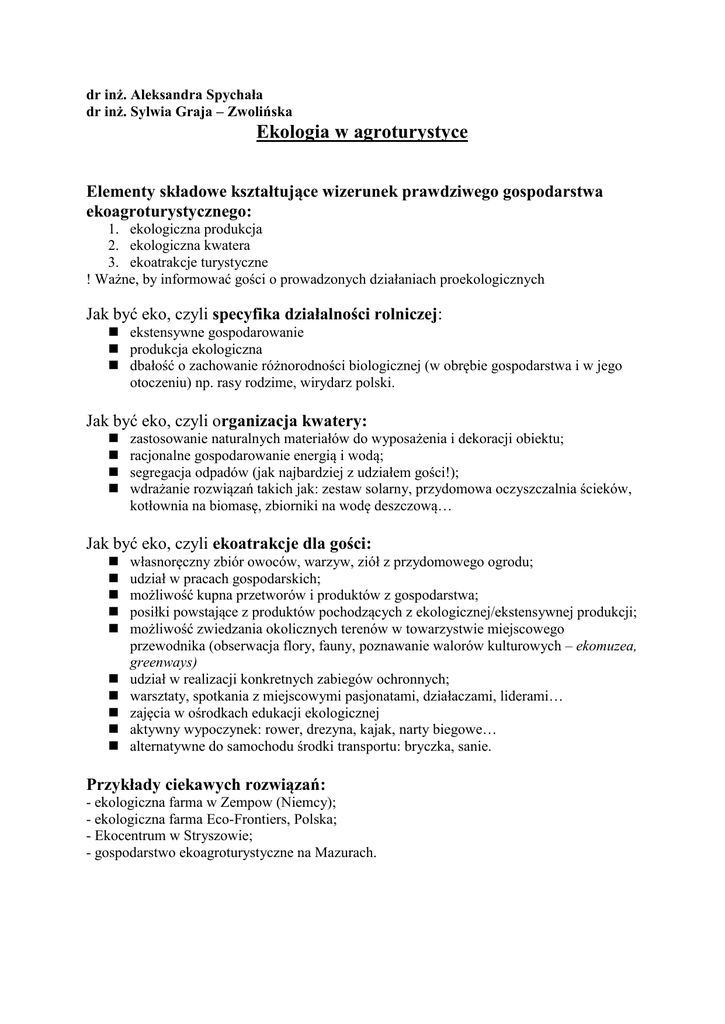 dr inż. Aleksandra Spychała dr inż. Sylwia Graja – Zwolińska Ekologia w agroturystyce Elementy składowe kształtujące wizerunek prawdziwego gospodarstwa ekoagroturystycznego: 1. ekologiczna produkcja 2. ekologiczna kwatera 3. ekoatrakcje turystyczne ! Ważne, by informować gości o prowadzonych działaniach proekologicznych Jak być eko, czyli specyfika działalności rolniczej: ekstensywne gospodarowanie produkcja ekologiczna dbałość o zachowanie różnorodności biologicznej (w obrębie gospodarstwa i w jego otoczeniu) np. rasy rodzime, wirydarz polski. Jak być eko, czyli organizacja kwatery: zastosowanie naturalnych materiałów do wyposażenia i dekoracji obiektu; racjonalne gospodarowanie energią i wodą; segregacja odpadów (jak najbardziej z udziałem gości!); wdrażanie rozwiązań takich jak: zestaw solarny, przydomowa oczyszczalnia ścieków, kotłownia na biomasę, zbiorniki na wodę deszczową… Jak być eko, czyli ekoatrakcje dla gości: własnoręczny zbiór owoców, warzyw, ziół z przydomowego ogrodu; udział w pracach gospodarskich; możliwość kupna przetworów i produktów z gospodarstwa; posiłki powstające z produktów pochodzących z ekologicznej/ekstensywnej produkcji; możliwość zwiedzania okolicznych terenów w towarzystwie miejscowego przewodnika (obserwacja flory, fauny, poznawanie walorów kulturowych – ekomuzea, greenways) udział w realizacji konkretnych zabiegów ochronnych; warsztaty, spotkania z miejscowymi pasjonatami, działaczami, liderami… zajęcia w ośrodkach edukacji ekologicznej aktywny wypoczynek: rower, drezyna, kajak, narty biegowe… alternatywne do samochodu środki transportu: bryczka, sanie. Przykłady ciekawych rozwiązań: - ekologiczna farma w Zempow (Niemcy); - ekologiczna farma Eco-Frontiers, Polska; - Ekocentrum w Stryszowie; - gospodarstwo ekoagroturystyczne na Mazurach. Gdzie szukać wsparcia w zakresie finansów: Narodowy Fundusz Ochrony Środowiska i Gospodarki Wodnej: Przydomowe biologiczne oczyszczalnie ścieków i/lub przyłączenie do istniejącej sieci kanalizacyjnej; Kolektory słoneczne; Domy energooszczędne. Fundacja Wspomagania Wsi: Niekonwencjonalne źródła energii; Mikropożyczki dla osób rozpoczynających lub rozwijających działalnośc gospodarczą; Uprawa ziół, pszczelarstwo. Agencja Restrukturyzacji i Modernizacji Rolnictwa: Gospodarowanie w sposób przyjazny środowisku oraz zachowania ras rodzimych i cennych siedlisk roślin. Europejski Fundusz Rozwoju Wsi Polskiej: Kredyt na agroturystykę. Mechanizmy finansowe EOG i Norweski: Budowa i modernizacja instalacji ściekowych; Odnawialne źródła energii; Wsparcie „zielonych miejsc pracy” i „zielonych zamówień”. Bank Gospodarstwa Krajowego: Termoizolacje. Bank Ochrony Środowiska: Słoneczny ekokredyt; Urządzenia i wyroby służące ochronie środowiska; Termoulga; Ekologiczne kredyty hipoteczne; Europejski Fundusz Rozwoju Wsi Polskiej; Przydomowe biologiczne oczyszczalnie ścieków; Odnawialne źródła energii; Usuwanie i unieszkodliwianie azbestu; Przyłącza do sieci kanalizacyjnej. Możliwość dotacji z budżetu gminy/powiatu np. OZE, wymiana systemu grzewczego, likwidacja azbestu, POŚ – właściwy urząd gminy lub starostwo powiatowe. Gdzie się promować: własna strona www poprzez lokalne, regionalne organizacje turystyczne i ekologiczne współdziałając ze stowarzyszeniami, organizacjami promujących tego rodzaju wypoczynek (np. ECEAT Polska) Ekocertyfikaty w turystyce, przykłady: CZYSTA TURYSTYKA, POLSKI CERTYFIKAT EKOTURYSTYCZNY Fundacja Partnerstwo dla Środowiska Społeczny Instytut Ekologiczny. Korzyści z uzyskania certyfikatu: wiarygodne potwierdzenie spełniania parametrów ważnych ekologicznie; obniżenie kosztów działalności, dzięki bardziej racjonalnej gospodarce surowcami, energią, wodą i odpadami; wzrost konkurencyjności dzięki wdrożeniom technicznym i technologicznym, pozwalającym na sprawniejsze zarządzanie organizacją, środowiskiem i pracownikami; wizerunek organizacji przyjaznej dla środowiska; udział w ogólnopolskiej inicjatywie wymiany doświadczeń, wykorzystania potencjału współpracy i wzajemnej promocji (marketing ekologiczny); wzrost świadomości ekologicznej pracowników oraz klientów organizacji.