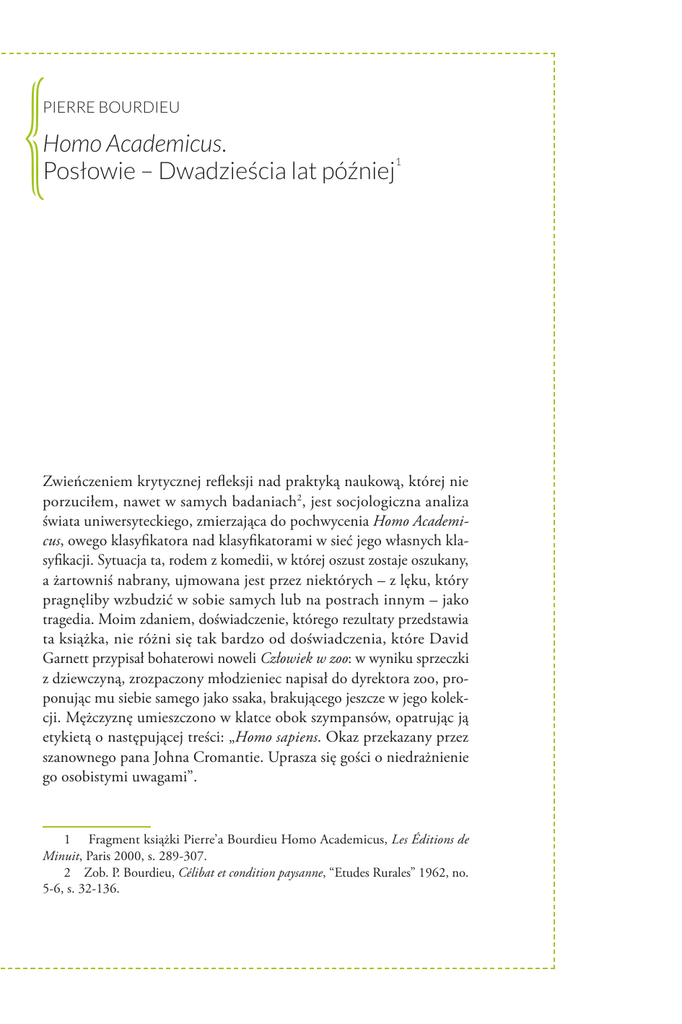 } Pierre Bourdieu Homo Academicus. 1 Posłowie – Dwadzieścia lat później Zwieńczeniem krytycznej refleksji nad praktyką naukową, której nie porzuciłem, nawet w samych badaniach2, jest socjologiczna analiza świata uniwersyteckiego, zmierzająca do pochwycenia Homo Academicus, owego klasyfikatora nad klasyfikatorami w sieć jego własnych klasyfikacji. Sytuacja ta, rodem z komedii, w której oszust zostaje oszukany, a żartowniś nabrany, ujmowana jest przez niektórych – z lęku, który pragnęliby wzbudzić w sobie samych lub na postrach innym – jako tragedia. Moim zdaniem, doświadczenie, którego rezultaty przedstawia ta książka, nie różni się tak bardzo od doświadczenia, które David Garnett przypisał bohaterowi noweli Człowiek w zoo: w wyniku sprzeczki z dziewczyną, zrozpaczony młodzieniec napisał do dyrektora zoo, proponując mu siebie samego jako ssaka, brakującego jeszcze w jego kolekcji. Mężczyznę umieszczono w klatce obok szympansów, opatrując ją etykietą o następującej treści: „Homo sapiens. Okaz przekazany przez szanownego pana Johna Cromantie. Uprasza się gości o niedrażnienie go osobistymi uwagami”. 1 Fragment książki Pierre’a Bourdieu Homo Academicus, Les Éditions de Minuit, Paris 2000, s. 289-307. 2 Zob. P. Bourdieu, Célibat et condition paysanne, “Etudes Rurales” 1962, no. 5-6, s. 32-136. anzpraktyka cyteroet 1(7)/2013 32 Collège de France Sorbona Faculté de Nanteree EPHE 6e section EPHE 4e et 5e section Diagram 1. Obszar humanistyki i nauk społecznych. Analiza korespondencji: przedstawienie dwóch osi inercji jednostek1* 1 * W celu wskazania głównej afiliacji profesorów związanych z licznymi instytucjami w badanej populacji, przyjęto zwyczajową hierarchię, przypisując na przykład do CdF lub do Sorbony uczonych należących równocześnie do jednej z tych instytucji oraz do École pratique des hautes études. Pierre Bourdieu 33 anzpraktyka cyteroet 1(7)/2013 Socjolog obierający za przedmiot badań swój własny świat, to, co mu najbliższe i najbardziej znajome, nie może, w odróżnieniu od etnologa, oswajać tego, co egzotyczne, lecz powinien raczej – by tak rzec – egzotycznym uczynić to, co swojskie, zrywając pierwotną więź intymności ze sposobami życia i myślenia obcymi mu z racji tego, że aż nazbyt są mu znajome. Ten ruch w kierunku rodzimego i zwyczajnego świata, powinien stać się zwieńczeniem ruchu w stronę światów obcych i niezwykłych. Jest to jednak coś, co praktycznie nigdy się nie zdarza: tak u Durkheima, jak u Lévi-Straussa, nie chodzi o poddanie analizie „form klasyfikacji” stosowanych przez naukowca, ani też o poszukiwanie podstaw kategorii profesorskiego rozumowania w społecznych strukturach świata uniwersyteckiego (po mistrzowsku przeanalizowanych przez Durkheima w L’Évolution pédagogique en France). Toteż nauka społeczna może spodziewać się najbardziej decydujących postępów w wyniku nieustającej socjologicznej krytyki rozumu socjologicznego. Musi ona podjąć prace nad rekonstrukcją społecznej genezy nie tylko stosowanych przez nią – świadomie lub nie – kategorii myślenia (takich jak przeciwstawne pary pojęć, nader często ukierunkowujące naukową konstrukcję świata społecznego), ale również używanych przez nią koncepcji, często niebędących niczym więcej jak zdroworozsądkowymi ideami wprowadzanymi do dyskursu naukowego bez poddania ich uprzedniej analizie (jak np. pojęcie profesji, milcząco tutaj odrzucone). Wreszcie – nad rekonstrukcją genezy problemów, które nauka społeczna przed sobą stawia, które niejednokrotnie okazują się jedynie przystrojonymi w uczoność bieżącymi „problemami społecznymi”, jak w wypadku „ubóstwa”, „przestępczości”, „porażki edukacyjnej” czy „trzeciego wieku”, itp. Nie sposób pominąć pracy obiektywizacji obiektywizującego podmiotu. To poprzez obranie za przedmiot badań warunków historycznych jego własnej produkcji, a nie na drodze jakiejś refleksji transcendentalnej, podmiot naukowy może zyskać pewną teoretyczną kontrolę nad własnymi strukturami i skłonnościami, jak i nad uwarunkowaniami, których są one wytworem. Tym samym, może również zapewnić sobie konkretne środki wzmagające jego zdolność do obiektywizacji. Jedynie taki rodzaj socjoanalizy – nieulegającej narcystycznemu samozadowoleniu i nieczerpiącej z niego – przyczynić się może realnie do zastosowania przez badacza wobec rodzimego świata tego rodzaju zdystansowanego oglądu, z jakiego etnolog spontanicznie ogląda świat, w który nie jest uwikłany głębokim porozumieniem płynącym ze współuczestnictwa w społecznej grze – w owym illusio, które nadaje realną wartość tak stawkom, jak i samej grze. Naukowa analiza świata uniwersyteckiego wymaga obrania za przedmiot instytucji społecznie uznawanej za uprawnioną do dokonywania Homo academicus. Posłowie... Naukowa analiza świata uniwersyteckiego wymaga obrania za przedmiot instytucji społecznie uznawanej za uprawnioną do dokonywania obiektywizacji pretendujących do obiektywności i uniwersalności anzpraktyka cyteroet 1(7)/2013 34 obiektywizacji pretendujących do obiektywności i uniwersalności. Ten rodzaj eksperymentu socjologicznego daleki jest od nihilistycznego zamiaru kwestionowania nauki, przyświecającego niektórym analizom mieniącym się postmodernistycznymi, które pod płaszczykiem modnego „francuskiego radical chic” i pod pozorami denuncjacji pozytywizmu czy scjentyzmu przywracają jedynie do łask dawną irracjonalistyczną wzgardę dla nauki, zwłaszcza nauki społecznej. Ów socjologiczny eksperyment zastosowany do samej pracy socjologicznej, dąży do pokazania, że socjologia może uciec z błędnego koła historycyzmu czy socjologizmu, jak również, że aby to osiągnąć, wystarczy socjologii posłużyć się wiedzą, jakiej ona sama dostarcza na temat świata społecznego,