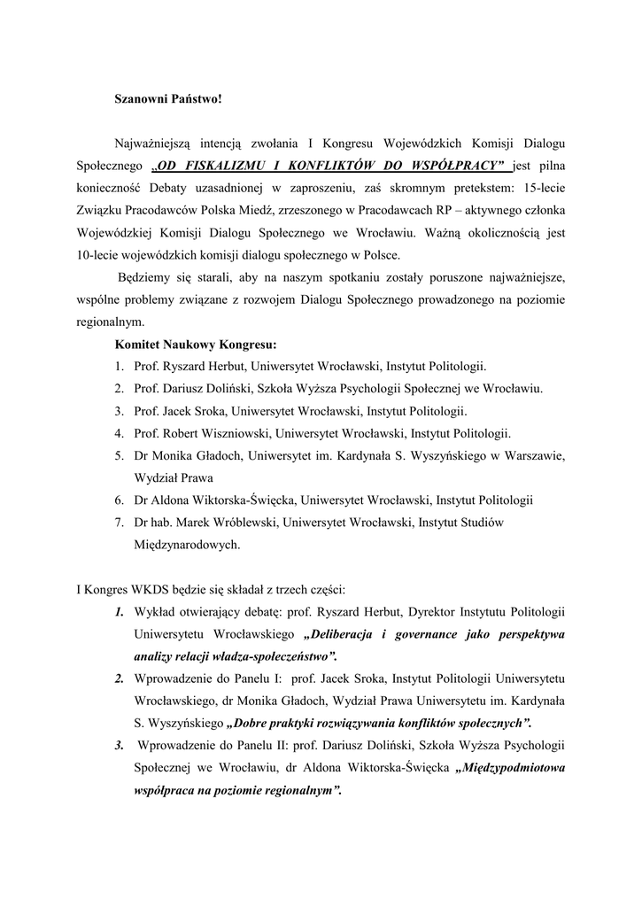Szanowni Państwo! Najważniejszą intencją zwołania I Kongresu Wojewódzkich Komisji Dialogu Społecznego „OD FISKALIZMU I KONFLIKTÓW DO WSPÓŁPRACY” jest pilna konieczność Debaty uzasadnionej w zaproszeniu, zaś skromnym pretekstem: 15-lecie Związku Pracodawców Polska Miedź, zrzeszonego w Pracodawcach RP – aktywnego członka Wojewódzkiej Komisji Dialogu Społecznego we Wrocławiu. Ważną okolicznością jest 10-lecie wojewódzkich komisji dialogu społecznego w Polsce. Będziemy się starali, aby na naszym spotkaniu zostały poruszone najważniejsze, wspólne problemy związane z rozwojem Dialogu Społecznego prowadzonego na poziomie regionalnym. Komitet Naukowy Kongresu: 1. Prof. Ryszard Herbut, Uniwersytet Wrocławski, Instytut Politologii. 2. Prof. Dariusz Doliński, Szkoła Wyższa Psychologii Społecznej we Wrocławiu. 3. Prof. Jacek Sroka, Uniwersytet Wrocławski, Instytut Politologii. 4. Prof. Robert Wiszniowski, Uniwersytet Wrocławski, Instytut Politologii. 5. Dr Monika Gładoch, Uniwersytet im. Kardynała S. Wyszyńskiego w Warszawie, Wydział Prawa 6. Dr Aldona Wiktorska-Święcka, Uniwersytet Wrocławski, Instytut Politologii 7. Dr hab. Marek Wróblewski, Uniwersytet Wrocławski, Instytut Studiów Międzynarodowych. I Kongres WKDS będzie się składał z trzech części: 1. Wykład otwierający debatę: prof. Ryszard Herbut, Dyrektor Instytutu Politologii Uniwersytetu Wrocławskiego „Deliberacja i governance jako perspektywa analizy relacji władza-społeczeństwo”. 2. Wprowadzenie do Panelu I: prof. Jacek Sroka, Instytut Politologii Uniwersytetu Wrocławskiego, dr Monika Gładoch, Wydział Prawa Uniwersytetu im. Kardynała S. Wyszyńskiego „Dobre praktyki rozwiązywania konfliktów społecznych”. 3. Wprowadzenie do Panelu II: prof. Dariusz Doliński, Szkoła Wyższa Psychologii Społecznej we Wrocławiu, dr Aldona Wiktorska-Święcka „Międzypodmiotowa współpraca na poziomie regionalnym”. 4. Wprowadzenie do Panelu II: prof. Robert Wiszniowski, Instytut Politologii Uniwersytetu Wrocławskiego, dr hab. Marek Wróblewski, Instytut Studiów Międzynarodowych Uniwersytetu Wrocławskiego: „Wpływ dialogu na tworzenie prawa i zintegrowanych rozwiązań w obliczu procesu europeizacji”. 5. Podsumowujący moduł plenarny. Panele dyskusyjne dotyczyć będą następujących obszarów problemowych: Panel 1. Dobre praktyki rozwiązywania konfliktów społecznych. Panel prowadzą prof. Jacek Sroka, Uniwersytet Wrocławski, Instytut Politologii oraz dr Monika Gładoch, Uniwersytet im. Kardynała S. Wyszyńskiego w Warszawie, Wydział Prawa Fiskalizm i bariery administracyjne, np. podatki lokalne, uzyskiwanie zezwoleń, koncesji, uzgodnień - przykłady dobrych praktyk. Standardy i dobre praktyki w zapewnieniu pokoju społecznego w stosunkach pracy. Teza 1: Dolny Śląsk staje w obliczu ważnych wyzwań o charakterze kulturowym. Sprostanie im zdecyduje o kierunku przyszłego rozwoju regionu Komentarz: W bliskim czasie, na drodze do modernizacji polskich regionów ujawnią się nowe bariery wynikające z kolizji o podłożu kulturowym, które – jak pokazują przykłady innych krajów – pojawiają się w momentach przechodzenia do tzw. ponowoczesności w życiu społecznym i w sferze publicznej oraz do postfordyzmu w gospodarce – w związku z tym pojawia się potrzeba zdefiniowania najważniejszych problemów związanych z kolejnym etapem zmian w polskich regionach Teza 2: Mając na uwadze nadchodzące wyzwania należy dokonać przeglądu oraz oceny funkcjonowania istniejących w regionie instytucji dialogowych, gdyż to właśnie one mogą przyczyniać się zarówno do przyspieszania pozytywnych zmian, jak i do ich zablokowania. Komentarz: Niezbędne jest dokonanie ewaluacji istniejących rozwiązań dialogowych i koordynacyjnych oraz rzetelne porównanie ich ze skutecznymi mechanizmami wykorzystywanymi w krajach notujących jednoznaczne sukcesy rozwojowe. Teza 3: W najbardziej pożądanym scenariuszu przyszłości zmiany powinny być wprowadzane w sposób uzgodnieniowy. Tak właśnie należy budować sprzyjający im klimat społeczny oraz projektować rozwiązania wykorzystujące w sposób optymalny zarówno szanse rysujące się przed Dolnym Śląskiem, jak i dostępne w regionie zasoby. Komentarz: Zmiany należy wprowadzać stosując mechanizmy deliberacyjne, ich wykorzystanie powinno poszerzyć formułę dialogu zarówno o nowe idee, koncepcje, strategie, jak również o nowych aktorów. Teza 4: Mechanizmy uzgodnieniowe powinny być niezwłocznie zrekonstruowane w taki sposób, aby wspomagały kreację innowacji w regionie. Przy czym głównym kryterium stanowiącym o przydatności poszczególnych innowacji należy uczynić dynamikę dolnośląskich rynków pracy uzupełnioną o kontekst edukacyjny. Komentarz: Korekta funkcjonowania dialogu na poziomie regionalnym powinna zmierzać do wspierania innowacyjności w ścisłym powiązaniu z dynamiką regionalnego oraz lokalnych rynków pracy – przede wszystkim należy dążyć do zmniejszenia luki pomiędzy edukacją a rynkami pracy w województwach. Teza 5: Zrekonstruowany w postulowany sposób dialog regionalny powinien stanowić forum, które – w rozsądnym czasie i w ścisłej współpracy z ekspertami – będzie w stanie oszacować dystans rozwojowy dzielący Dolny Śląsk od regionów bardziej rozwiniętych. Krokiem następnym byłoby podjęcie prac nad projektem zmniejszania tego dystansu. Komentarz: Posługując się odnowionym w ten sposób dialogiem należy rozpocząć działania, których celem byłoby określenie cech oraz rozmiarów luki modernizacyjnej w poszczególnych regionach, a także określanie wpływu, jaki wywiera ona na rzeczywisty kształt powiązań instytucjonalnych pomiędzy edukacją a rynkami pracy. Teza 6: Wśród przyszłych rozwiązań należałoby poważnie wziąć pod uwagę możliwość budowania partnerstw wspierających zmiany wzorowanych na istniejących w
