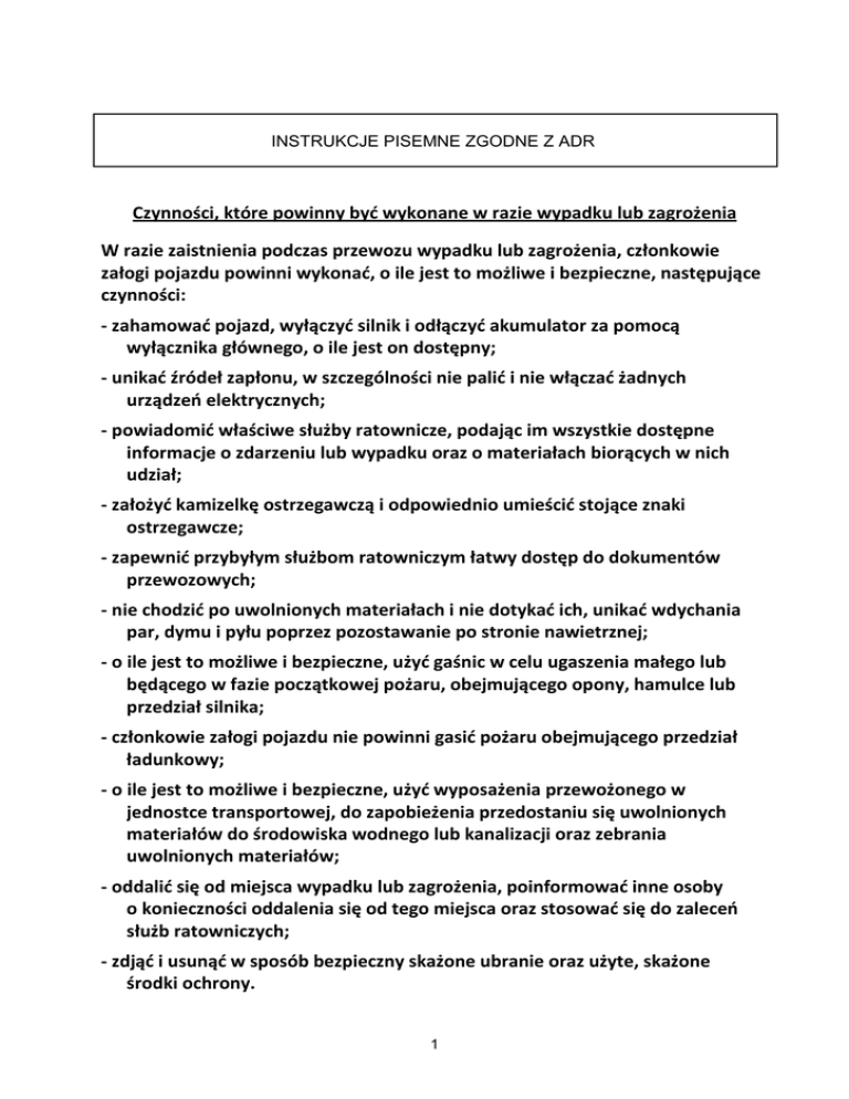 INSTRUKCJE PISEMNE ZGODNE Z ADR Czynności, które powinny być wykonane w razie wypadku lub zagrożenia W razie zaistnienia podczas przewozu wypadku lub zagrożenia, członkowie załogi pojazdu powinni wykonać, o ile jest to możliwe i bezpieczne, następujące czynności: - zahamować pojazd, wyłączyć silnik i odłączyć akumulator za pomocą wyłącznika głównego, o ile jest on dostępny; - unikać źródeł zapłonu, w szczególności nie palić i nie włączać żadnych urządzeń elektrycznych; - powiadomić właściwe służby ratownicze, podając im wszystkie dostępne informacje o zdarzeniu lub wypadku oraz o materiałach biorących w nich udział; - założyć kamizelkę ostrzegawczą i odpowiednio umieścić stojące znaki ostrzegawcze; - zapewnić przybyłym służbom ratowniczym łatwy dostęp do dokumentów przewozowych; - nie chodzić po uwolnionych materiałach i nie dotykać ich, unikać wdychania par, dymu i pyłu poprzez pozostawanie po stronie nawietrznej; - o ile jest to możliwe i bezpieczne, użyć gaśnic w celu ugaszenia małego lub będącego w fazie początkowej pożaru, obejmującego opony, hamulce lub przedział silnika; - członkowie załogi pojazdu nie powinni gasić pożaru obejmującego przedział ładunkowy; - o ile jest to możliwe i bezpieczne, użyć wyposażenia przewożonego w jednostce transportowej, do zapobieżenia przedostaniu się uwolnionych materiałów do środowiska wodnego lub kanalizacji oraz zebrania uwolnionych materiałów; - oddalić się od miejsca wypadku lub zagrożenia, poinformować inne osoby o konieczności oddalenia się od tego miejsca oraz stosować się do zaleceń służb ratowniczych; - zdjąć i usunąć w sposób bezpieczny skażone ubranie oraz użyte, skażone środki ochrony. 1 Dodatkowe wskazówki dla członków załogi pojazdu dotyczące charakterystyki zagrożeń stwarzanych przez towary niebezpieczne określonej klasy oraz czynności zależnych od zaistniałej sytuacji Nalepki ostrzegawcze (1) Materiały i przedmioty wybuchowe 1 1.5 1.6 Charakterystyka zagrożeń Dodatkowe wskazówki (2) (3) Mogą mieć szereg właściwości powodujących takie efekty jak wybuch masowy, rozrzut odłamków, intensywny ogień/promieniowanie Schronić się i pozostać z dala od okien. cieplne, świecenie, huk, wydzielanie dymu. Wrażliwe na wstrząsy i/lub uderzenia i/lub wysoką temperaturę. Materiały i przedmioty wybuchowe Niewielkie zagrożenie wybuchem i pożarem Schronić się. Zagrożenie pożarem. Zagrożenie wybuchem. Mogą znajdować się pod ciśnieniem. Zagrożenie działaniem duszącym. Mogą powodować oparzenia i/lub odmrożenia. Ładunek może wybuchnąć w przypadku ogrzania. Schronić się. Unikać zagłębień terenu. Zagrożenie działaniem duszącym. Mogą znajdować się pod ciśnieniem. Mogą powodować odmrożenia. Ładunek może wybuchnąć w przypadku ogrzania. Schronić się. Unikać zagłębień terenu. Zagrożenie zatruciem. Mogą znajdować się pod ciśnieniem. Mogą powodować oparzenia i/lub odmrożenia. Ładunek może wybuchnąć w przypadku ogrzania. Użyć maski ucieczkowej. Schronić się. Unikać zagłębień terenu. Zagrożenie pożarem. Zagrożenie wybuchem. Ładunek może wybuchnąć w przypadku ogrzania. Schronić się. Unikać zagłębień terenu. 1.4 Gazy palne 2.1 Gazy niepalne, nietrujące 2.2 Gazy trujące 2.3 Materiały ciekłe zapalne 3 3 3 Materiały stałe zapalne, materiały samoreaktywne i materiały wybuchowe stałe odczulone 4 4.1 Zagrożenie pożarem. Materiały łatwopalne lub palne. Mogą zapalić się na skutek działania ciepła, iskry lub płomienia. Ładunek może zawierać materiały Samoreaktywne zdolne do egzotermicznego rozkładu wskutek dostarczenia ciepła, kontaktu z innymi substancjami (takimi jak kwasy, związki metali ciężkich lub aminy), tarcia lub uderzenia. Może to skutkować wydzielaniem szkodliwych i palnych gazów lub par lub samozapłonem. Ładunek może wybuchnąć w przypadku ogrzania. Zagrożenie wybuchem materiału odczulonego w przypadku ubytku substancji odczulającej. Materiały samozapalne Zagrożenie pożarem w wyniku samozapłonu w przypadku uszkodzenia sztuk przesyłki lub uwolnienia się materiału. Mogą gwałtownie reagować z wodą. 4 4.2 Materiały wytwarzające w zetknięciu z wodą gazy palne 4 4 Uwolniony materiał powinien być Zagrożenie pożarem lub wybuchem na skutek utrzymywany w stanie suchym, pod kontaktu z wodą. przykryciem. 4.3 2 Nalepki ostrzegawcze (1) Charakterystyka zagrożeń (2) Dodatkowe wskazówki (3) Materiały utleniające 5.1 Zagrożenie gwałtowną reakcją, zapłonem i wybuchem w przypadku kontaktu z materiałami palnymi. Unikać zmieszania z materiałami palnymi (np. trocinami). Zagrożenie rozkładem egzotermicznym wskutek wzrostu temperatury, kontaktu z innymi substancjami (takimi jak kwasy, związki metali ciężkich lub aminy), tarcie lub wstrząsy. Może to skutkować wydzielaniem szkodliwych i palnych gazów lub par lub samozapłonem. Unikać zmieszania z materiałami palnymi (np. trocinami). Zagrożenie zatruciem drogą inhalacyjną, poprzez kontakt ze skórą lub w wyniku połknięcia. Zagrożenie w przypadku przedostania się do środowiska wodnego lub kanalizacji. Użyć maski ucieczkowej. 5.1 Nadtlenki organiczne 5.2 5.2 5.2 Materiały trujące 6.1 Materiały zakaźne Zagrożenie zakażeniem. Mogą powodować groźne choroby u ludzi lub zwierząt. Zagrożenie w przypadku przedostania się do środowiska wodnego lub kanalizacji. 6.2 Materiały promieniotwórcze 7A 7B Zagrożenie wchłonięciem i napromieniowaniem zewnętrznym. Ograniczyć czas narażenia. RADIOACTIVE 7 7C 7D Materiały rozszczepialne Zagrożenie reakcją łańcuchową. 7E Materiały żrące 8 Różne materiały i przedmioty niebezpieczne Zagrożenie poparzeniem substancją żrącą. Mogą silnie reagować ze sobą, z wodą i z innymi materiałami. Uwolnione materiały mogą wydzielać żrące pary. Zagrożenie w przypadku pr