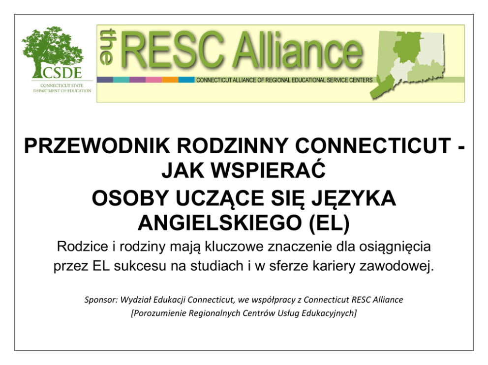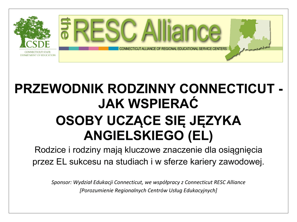 PRZEWODNIK RODZINNY CONNECTICUT JAK WSPIERAĆ OSOBY UCZĄCE SIĘ JĘZYKA ANGIELSKIEGO (EL) Rodzice i rodziny mają kluczowe znaczenie dla osiągnięcia przez EL sukcesu na studiach i w sferze kariery zawodowej. Sponsor: Wydział Edukacji Connecticut, we współpracy z Connecticut RESC Alliance [Porozumienie Regionalnych Centrów Usług Edukacyjnych] Jako edukatorzy, uznajemy i cenimy to, w jaki sposób życie rodzinne i doświadczenia tworzą stabilny fundament dla nauki. Poniżej przedstawiamy kilka sugestii dotyczących sposobów, w jakie mogą Państwo wspomóc swoje dziecko w procesie uczenia się języka angielskiego. Bycie dwujęzycznym to atut. Dorosłe osoby, które są dwujęzyczne/ potrafią czytać i pisać w dwóch językach, statystycznie zarabiają więcej niż osoby znające tylko jeden język. Mózg osoby dwujęzycznej jest bardziej odporny na chorobę Alzheimera i demencję. Dwujęzyczność zwiększa zdolność rozumienia problemów i koncepcji matematycznych. Rozmawiaj ze swoim dzieckiem o szkole. Podziel się swoimi własnymi doświadczeniami związanymi ze szkołą, historiami rodzinnymi i interesującymi rzeczami. Bycie dwujęzycznym pomaga w lepszym skupianiu się i podejmowaniu decyzji. Osoba dwujęzyczna ma silnie rozwinięte umiejętności krytycznego myślenia. Codzienne czytanie dziecku - i z dzieckiem w jakimkolwiek języku wzbogaca jego słownictwo, przez co jest ono lepiej przygotowane do zajęć w szkole. Silnie rozwinięte umiejętności i strategie w zdolności do czytania i pisania w języku ojczystym pomagają ludziom w łatwiejszym przyswojeniu sobie języka obcego. Pomóż swoim dzieciom dostrzegać otaczający je świat. Zadawaj pytania; zachęcaj też do tego swoje dziecko. Rodzice są pierwszymi nauczycielami dla swoich dzieci. Utrzymuj znajomość swojego języka ojczystego lub języka odziedziczonego. Badania pokazują, że osoby uczące się języka angielskiego mające solidne podstawy swojego języka ojczystego, przyswajają angielski szybciej i z większą łatwością. Używaj w domu swojego języka ojczystego/odziedziczonego. O ile to możliwe, czytaj i pisz w swoim języku ojczystym/odziedziczonym. Zachęcaj swoje dziecko do tego samego. O ile to możliwe, utrzymuj kontakt z innymi rodzinami, organizacjami społecznymi lub grupami, które również mówią w twoim języku ojczystym/odziedziczonym. Słuchaj muzyki, oglądaj telewizję i filmy, używaj aplikacji, czytaj książki i opowiadaj historie w swoim języku ojczystym/odziedziczonym. Zaangażuj się w życie szkoły twojego dziecka. Jednym z kluczowych elementów systemów szkolnych Connecticut jest zaangażowanie rodziców. Szkoły starają się utrzymywać kontakt z rodzicami poprzez szkolne wydarzenia, newslettery i telefonowanie do rodziców. Dołącz do szkolnej organizacji dla rodziców. Zostań wolontariuszem. Bierz udział w szkolnych wydarzeniach. Bierz udział w konferencjach dla rodziców i nauczycieli. Prowadź korespondencję listową i mailową oraz utrzymuj kontakt telefoniczny z nauczycielami twojego dziecka. Nie wahaj się poprosić o pomoc tłumacza we wszelkich kontaktach ze szkolnym systemem, jeżeli tego potrzebujesz. Rozwijaj swoją własną znajomość angielskiego. Podczas gdy czas może stanowić barierę w uczęszczaniu na zajęcia z angielskiego jako języka obcego (ESL), większość społeczności w Connecticut oferuje darmowe zajęcia wieczorowe, poprzez programy edukacji dorosłych i biblioteczne. Ćwicz angielski z innymi. Nawet jeśli chcesz w dalszym ciągu używać w domu swojego języka ojczystego, ćwicz angielski, odwiedzając szkołę swojego dziecka i inne agencje rządowe; podczas wizyt u lekarza, w sklepie, itd. 3. Czym są Główne Standardy Connecticut (CCS)? Często zadawane pytania: 1. W jaki sposób można zostać uznanym w Connecticut za osobę uczącą się angielskiego (EL)? Główne Standardy Connecticut (CCS) mówią o tym, co uczniowie klas niższych niż K-12 powinni wiedzieć i umieć do końca danego poziomu w zakresie matematyki oraz czytania i pisania. Standardy te zostały opracowane tak, aby przygotować wszystkich uczniów do podjęcia pracy lub studiów po ukończeniu szkoły. CCS nie mówią nauczycielom, czego mają uczyć. Okręgi szkolne/nauczyciele opracowują swoje własne zajęcia oraz jednostki w oparciu o CCS. Aby zostać uznanym za EL, dana rodzina musi wypełnić ankietę na temat języka używanego w domu, przy zapisywaniu dziecka do szkoły lub krótko po tym fakcie. Ankieta zwykle zawiera od 3 do 5 pytań. Jeżeli ankieta na temat języka używanego w domu wykaże, że Państwa dziecko spełnia wymagane warunki, wówczas przejdzie ono test, aby stwierdzić, jak dobrze posługuje się angielskim. Niektóre okręgi szkolne przeprowadzają również wywiady z rodzicami, aby zapytać o wcześniejsze etapy edukacji dziecka. Można śmiało poprosić o pomoc tłumacza przy takim wywiadzie. 4. Jakim stanowym, standaryzowanym procesom oceny poddawane są osoby uczące się języka angielskiego? 2. Jakie są opcje programowe dla osób uczących się angielskiego? Programy różnią się od siebie w zależności od danego okręgu. Niektóre opcje wspólne dla całego Connecticut to, m.in.: Wsparcie w nauce języka angielskiego jako drugiego języka (ESL) - uczniowie otrzymują wsparcie wykwalifikowanego nauczyciela ESL lub tutora w klasie (do środka) lub poza nią (na zewnątrz). Podwójny język: Uczniowie dzielą się na dwie grupy; na grupę z językiem angielskim jako ojczystym i na grupę z innym językiem. Połowa treści nauczania podawana jest w jednym języku, a druga połowa - w drugim. Treść nauczania nie powtarza się. Przejście do dwujęzyczności: EL uczą się w oddzielnych klasach w języku ojczystym, natomiast języka angielskiego uczy ich certyfikowany dwujęzyczny nauczyciel. Wszyscy uczniowie posługują się tym samym językiem ojczystym. Z czasem zmniejsza się ilość poleceń podawanych w j
