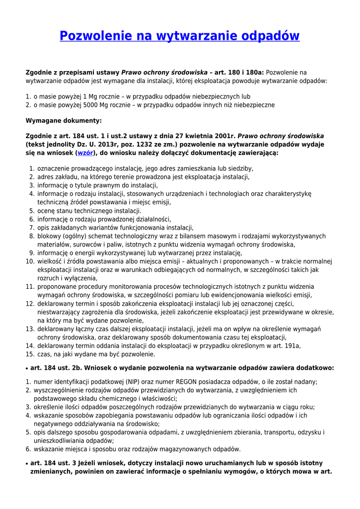 Pozwolenie na wytwarzanie odpadów Zgodnie z przepisami ustawy Prawo ochrony środowiska – art. 180 i 180a: Pozwolenie na wytwarzanie odpadów jest wymagane dla instalacji, której eksploatacja powoduje wytwarzanie odpadów: 1. o masie powyżej 1 Mg rocznie – w przypadku odpadów niebezpiecznych lub 2. o masie powyżej 5000 Mg rocznie – w przypadku odpadów innych niż niebezpieczne Wymagane dokumenty: Zgodnie z art. 184 ust. 1 i ust.2 ustawy z dnia 27 kwietnia 2001r. Prawo ochrony środowiska (tekst jednolity Dz. U. 2013r, poz. 1232 ze zm.) pozwolenie na wytwarzanie odpadów wydaje się na wniosek (wzór), do wniosku należy dołączyć dokumentację zawierającą: 1. 2. 3. 4. 5. 6. 7. 8. 9. 10. 11. 12. 13. 14. 15. ● oznaczenie prowadzącego instalację, jego adres zamieszkania lub siedziby, adres zakładu, na którego terenie prowadzona jest eksploatacja instalacji, informację o tytule prawnym do instalacji, informacje o rodzaju instalacji, stosowanych urządzeniach i technologiach oraz charakterystykę techniczną źródeł powstawania i miejsc emisji, ocenę stanu technicznego instalacji. informację o rodzaju prowadzonej działalności, opis zakładanych wariantów funkcjonowania instalacji, blokowy (ogólny) schemat technologiczny wraz z bilansem masowym i rodzajami wykorzystywanych materiałów, surowców i paliw, istotnych z punktu widzenia wymagań ochrony środowiska, informację o energii wykorzystywanej lub wytwarzanej przez instalację, wielkość i źródła powstawania albo miejsca emisji – aktualnych i proponowanych – w trakcie normalnej eksploatacji instalacji oraz w warunkach odbiegających od normalnych, w szczególności takich jak rozruch i wyłączenia, proponowane procedury monitorowania procesów technologicznych istotnych z punktu widzenia wymagań ochrony środowiska, w szczególności pomiaru lub ewidencjonowania wielkości emisji, deklarowany termin i sposób zakończenia eksploatacji instalacji lub jej oznaczonej części, niestwarzający zagrożenia dla środowiska, jeżeli zakończenie eksploatacji jest przewidywane w okresie, na który ma być wydane pozwolenie, deklarowany łączny czas dalszej eksploatacji instalacji, jeżeli ma on wpływ na określenie wymagań ochrony środowiska, oraz deklarowany sposób dokumentowania czasu tej eksploatacji, deklarowany termin oddania instalacji do eksploatacji w przypadku określonym w art. 191a, czas, na jaki wydane ma być pozwolenie. art. 184 ust. 2b. Wniosek o wydanie pozwolenia na wytwarzanie odpadów zawiera dodatkowo: 1. numer identyfikacji podatkowej (NIP) oraz numer REGON posiadacza odpadów, o ile został nadany; 2. wyszczególnienie rodzajów odpadów przewidzianych do wytwarzania, z uwzględnieniem ich podstawowego składu chemicznego i właściwości; 3. określenie ilości odpadów poszczególnych rodzajów przewidzianych do wytwarzania w ciągu roku; 4. wskazanie sposobów zapobiegania powstawaniu odpadów lub ograniczania ilości odpadów i ich negatywnego oddziaływania na środowisko; 5. opis dalszego sposobu gospodarowania odpadami, z uwzględnieniem zbierania, transportu, odzysku i unieszkodliwiania odpadów; 6. wskazanie miejsca i sposobu oraz rodzajów magazynowanych odpadów. ● art. 184 ust. 3 Jeżeli wniosek, dotyczy instalacji nowo uruchamianych lub w sposób istotny zmienianych, powinien on zawierać informacje o spełnianiu wymogów, o których mowa w art. 143. tj.: Technologia stosowana w nowo uruchamianych lub zmienianych w sposób istotny instalacjach i urządzeniach powinna spełniać wymagania, przy których określaniu uwzględnia się w szczególności: 1. 2. 3. 4. stosowanie substancji o małym potencjale zagrożeń; efektywne wytwarzanie oraz wykorzystanie energii; zapewnienie racjonalnego zużycia wody i innych surowców oraz materiałów i paliw; stosowanie technologii bezodpadowych i małoodpadowych oraz możliwość odzysku powstających odpadów; 5. rodzaj, zasięg oraz wielkość emisji; 6. wykorzystywanie porównywalnych procesów i metod, które zostały skutecznie zastosowane w skali przemysłowej; 7. postęp naukowo-techniczny. ● art. 184 ust. 4. Do wniosku o wydanie pozwolenia należy dołączyć: 1. dokument potwierdzający, że wnioskodawca jest uprawniony do występowania w obrocie prawnym, jeżeli prowadzący instalację nie jest osobą fizyczną, 2. streszczenie wniosku sporządzone w języku niespecjalistycznym. Zgodnie z przepisami ustawy z dnia 14.12.2012r. o odpadach ● art. 45 ust. 5. Wytwórca odpadów, który prowadzi zbieranie odpadów lub przetwarzanie odpadów we wniosku o wydanie pozwolenia na wytwarzanie odpadów jest obowiązany uwzględnić odpowiednio wymagania przewidziane dla wniosku o wydanie zezwolenia na zbieranie odpadów lub wydanie zezwolenia na przetwarzanie odpadów, określone w art. 42 ustawy o odpadach. Rodzaj odpadu należy określić zgodnie z rozporządzeniem Ministra Środowiska z dnia 09 grudnia 2014 r. w sprawie katalogu odpadów (Dz. U. z 2014r., poz. 1923),ilość odpadów należy określić w jednostkach wagowych. Należy udzielić informacji o tytule prawnym do terenu, na którym magazynowane będą odpady (podstawa prawna art. 25 ust. 2 ustawy o odpadach) Wniosek powinien być podpisany przez osobę upoważnioną do reprezentacji podmiotu (np. spółki – zgodnie z KRS) lub przez pełnomocnika – należy załączyć oryginał pełnomocnictwa lub odpis dokumentu, jeżeli jego zgodność z oryginałem została poświadczona przez notariusza lub przez występującego w sprawie pełnomocnika strony będącego adwokatem, radcą prawnym, rzecznikiem patentowym lub doradcą podatkowym. Wniosek o zmianę posiadanego pozwolenia (wzór) musi spełniać wymagania formalne jak dla wniosku o wydanie pozwolenia (art. 192 Prawa ochrony środowiska), ale tylko w zakresie planowanych zmian. Opłaty: ● ● ● ● ● Opłata skarbowa za wydanie pozwolenia – 2011 zł Opłata skarbowa za wydanie pozwolenia w związku z dz