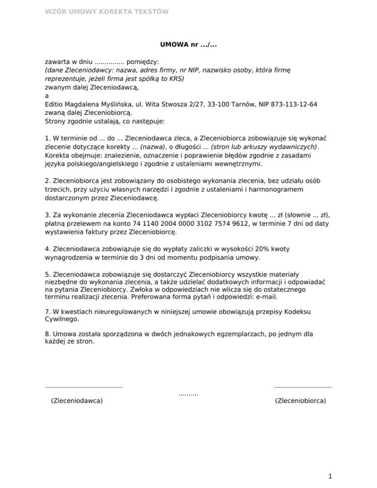 WZÓR UMOWY KOREKTA TEKSTÓW UMOWA nr .../... zawarta w dniu ............... pomiędzy: (dane Zleceniodawcy: nazwa, adres firmy, nr NIP, nazwisko osoby, która firmę reprezentuje, jeżeli firma jest spółką to KRS) zwanym dalej Zleceniodawcą, a Editio Magdalena Myślińska, ul. Wita Stwosza 2/27, 33-100 Tarnów, NIP 873-113-12-64 zwaną dalej Zleceniobiorcą. Strony zgodnie ustalają, co następuje: 1. W terminie od ... do ... Zleceniodawca zleca, a Zleceniobiorca zobowiązuje się wykonać zlecenie dotyczące korekty ... (nazwa), o długości ... (stron lub arkuszy wydawniczych). Korekta obejmuje: znalezienie, oznaczenie i poprawienie błędów zgodnie z zasadami języka polskiego/angielskiego i zgodnie z ustaleniami wewnętrznymi. 2. Zleceniobiorca jest zobowiązany do osobistego wykonania zlecenia, bez udziału osób trzecich, przy użyciu własnych narzędzi i zgodnie z ustaleniami i harmonogramem dostarczonym przez Zleceniodawcę. 3. Za wykonanie zlecenia Zleceniodawca wypłaci Zleceniobiorcy kwotę ... zł (słownie ... zł), płatną przelewem na konto 74 1140 2004 0000 3102 7574 9612, w terminie 7 dni od daty wystawienia faktury przez Zleceniobiorcę. 4. Zleceniodawca zobowiązuje się do wypłaty zaliczki w wysokości 20% kwoty wynagrodzenia w terminie do 3 dni od momentu podpisania umowy. 5. Zleceniodawca zobowiązuje się dostarczyć Zleceniobiorcy wszystkie materiały niezbędne do wykonania zlecenia, a także udzielać dodatkowych informacji i odpowiadać na pytania Zleceniobiorcy. Zwłoka w odpowiedziach nie wlicza się do ostatecznego terminu realizacji zlecenia. Preferowana forma pytań i odpowiedzi: e-mail. 7. W kwestiach nieuregulowanych w niniejszej umowie obowiązują przepisy Kodeksu Cywilnego. 8. Umowa została sporządzona w dwóch jednakowych egzemplarzach, po jednym dla każdej ze stron. ....................................... ............................. .......... (Zleceniodawca) (Zleceniobiorca) 1
