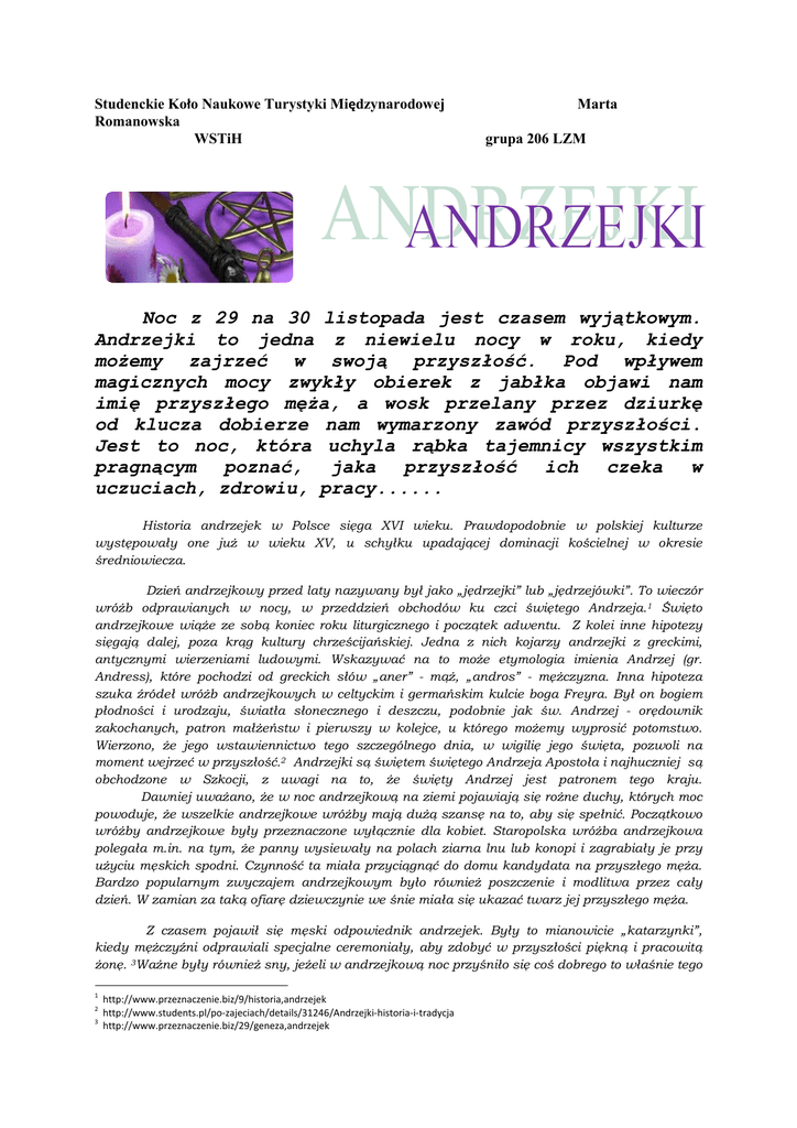 Studenckie Koło Naukowe Turystyki Międzynarodowej Romanowska WSTiH Marta grupa 206 LZM Noc z 29 na 30 listopada jest czasem wyjątkowym. Andrzejki to jedna z niewielu nocy w roku, kiedy możemy zajrzeć w swoją przyszłość. Pod wpływem magicznych mocy zwykły obierek z jabłka objawi nam imię przyszłego męża, a wosk przelany przez dziurkę od klucza dobierze nam wymarzony zawód przyszłości. Jest to noc, która uchyla rąbka tajemnicy wszystkim pragnącym poznać, jaka przyszłość ich czeka w uczuciach, zdrowiu, pracy...... Historia andrzejek w Polsce sięga XVI wieku. Prawdopodobnie w polskiej kulturze występowały one już w wieku XV, u schyłku upadającej dominacji kościelnej w okresie średniowiecza. Dzień andrzejkowy przed laty nazywany był jako „jędrzejki” lub „jędrzejówki”. To wieczór wróżb odprawianych w nocy, w przeddzień obchodów ku czci świętego Andrzeja.1 Święto andrzejkowe wiąże ze sobą koniec roku liturgicznego i początek adwentu. Z kolei inne hipotezy sięgają dalej, poza krąg kultury chrześcijańskiej. Jedna z nich kojarzy andrzejki z greckimi, antycznymi wierzeniami ludowymi. Wskazywać na to może etymologia imienia Andrzej (gr. Andress), które pochodzi od greckich słów „aner” - mąż, „andros” - mężczyzna. Inna hipoteza szuka źródeł wróżb andrzejkowych w celtyckim i germańskim kulcie boga Freyra. Był on bogiem płodności i urodzaju, światła słonecznego i deszczu, podobnie jak św. Andrzej - orędownik zakochanych, patron małżeństw i pierwszy w kolejce, u którego możemy wyprosić potomstwo. Wierzono, że jego wstawiennictwo tego szczególnego dnia, w wigilię jego święta, pozwoli na moment wejrzeć w przyszłość.2 Andrzejki są świętem świętego Andrzeja Apostoła i najhuczniej są obchodzone w Szkocji, z uwagi na to, że święty Andrzej jest patronem tego kraju. Dawniej uważano, że w noc andrzejkową na ziemi pojawiają się rożne duchy, których moc powoduje, że wszelkie andrzejkowe wróżby mają dużą szansę na to, aby się spełnić. Początkowo wróżby andrzejkowe były przeznaczone wyłącznie dla kobiet. Staropolska wróżba andrzejkowa polegała m.in. na tym, że panny wysiewały na polach ziarna lnu lub konopi i zagrabiały je przy użyciu męskich spodni. Czynność ta miała przyciągnąć do domu kandydata na przyszłego męża. Bardzo popularnym zwyczajem andrzejkowym było również poszczenie i modlitwa przez cały dzień. W zamian za taką ofiarę dziewczynie we śnie miała się ukazać twarz jej przyszłego męża. Z czasem pojawił się męski odpowiednik andrzejek. Były to mianowicie „katarzynki”, kiedy mężczyźni odprawiali specjalne ceremoniały, aby zdobyć w przyszłości piękną i pracowitą żonę. 3Ważne były również sny, jeżeli w andrzejkową noc przyśniło się coś dobrego to właśnie tego 1 2 3 http://www.przeznaczenie.biz/9/historia,andrzejek http://www.students.pl/po-zajeciach/details/31246/Andrzejki-historia-i-tradycja http://www.przeznaczenie.biz/29/geneza,andrzejek można było się spodziewać. Dawni mistrzowie magii zalecali, że przed snem warto spalić palmy wielkanocne oraz stanąć tak, aby było czuć dym. Ten rytuał pomagał w sprowadzaniu dobrych snów. Równie dobrze jak ze snu, można było wróżyć z kart. As kier oznaczał spokojny i ciepły dom. As karo zapowiadał dobrą wiadomość w sprawach miłości. As trefl mówił, że można spodziewać się niespodzianki w miłości. As pik zapowiadał partnera władczego i solidnego. Do wielu wróżb wykorzystywane były również zwierzęta, najczęściej były to psy. Właścicielka psa nie mogła jednak brać udziału we wróżbie, aby nie mogło dojść do żadnej manipulacji z jej strony. Panien najczęściej było dwanaście, stawały w kręgu trzymając w rękach kawałki kiełbasy lub placuszki posmarowane tłuszczem. Której pannie pies zabrał smakołyk ta pierwsza miała wyjść za mąż. Jeśli pies zjadł rarytas na miejscu, to panna jeszcze rok musiała poczekać, a jeśli wyniósł go z domu to oznaczało ślub jeszcze w tym samym roku. Zdarzało się, że do izby wpuszczano gąsiora z zawiązaną głową. Panna, którą uszczypnął w pierwszej kolejności miała pierwsza wychodzić za mąż. Był też zwyczaj, że panny rozbierały się do naga i wybiegały do drewutni. Ta z nich, która najszybciej powróciła do izby z całym naręczem drewna mogła szykować się do ślubu. Podczas tego rytuału było bardzo wesoło.4 Warto w tym miejscu także podkreślić, że wróżby andrzejkowe były traktowane niczym wyrocznia. Bardzo poważnie do nich podchodzono, do tego stopnia, że każde „proroctwo” było odprawiane indywidualne. Wróżono tylko pojedynczym osobom i nie zdradzano wyniku wróżby w przekonaniu, że opowiadanie o tym będzie złym omenem. Dopiero w XX wieku andrzejki przybrały formę zbiorowej zabawy i przestano przywiązywać tak ogromną wagę do rezultatów wróżb5. Andrzejki są obchodzone w Polsce od wielu lat i zawsze wiążą się z nimi liczne przesądy i zabobony. 6Aktualnie są to „zestawy” rozmaitych wróżb, w które mało kto wierzy, ale w wigilię święta św. Andrzeja wciąż odprawiane są małe „proroctwa”. W tych wróżbach biorą udział zarówno młodzi, jak i starsi ludzie. Dziś, w przeciwieństwie do minionych czasów, wróżby odprawiane są w większym gronie, a nie jednostkowo. Andrzejki od XIX są też zestawiane z końcem karnawału. Są to nasze polskie ostatki, czyli ostatni dzień hucznych zabaw przed nadchodzącym adwentem. Dziś nawet częściej zdarza się nam planować wyjścia na dyskoteki z przyjaciółmi niż wróżyć z wosku jak to czyniły nasze babki.7 Wieczór andrzejkowy to wspaniała okazja, aby spotkać się w gronie przyjaciół. Dobrą zabawę z pewnością umilą tradycyjne wróżby andrzejkowe. Oto kilka z nich: Lanie wosku. Jest to najbardziej znana - od wieków aż po dzień d