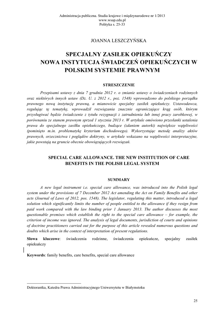 Administracja publiczna. Studia krajowe i międzynarodowe nr 1/2013 www.wsap.edu.pl Polityka s. 25-33 JOANNA LESZCZYŃSKA SPECJALNY ZASIŁEK OPIEKUŃCZY NOWA INSTYTUCJA ŚWIADCZEŃ OPIEKUŃCZYCH W POLSKIM SYSTEMIE PRAWNYM STRESZCZENIE Przepisami ustawy z dnia 7 grudnia 2012 r. o zmianie ustawy o świadczeniach rodzinnych oraz niektórych innych ustaw (Dz. U. z 2012 r., poz. 1548) wprowadzono do polskiego porządku prawnego nową instytucję prawną, a mianowicie specjalny zasiłek opiekuńczy. Ustawodawca, regulując tę tematykę, wprowadził rozwiązania znacznie ograniczające krąg osób, którym przysługiwać będzie świadczenie z tytułu rezygnacji z zatrudnienia lub innej pracy zarobkowej, w porównaniu ze stanem prawnym sprzed 1 stycznia 2013 r. W artykule omówiono przesłanki ustalenia prawa do specjalnego zasiłku opiekuńczego, budzące (zdaniem autorki) największe wątpliwości (pominięto m.in. problematykę kryterium dochodowego). Wykorzystując metodę analizy aktów prawnych, orzecznictwa i poglądów doktryny, w artykule wskazano na wątpliwości interpretacyjne, jakie powstają na gruncie obecnie obowiązujących rozwiązań. SPECIAL CARE ALLOWANCE. THE NEW INSTITUTION OF CARE BENEFITS IN THE POLISH LEGAL SYSTEM SUMMARY A new legal instrument i.e. special care allowance, was introduced into the Polish legal system under the provisions of 7 December 2012 Act amending the Act on Family Benefits and other acts (Journal of Laws of 2012, pos. 1548). The legislator, regulating this matter, introduced a legal solution which significantly limits the number of people entitled to the allowance if they resign from paid work compared with the law binding prior 1 January 2013. The author discusses the most questionable premises which establish the right to the special care allowance – for example, the criterion of income was ignored. The analysis of legal documents, jurisdiction of courts and opinions of doctrine practitioners carried out for the purpose of this article revealed numerous questions and doubts which arise in the context of interpretation of present regulations. Słowa kluczowe: opiekuńczy świadczenia rodzinne, świadczenia opiekuńcze, specjalny zasiłek Keywords: family benefits, care benefits, special care allowance Doktorantka, Katedra Prawa Administracyjnego Uniwersytetu w Białymstoku 25 Administracja publiczna. Studia krajowe i międzynarodowe nr 1/2013 www.wsap.edu.pl Polityka s. 25-33 *** UWAGI OGÓLNE Zasady przyznawania świadczeń opiekuńczych, do których zaliczany jest specjalny zasiłek opiekuńczy, reguluje obecnie ustawa z dnia 28 listopada 2003 r. o świadczeniach rodzinnych (dalej jako: „u.ś.r.”), przepisy Rozporządzenia Ministra Pracy i Polityki Społecznej z dnia 3 stycznia 2013 r. w sprawie sposobu i trybu postępowania w sprawach o świadczenia rodzinne i Rozporządzenia Rady Ministrów z dnia 10 sierpnia 2012 r. w sprawie wysokości dochodu rodziny albo dochodu osoby uczącej się stanowiących podstawę ubiegania się o zasiłek rodzinny oraz wysokości świadczeń rodzinnych. Biorąc pod uwagę treść art. 16a u.ś.r., regulującego instytucję specjalnego zasiłku opiekuńczego, można wskazać następujące przesłanki, których spełnienie warunkuje otrzymanie tego świadczenia: 1. przysługuje on osobom, na których zgodnie z przepisami ustawy z dnia 25 lutego 1964 r. Kodeks rodzinny i opiekuńczy (dalej jako: „k.r.i.o.”) ciąży obowiązek alimentacyjny; 2. osoby te muszą zrezygnować z zatrudnienia lub innej pracy zarobkowej w związku z koniecznością sprawowania stałej opieki; 3. osoba, nad którą sprawowana jest stała opieka, musi legitymować się orzeczeniem o znacznym stopniu niepełnosprawności albo orzeczeniem o niepełnosprawności łącznie ze wskazaniami: konieczności stałej lub długotrwałej opieki lub pomocy innej osoby w związku ze znacznie ograniczoną możliwością samodzielnej egzystencji oraz konieczności stałego współudziału na co dzień opiekuna dziecka w procesie jego leczenia, rehabilitacji i edukacji; 4. łączny dochód rodziny osoby sprawującej opiekę oraz rodziny osoby wymagającej opieki w przeliczeniu na osobę nie przekracza określonej przepisami kwoty; 5. nie występuje żadna z przesłanek negatywnych, określonych w art. 16a ust. 8 u.ś.r., która powodowałaby obowiązek wydania przez organ decyzji odmownej. Takie brzmienie przepisów wskazuje jednoznacznie, że tylko w przypadku łącznego spełnienia warunków w nich określonych, może zostać przyznane prawo do specjalnego zasiłku opiekuńczego, przy jednoczesnym braku występowania okoliczności wskazanych w art. 16a ust. 8 u.ś.r. W niniejszym opracowaniu omówione zostaną wymienione w punktach 1-3 przesłanki, które, zdaniem autorki opracowania, budzą największe wątpliwości. Nie przechodząc jeszcze do szczegółowej analizy obecnych uregulowań, uzasadnionym jest poczynienie już pierwszej uwagi. Mianowicie w przeciwieństwie do stanu prawnego obowiązującego do 31 grudnia 2012 r., ustawodawca obecnie przewidział dwa odmienne świadczenia, przysługujące osobie rezygnującej z zatrudnienia lub innej pracy zarobkowej w związku z koniecznością sprawowania stałej opieki nad osobą legitymującą się orzeczeniem o niepełnosprawności, których przyznanie uzależnione jest od wieku, w którym powstała niepełnosprawność osoby wymagającej opieki. Świadczenie pielęgnacyjne [na temat ewolucji regulacji prawnych związanych z tym świadczeniem zob. Pułło, 2012, passim] będzie obecnie przysługiwać, jeśli niepełnosprawność osoby wymagającej opieki powstała nie później niż do ukończenia 18 roku życia lub w trakcie nauki w szkole lub w szkole wyższej, jednak nie później niż do ukończenia 25 roku życia (obecne brzmienie przepisów zdaje się wskazywać, ze w przypadku takiej osoby niepełnosprawnej, będzie można przyznać ewentualnie specjalny zasiłek opiekuńczy - kwestia ta 