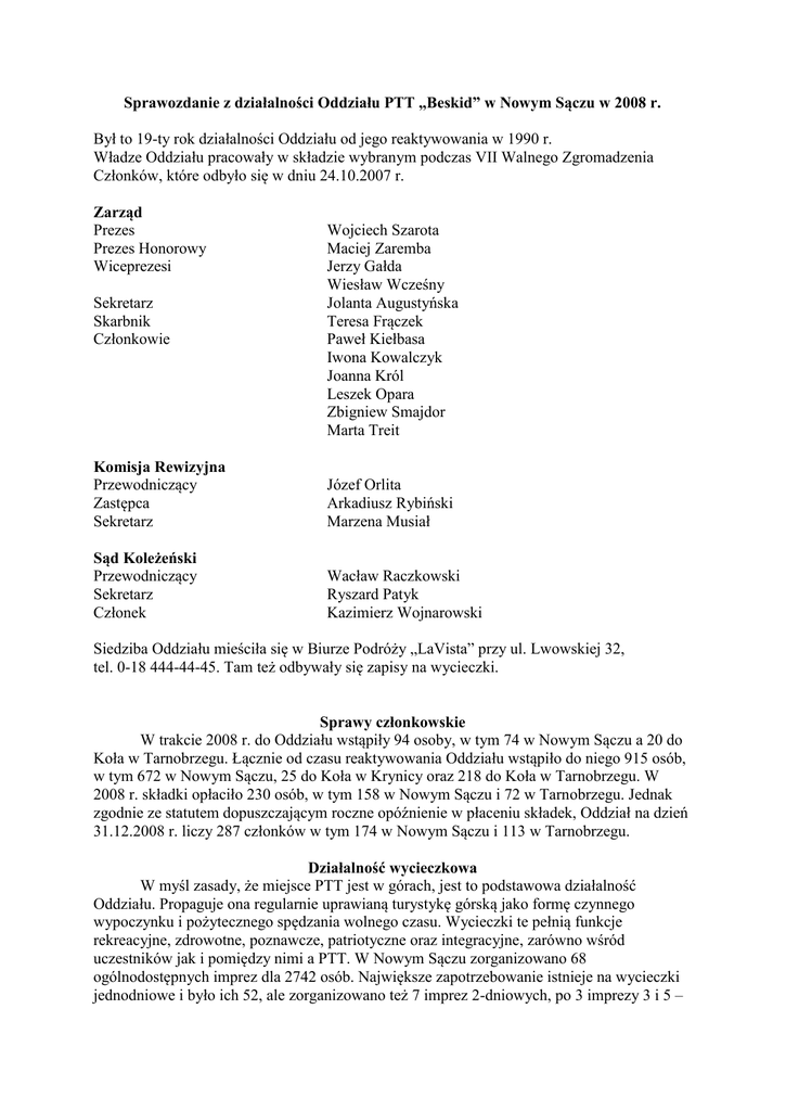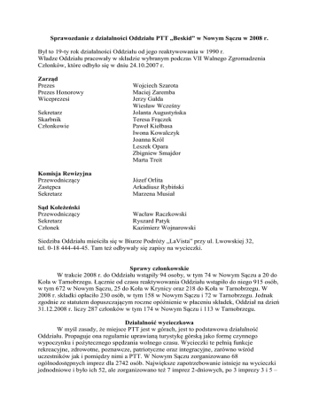 Sprawozdanie z działalności Oddziału PTT „Beskid” w Nowym Sączu w 2008 r. Był to 19-ty rok działalności Oddziału od jego reaktywowania w 1990 r. Władze Oddziału pracowały w składzie wybranym podczas VII Walnego Zgromadzenia Członków, które odbyło się w dniu 24.10.2007 r. Zarząd Prezes Prezes Honorowy Wiceprezesi Sekretarz Skarbnik Członkowie Wojciech Szarota Maciej Zaremba Jerzy Gałda Wiesław Wcześny Jolanta Augustyńska Teresa Frączek Paweł Kiełbasa Iwona Kowalczyk Joanna Król Leszek Opara Zbigniew Smajdor Marta Treit Komisja Rewizyjna Przewodniczący Zastępca Sekretarz Józef Orlita Arkadiusz Rybiński Marzena Musiał Sąd Koleżeński Przewodniczący Sekretarz Członek Wacław Raczkowski Ryszard Patyk Kazimierz Wojnarowski Siedziba Oddziału mieściła się w Biurze Podróży „LaVista” przy ul. Lwowskiej 32, tel. 0-18 444-44-45. Tam też odbywały się zapisy na wycieczki. Sprawy członkowskie W trakcie 2008 r. do Oddziału wstąpiły 94 osoby, w tym 74 w Nowym Sączu a 20 do Koła w Tarnobrzegu. Łącznie od czasu reaktywowania Oddziału wstąpiło do niego 915 osób, w tym 672 w Nowym Sączu, 25 do Koła w Krynicy oraz 218 do Koła w Tarnobrzegu. W 2008 r. składki opłaciło 230 osób, w tym 158 w Nowym Sączu i 72 w Tarnobrzegu. Jednak zgodnie ze statutem dopuszczającym roczne opóźnienie w płaceniu składek, Oddział na dzień 31.12.2008 r. liczy 287 członków w tym 174 w Nowym Sączu i 113 w Tarnobrzegu. Działalność wycieczkowa W myśl zasady, że miejsce PTT jest w górach, jest to podstawowa działalność Oddziału. Propaguje ona regularnie uprawianą turystykę górską jako formę czynnego wypoczynku i pożytecznego spędzania wolnego czasu. Wycieczki te pełnią funkcje rekreacyjne, zdrowotne, poznawcze, patriotyczne oraz integracyjne, zarówno wśród uczestników jak i pomiędzy nimi a PTT. W Nowym Sączu zorganizowano 68 ogólnodostępnych imprez dla 2742 osób. Największe zapotrzebowanie istnieje na wycieczki jednodniowe i było ich 52, ale zorganizowano też 7 imprez 2-dniowych, po 3 imprezy 3 i 5 – dniowe, 2 wyprawy 6- dniowe i jedną 17 – dniowa. Najczęściej wędrowano po Beskidzie Sądeckim bo 11 razy. Odwiedzano też pozostałe pasma górskie jak Beskid Niski 6 –razy, Pogórza i Tatry - po 5 razy, Pieniny – 4 razy, Beskid Wyspowy i Bieszczady – po 3 razy, Beskid Żywiecki – 2 razy a Beskid Mały, Jurę, Gorce i Beskid Śląski – po 1 razie. Odbyły się też wycieczki poza granice kraju. Najwięcej, bo 9 razy w słowackie Tatry oraz 9 razy w inne słowackie góry. Czechy to 4 wyjazdy, a Chorwację, Rumunię i Włochy odwiedzano po jednym razie. Dojazd go gór odbywał się głównie autokarami turystycznymi a częściowo środkami lokomocji publicznej. Dla uatrakcyjnienia imprez, podczas części z nich odbywały się ogniska z pieczeniem kiełbasy. Wiele imprez, to tradycyjnie znajdujące się kalendarzu Oddziału: - po raz 19- ty odbyło się przejście historycznej trasy z Piwnicznej przez Radziejową do Rytra, szlakiem pierwszej wycieczki nowosądeckiego „Beskidu” w 1906 r. - z okazji Dnia Dziecka odbyła się wycieczka do stadniny koni huculskich w Regietowie, - z cyklu „Nocne wędrowanie” oglądano w czerwcu wschód słońca na Babiej Górze, a była to szósta wycieczka z tego cyklu, - w październiku odbyła się po raz piąty wyprawa Szlakiem Winnym, tym razem do Chorwacji, - z okazji Święta Niepodległości zorganizowano w listopadzie wycieczkę Szlakiem Legionów po cmentarzach z I wojny światowej, - wzięto udział w XX Noworocznej Mszy Świętej Ludzi Gór na Jaworzynie, - w marcu Oddział uczestniczył w IX Wielkopiątkowej Drodze do Krzyża na Mogielicę, organizowanej przez Oddział PTT w Mielcu, - wzięto udział w góralskiej pasterce na Wiktorówkach w Tatrach, - symboliczne zakończenie sezonu miało w tym roku miejsce na Cyrli. Najatrakcyjniejszą imprezą była lipcowa wyprawa „Szlakiem wulkanów i antyku”, gdzie poza programem górskim w Dolomitach i Apeninach, zwiedzano również włoskie antyczne zabytki. Zdobyto m. in. Civettę (3220 m) oraz wulkany: Etnę, Stramboli i Wezuwiusz. Jedna z uczestniczek zimowego wejścia na Babią Górę w dniu 7 grudnia, była 40 000ną osobą biorącą udział w wycieczkach naszego Oddziału od 1990 r. Kolejny rok kontynuowana była współpraca z Sądeckim Uniwersytetem Trzeciego Wieku. Odbyły się 3 niedzielne wycieczki, które zorganizował Wiesław Wcześny. Wzięło w nich udział 108 słuchaczy. W październiku odbył się w Beskidzie Sądeckim II Rajd Uniwersytetów Trzeciego Wieku, który obsługiwali nasi przewodnicy. Afisze informujące o imprezach organizowanych przez Oddział umieszczane były w gablotach, na tablicach i witrynach w 11 punktach miasta. W związku z dotacją otrzymaną z Urzędu Miasta, uczestnicy imprez pokrywali tylko część kosztów wynajmu autokarów. Dzięki temu wycieczki były bardziej dostępne dla ich uczestników, co miało szczególne znaczenie dla kilkuosobowych rodzin, młodzieży szkolnej oraz emerytów. Imprezy były prowadzone społecznie przez 16 przewodników. Najwięcej, bo po 23 wycieczki prowadzili Ryszard Patyk i Wojciech Szarota, pozostali to Robert Cempa – 7, Leszek Małota, Wiesław Wcześny i Maciej Zaremba - po 5, Łukasz Musiał i Marta Treit – po 4, Jerzy Gałda i Władysław Kowalczyk – po 3, Aleksander Jarek i Paweł Kiełbasa – po 2 oraz Adam Bossy, Iwona Kowalczyk, Antoni Piotrowski i Zbigniew Smajdor – po 1. Górska Odznaka Turystyczna PTT Propagowano akcję zdobywania GOT PTT oraz odznaki młodzieżowej „Ku Wierchom”. Komisja Oddziałowa GOT PTT przyznała 7 odznak GOT różnych stopni, w tym 5 „małych” brązowych, 1 „małą” srebrną i 1 „dużą” złotą oraz 6 odznak młodzieżowych GOT PTT „Ku Wierchom”. W sumie od reaktywowania GOT PTT w 1994 r. w Oddziale zdobyto 351 odznak różnych stopni. Koło Przewodników Początkowo władze Ko