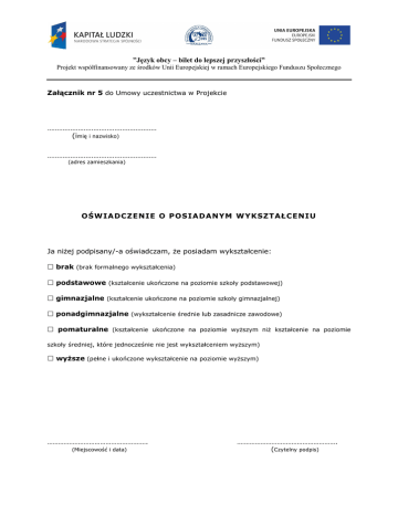 ”Język obcy – bilet do lepszej przyszłości” Projekt współfinansowany ze środków Unii Europejskiej w ramach Europejskiego Funduszu Społecznego Załącznik nr 5 do Umowy uczestnictwa w Projekcie ………………………………………………… (imię i nazwisko) ………………………………………………… (adres zamieszkania) OŚWIADCZENIE O POSIADANYM WYKSZTAŁCENIU Ja niżej podpisany/-a oświadczam, że posiadam wykształcenie: brak (brak formalnego wykształcenia) podstawowe (kształcenie ukończone na poziomie szkoły podstawowej) gimnazjalne (kształcenie ukończone na poziomie szkoły gimnazjalnej) ponadgimnazjalne (wykształcenie średnie lub zasadnicze zawodowe) pomaturalne (kształcenie ukończone na poziomie wyższym niż kształcenie na poziomie szkoły średniej, które jednocześnie nie jest wykształceniem wyższym) wyższe (pełne i ukończone wykształcenie na poziomie wyższym) ………………………………………………. (Miejscowość i data) ………………………………………………. (Czytelny podpis)